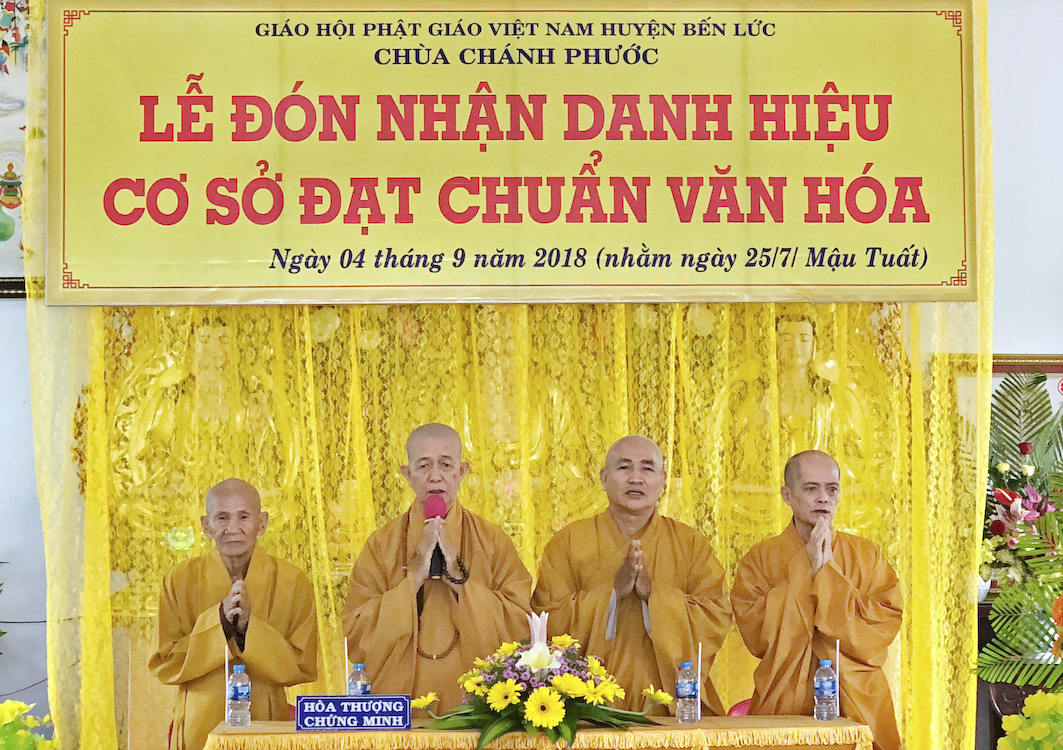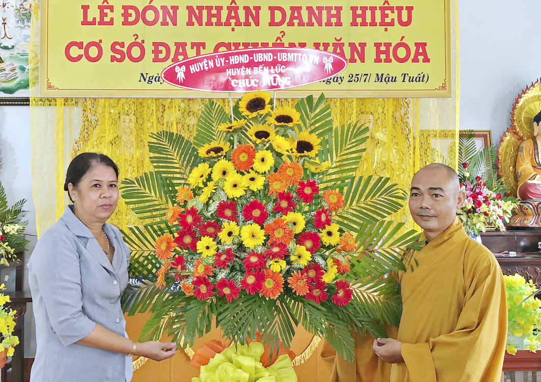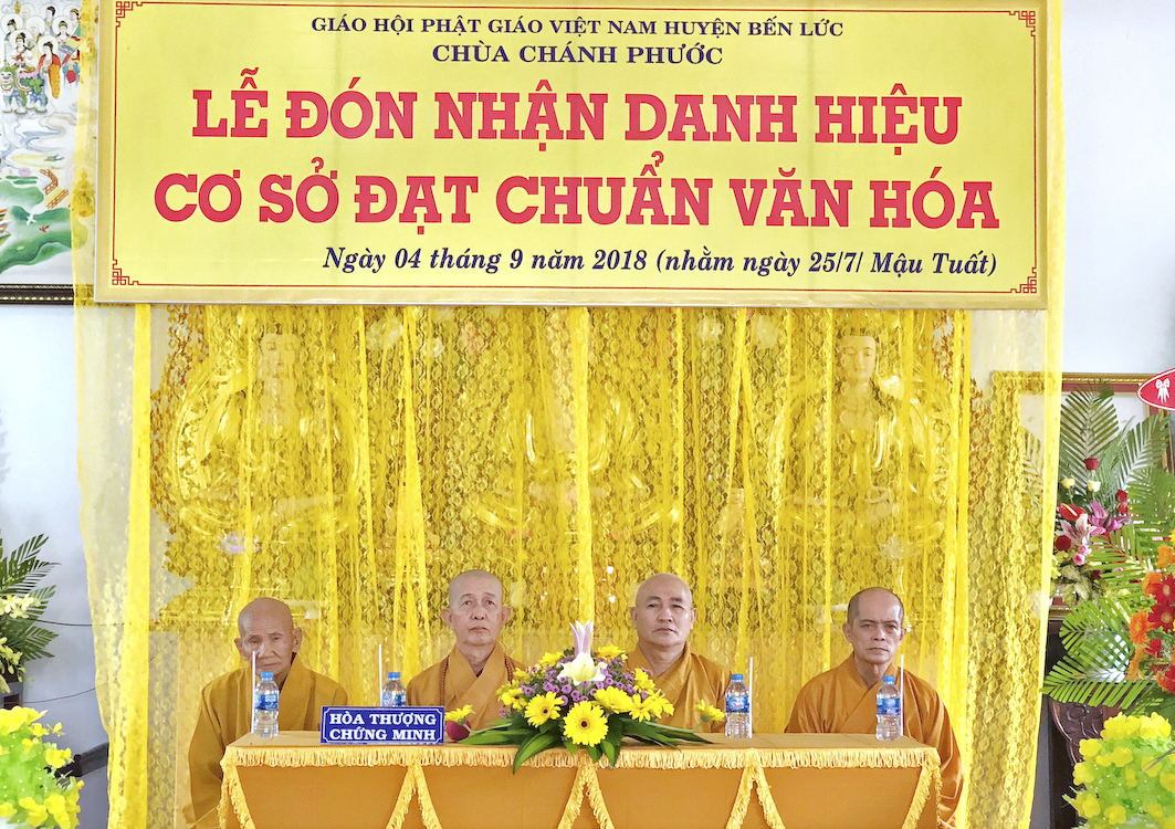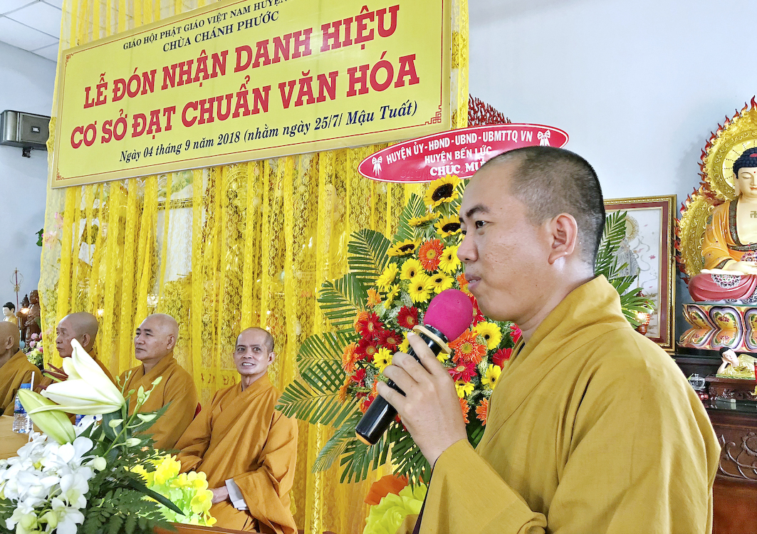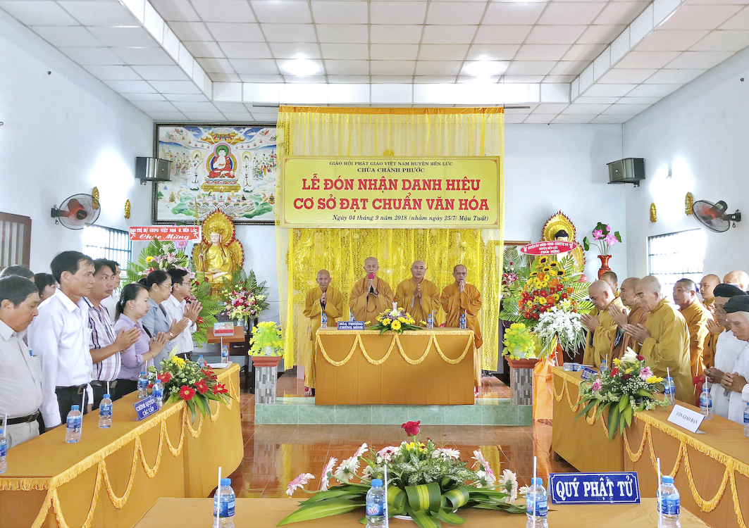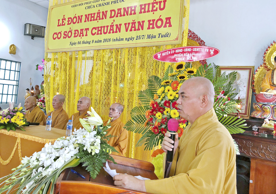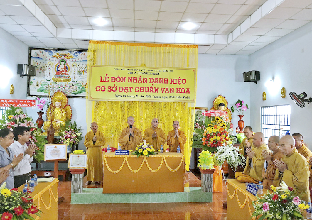 Trong buổi lễ hôm nay, Đại đức Thích Tắc Nhiên, trụ trì chùa Chánh Phước đã vinh dự đón nhận Bằng công nhận, cơ sở thờ tự đạt chuẩn văn hóa và hoa chúc mừng từ lãnh đạo chính quyền Huyện Bến Lức trao tặng.