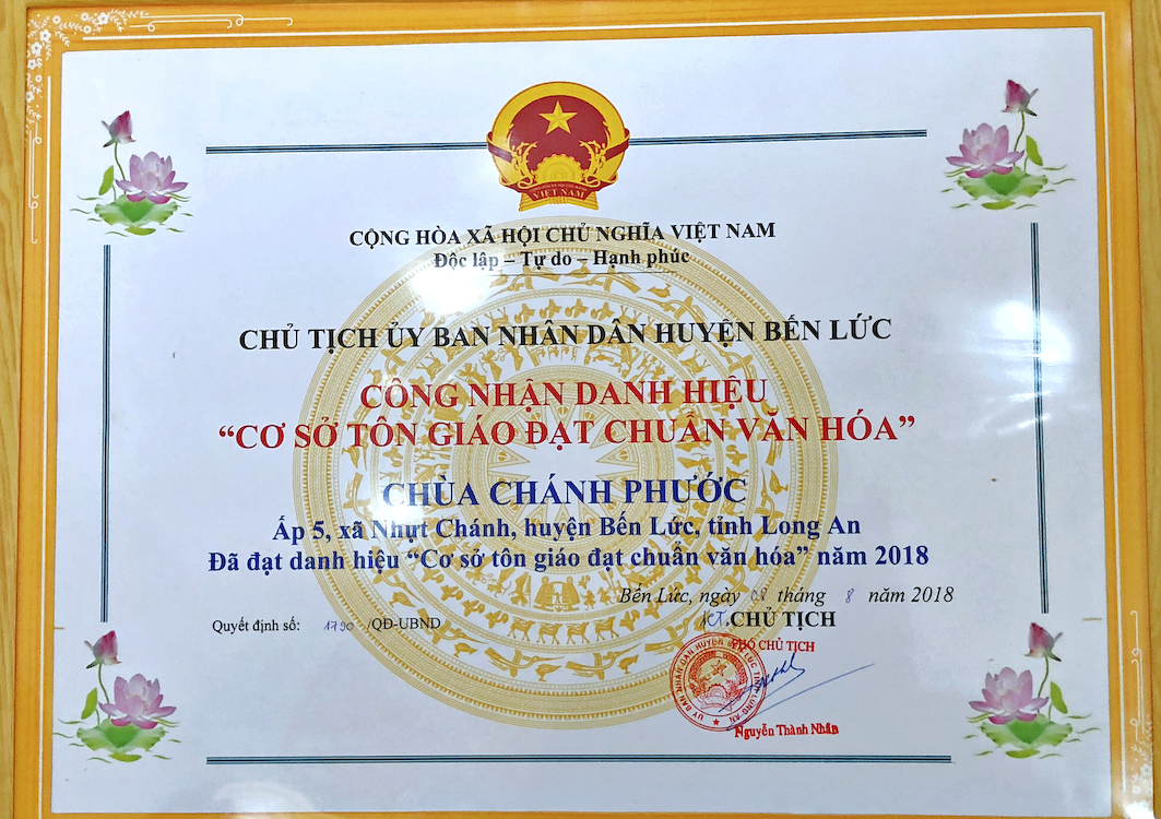Bến Lức : Chùa Chánh Phước xã Nhựt Chánh Đón Nhận Bằng Cơ Sở Thờ Tự Văn Hóa