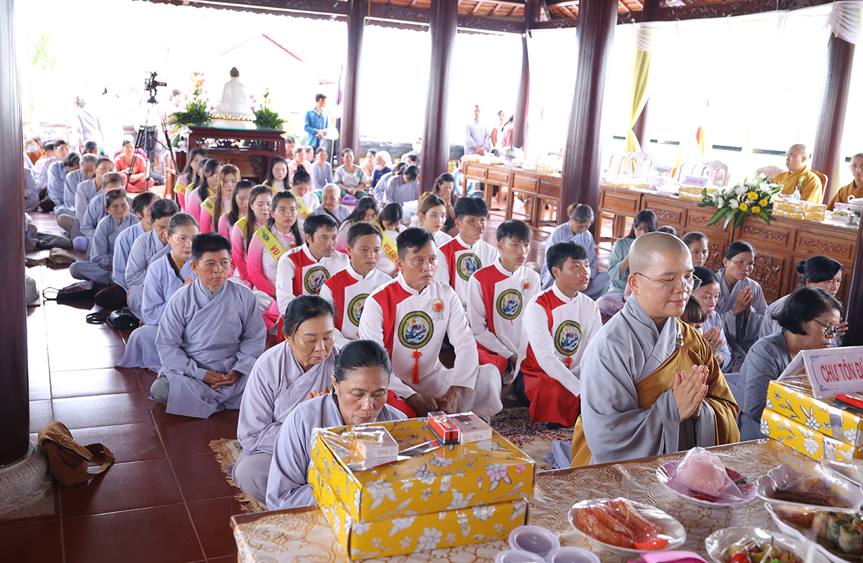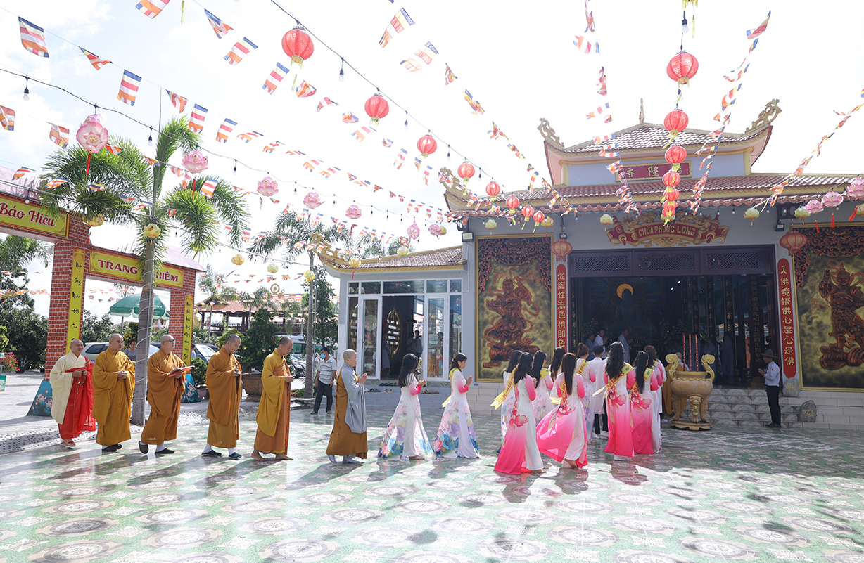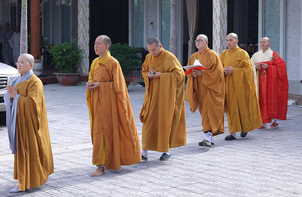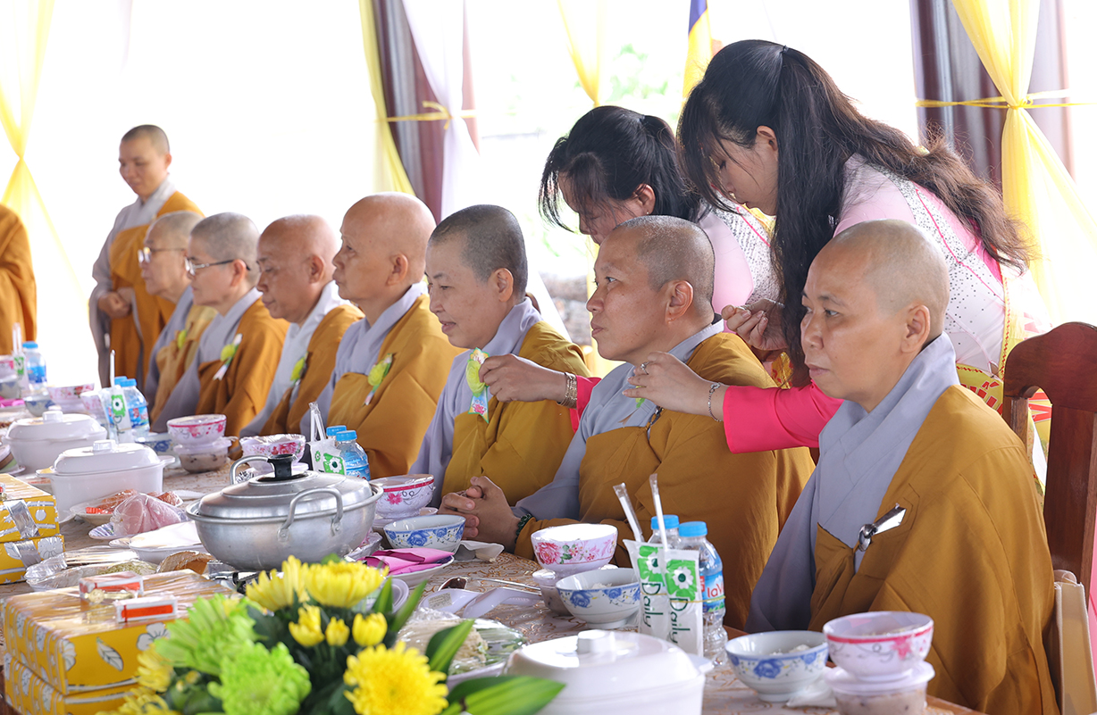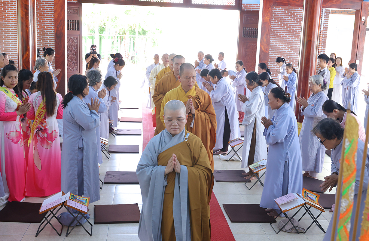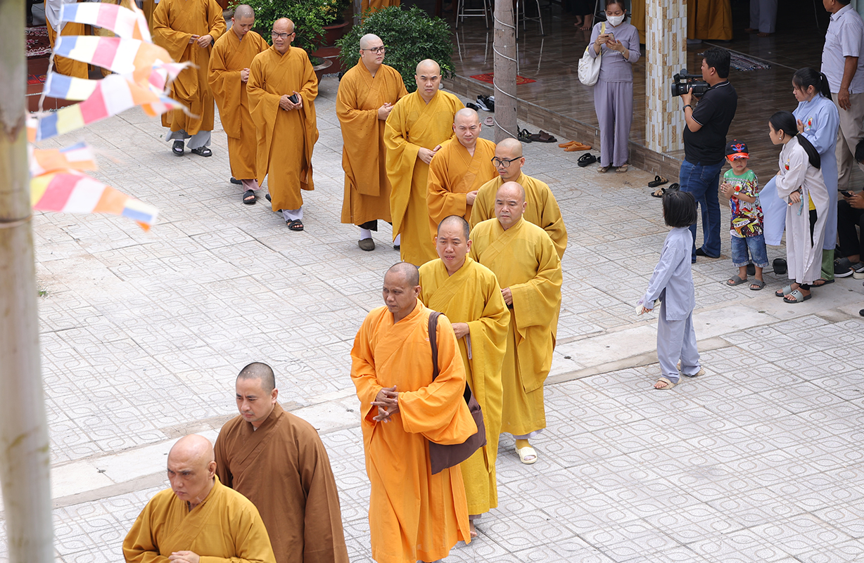 Tiếp đó, Ban nghi lễ đã cung nghinh chư Tôn đức Giáo phẩm, Thường trực BTS GHPGVN tỉnh Long An: HT. Thích Thiện Tài- Chứng minh BTS GHPGVN tỉnh Long An; HT. Thích Minh Thiện- Ủy viên HĐTSTƯ, Phó Ban Hoằng pháp trung ương, Trưởng BTS GHPGVN tỉnh Long An; HT. Thích Tắc Phi- Phó Ban Trị sự kiêm Trưởng Ban Kiểm soát BTS GHPGVN tỉnh Long An; TT. Thích Lệ Trí- Ủy viên HĐTSTƯ, Phó Ban Văn hóa trung ương, Phó Trưởng BTS GHPGVN tỉnh Long An; ĐĐ Thích Lệ Ngôn- Phó ban Trị sự kiêm Trưởng Ban Hoằng pháp BTS GHPGVN tỉnh Long An cùng chư Tôn đức Thường trực BTS Phật giáo huyện Bến Lức, huyện Châu Thành, huyện Tân Trụ; chư Tôn đức Tăng Ni trụ trì các tự viện v.v., đồng tham dự chứng minh nơi trai đường.