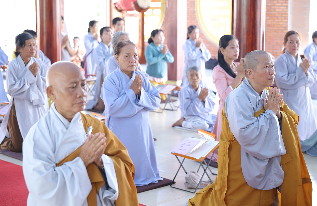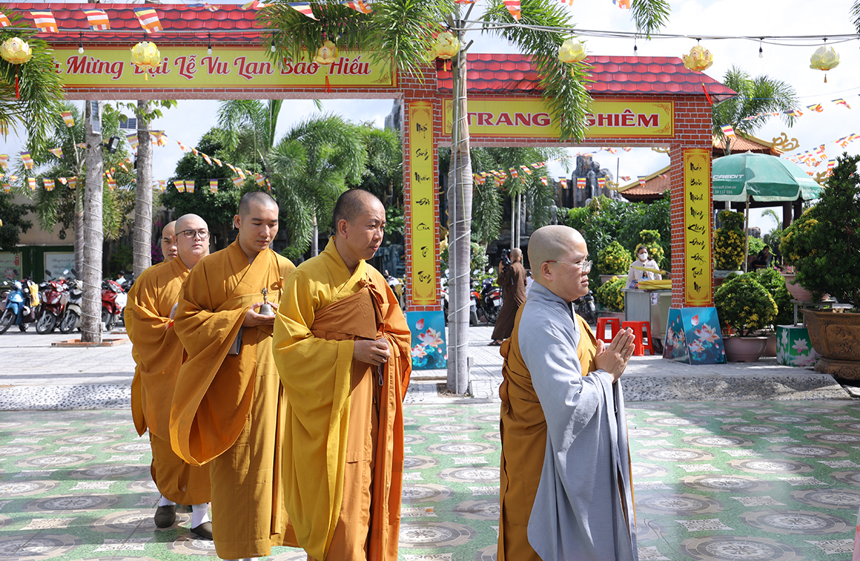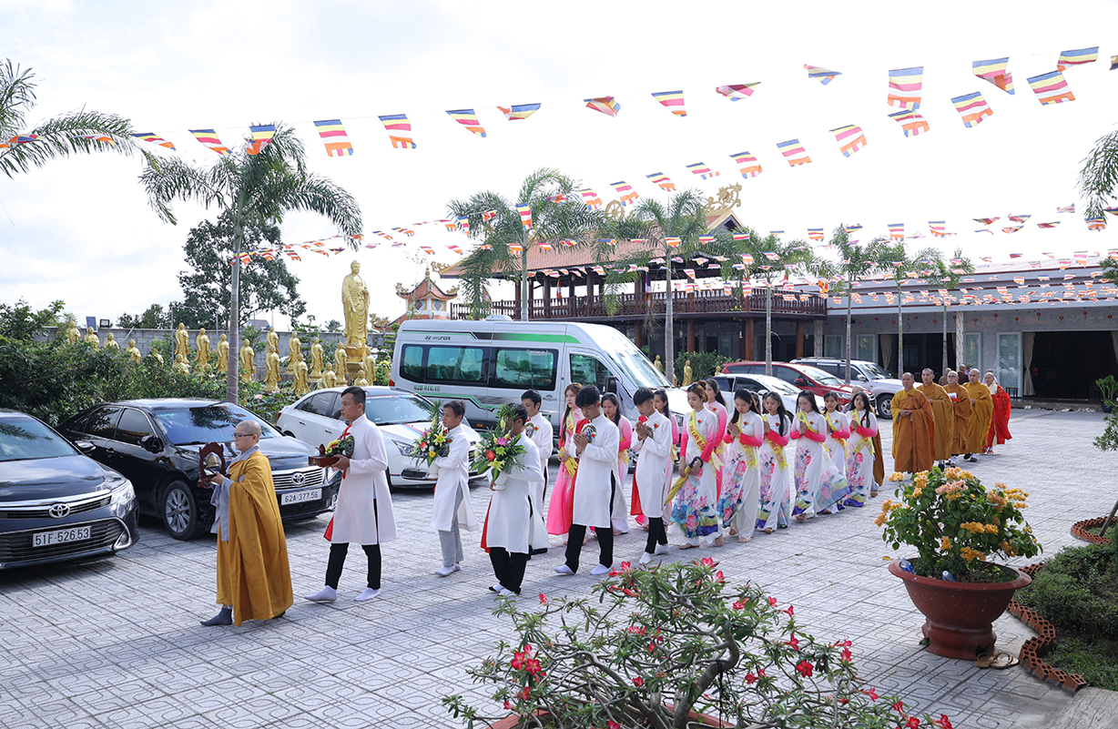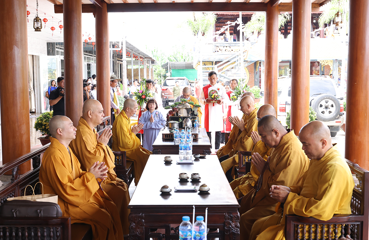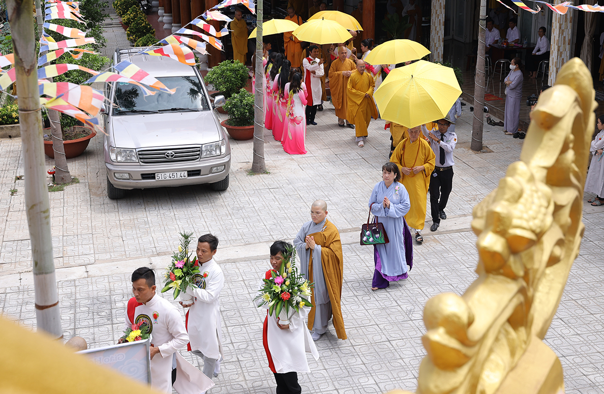Tiếp đó, Ban nghi lễ đã cung nghinh chư Tôn đức Giáo phẩm, Thường trực BTS GHPGVN tỉnh Long An: HT. Thích Thiện Tài- Chứng minh BTS GHPGVN tỉnh Long An; HT. Thích Minh Thiện- Ủy viên HĐTSTƯ, Phó Ban Hoằng pháp trung ương, Trưởng BTS GHPGVN tỉnh Long An; HT. Thích Tắc Phi- Phó Ban Trị sự kiêm Trưởng Ban Kiểm soát BTS GHPGVN tỉnh Long An; TT. Thích Lệ Trí- Ủy viên HĐTSTƯ, Phó Ban Văn hóa trung ương, Phó Trưởng BTS GHPGVN tỉnh Long An; ĐĐ Thích Lệ Ngôn- Phó ban Trị sự kiêm Trưởng Ban Hoằng pháp BTS GHPGVN tỉnh Long An cùng chư Tôn đức Thường trực BTS Phật giáo huyện Bến Lức, huyện Châu Thành, huyện Tân Trụ; chư Tôn đức Tăng Ni trụ trì các tự viện v.v., đồng tham dự chứng minh nơi trai đường.