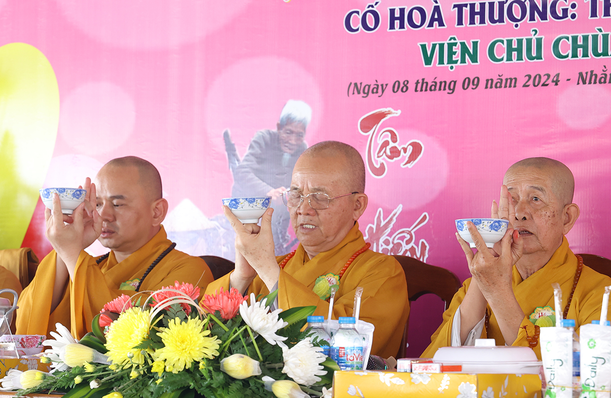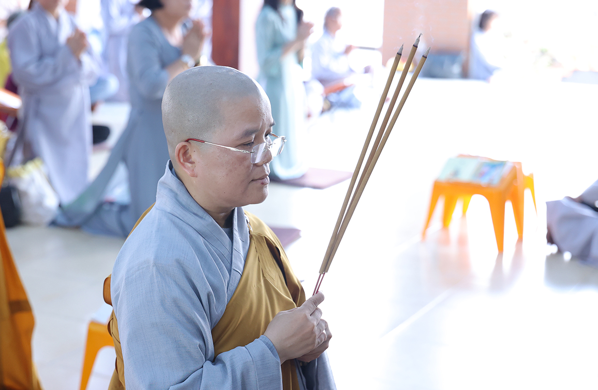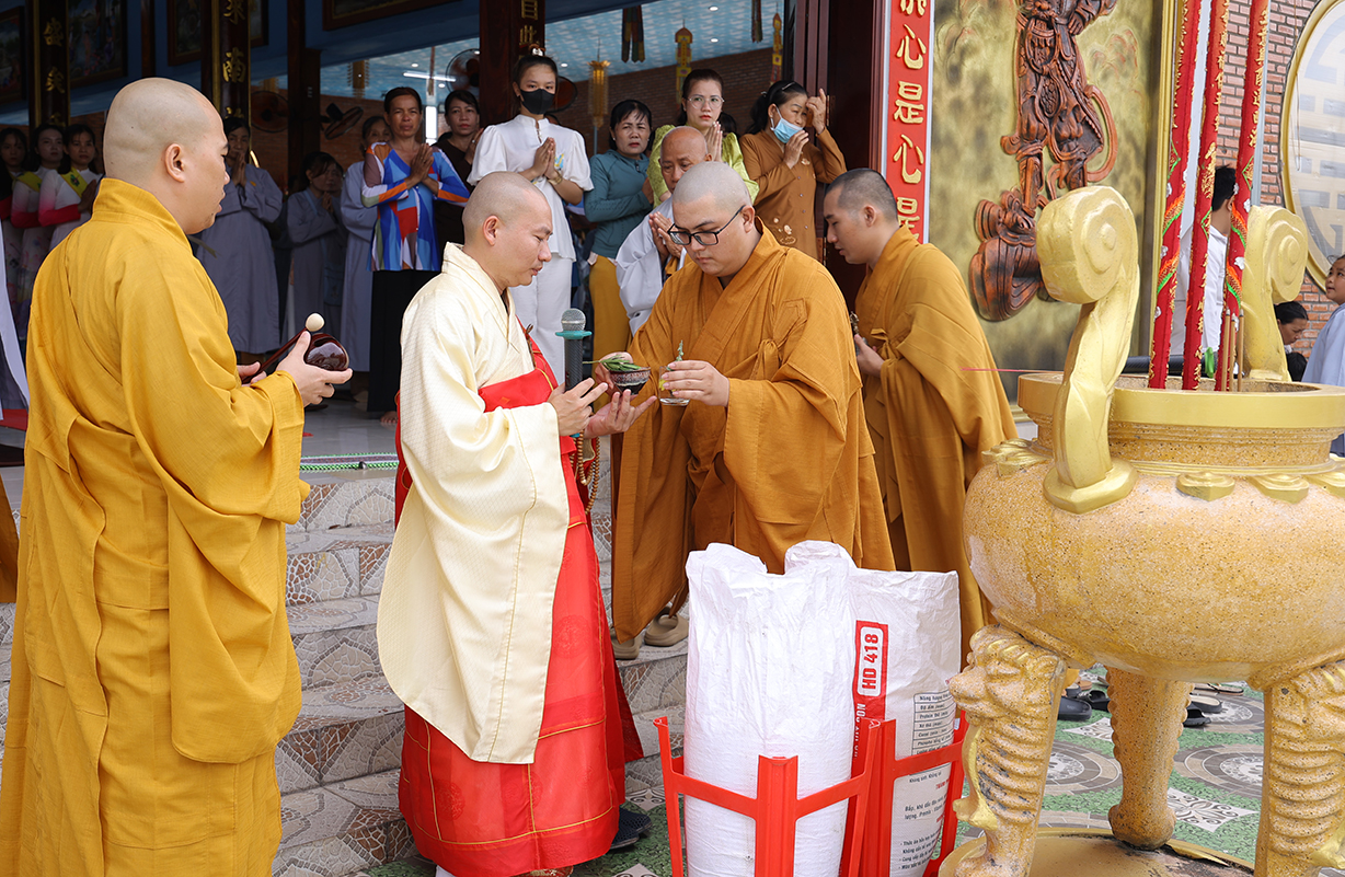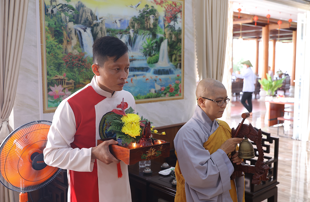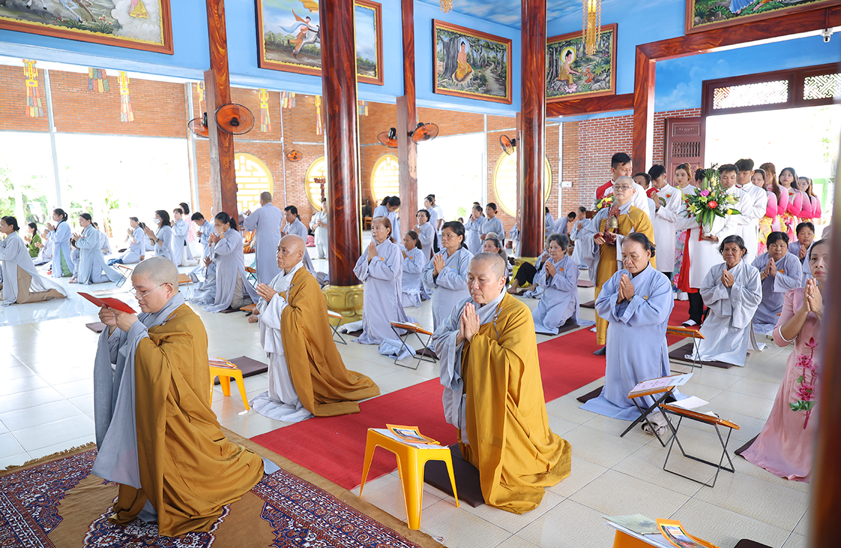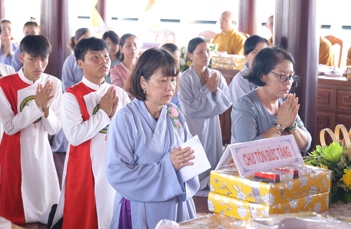 Tiếp đó, Ban nghi lễ đã cung nghinh chư Tôn đức Giáo phẩm, Thường trực BTS GHPGVN tỉnh Long An: HT. Thích Thiện Tài- Chứng minh BTS GHPGVN tỉnh Long An; HT. Thích Minh Thiện- Ủy viên HĐTSTƯ, Phó Ban Hoằng pháp trung ương, Trưởng BTS GHPGVN tỉnh Long An; HT. Thích Tắc Phi- Phó Ban Trị sự kiêm Trưởng Ban Kiểm soát BTS GHPGVN tỉnh Long An; TT. Thích Lệ Trí- Ủy viên HĐTSTƯ, Phó Ban Văn hóa trung ương, Phó Trưởng BTS GHPGVN tỉnh Long An; ĐĐ Thích Lệ Ngôn- Phó ban Trị sự kiêm Trưởng Ban Hoằng pháp BTS GHPGVN tỉnh Long An cùng chư Tôn đức Thường trực BTS Phật giáo huyện Bến Lức, huyện Châu Thành, huyện Tân Trụ; chư Tôn đức Tăng Ni trụ trì các tự viện v.v., đồng tham dự chứng minh nơi trai đường.