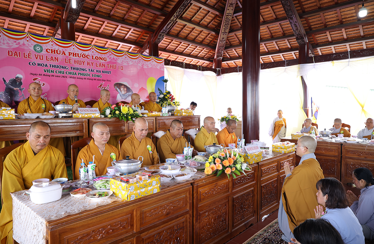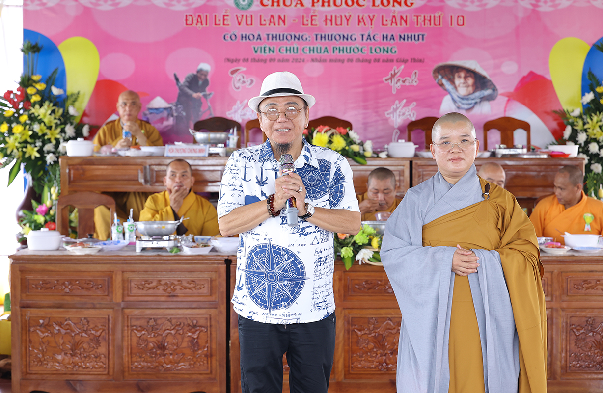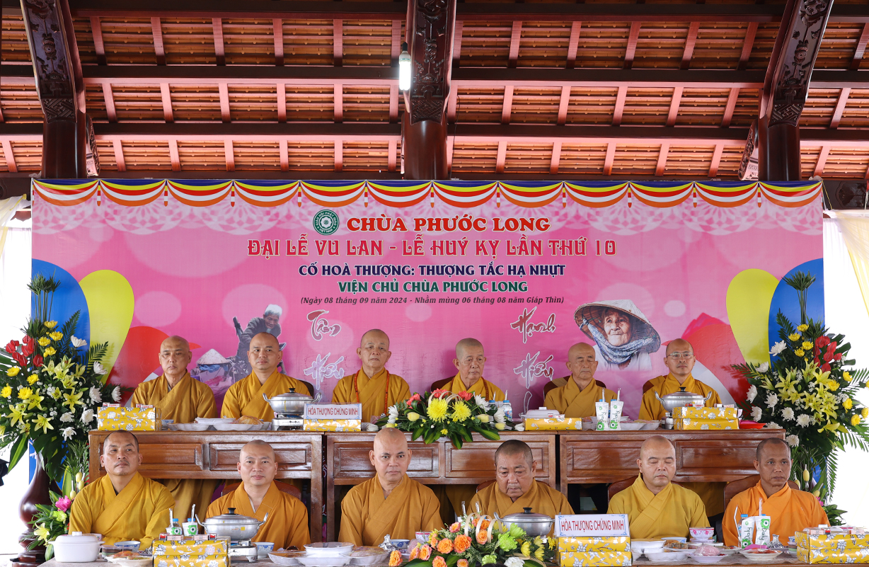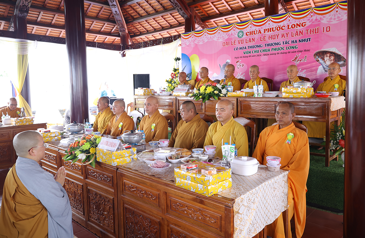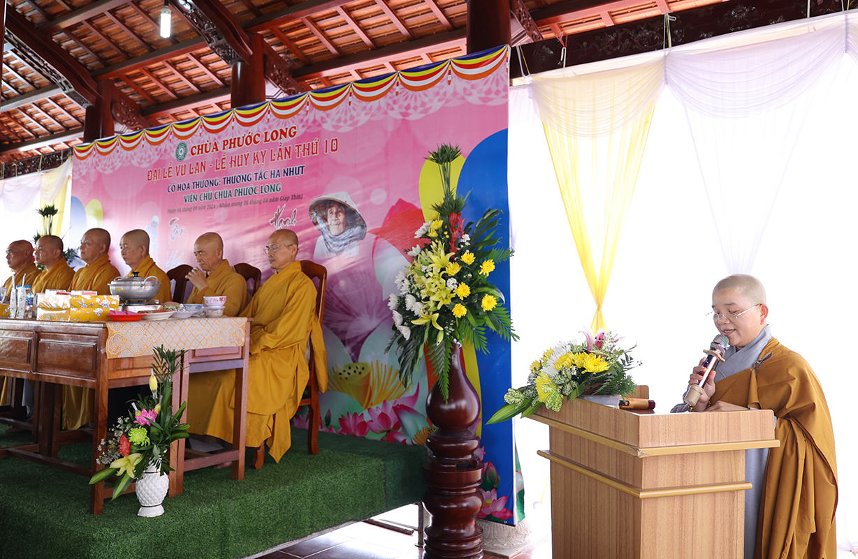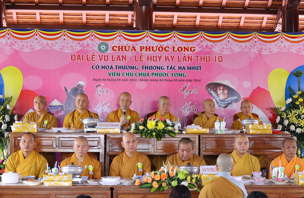 Trong giây phút hoài cảm ấy, Hòa thượng Thích Minh Thiện ân cần ban đạo từ chứng minh. Ngài tán thán các việc làm thể hiện hiếu hạnh của người con Phật tại đạo tràng Phước Long. Dù biết rằng tổ chức buổi lễ đã qua mùa Vu Lan tháng 7, nhưng Sư Cô trụ trì vì hướng vọng ân đức trùng tu Tam Bảo của Tổ Thầy, nên nhân ngày Húy Kỵ kết hợp tổ chức Vu Lan, tạo cơ hội cho Phật tử xa gần trở về cùng thực thi Hiếu nghĩa với đấng sanh thành. Đây là một việc làm đậm nét nhân văn cần được duy trì và phát triển. Bởi lẽ, con người biết hiếu thuận thì nhà nhà được hạnh phúc ấm no, xã hội bình yên. Hòa thượng nhấn mạnh, mảnh đất Long An hiện tại được an bình cũng có sự góp phần của những tấm lòng hiếu thảo, biết yêu thương và chia sẻ, biết trân trọng những thành quả của người đi trước. Hòa thượng cũng mong rằng những người hiện diện hôm nay, hãy luôn trân trọng và giữ lấy hạnh phúc khi còn được ở bên Cha Mẹ; hãy làm tấm gương tốt đẹp cho con cháu noi theo. Hạnh hiếu làm nên nét đẹp tự thân của mỗi người, đồng thời lan tỏa năng lượng lành đến khắp gần xa.