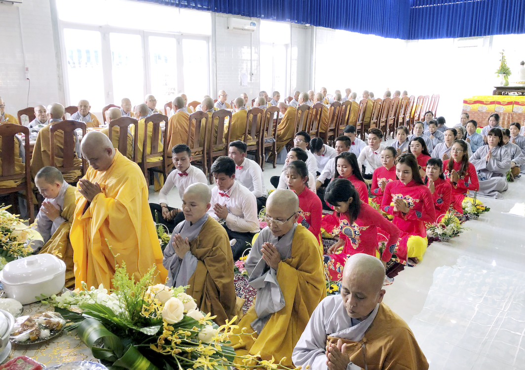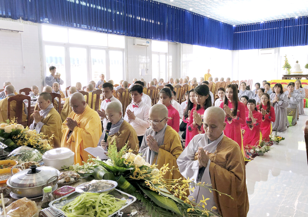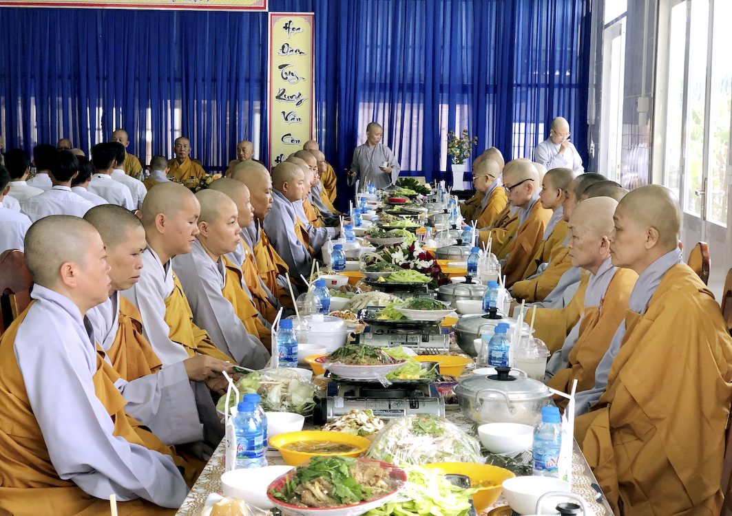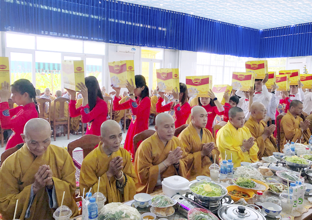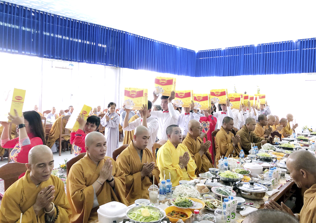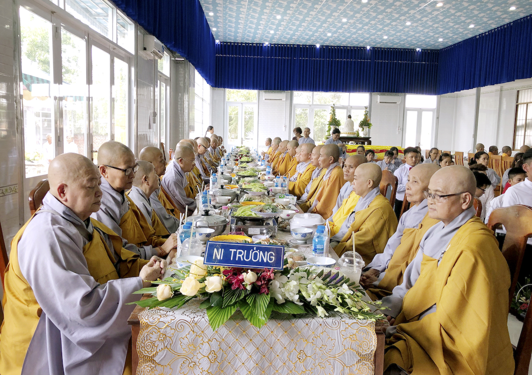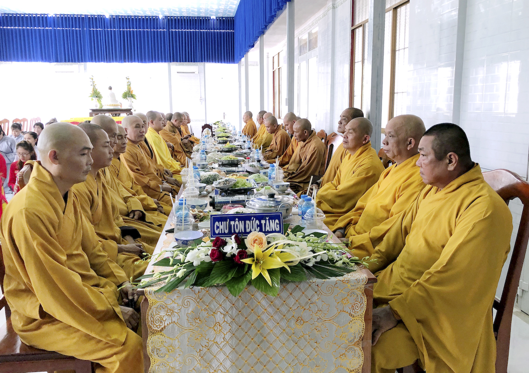 Đến 11 giờ, Ban nghi lễ và môn nhân pháp quyến bạch thỉnh chư Tôn Hòa thượng: HT. Thích Minh Thiện – UVHĐTS- Phó Trưởng Ban Hoằng pháp TW, Trưởng Ban Trị sự GHPGVN tỉnh Long An; HT. Thích Thiện Tâm – Phó Trưởng Ban Trị sự kiêm Trưởng Ban Kiểm soát GHPGVN tỉnh Long An; HT. Thích Thiện Tài – Phó Trưởng Ban Trị sự kiêm Trưởng Ban Nghi lễ GHPGVN tỉnh Long An; HT. Thích Tắc Phi; HT. Thích Tắc Nhàn; Thượng tọa Thích Tắc Quảng, Đại đức Thích An Trung – Trưởng Ban Trị sự GHPGVN huyện Bến Lức vv., và 100 chư Tăng Ni đồng quang lâm trai đường.