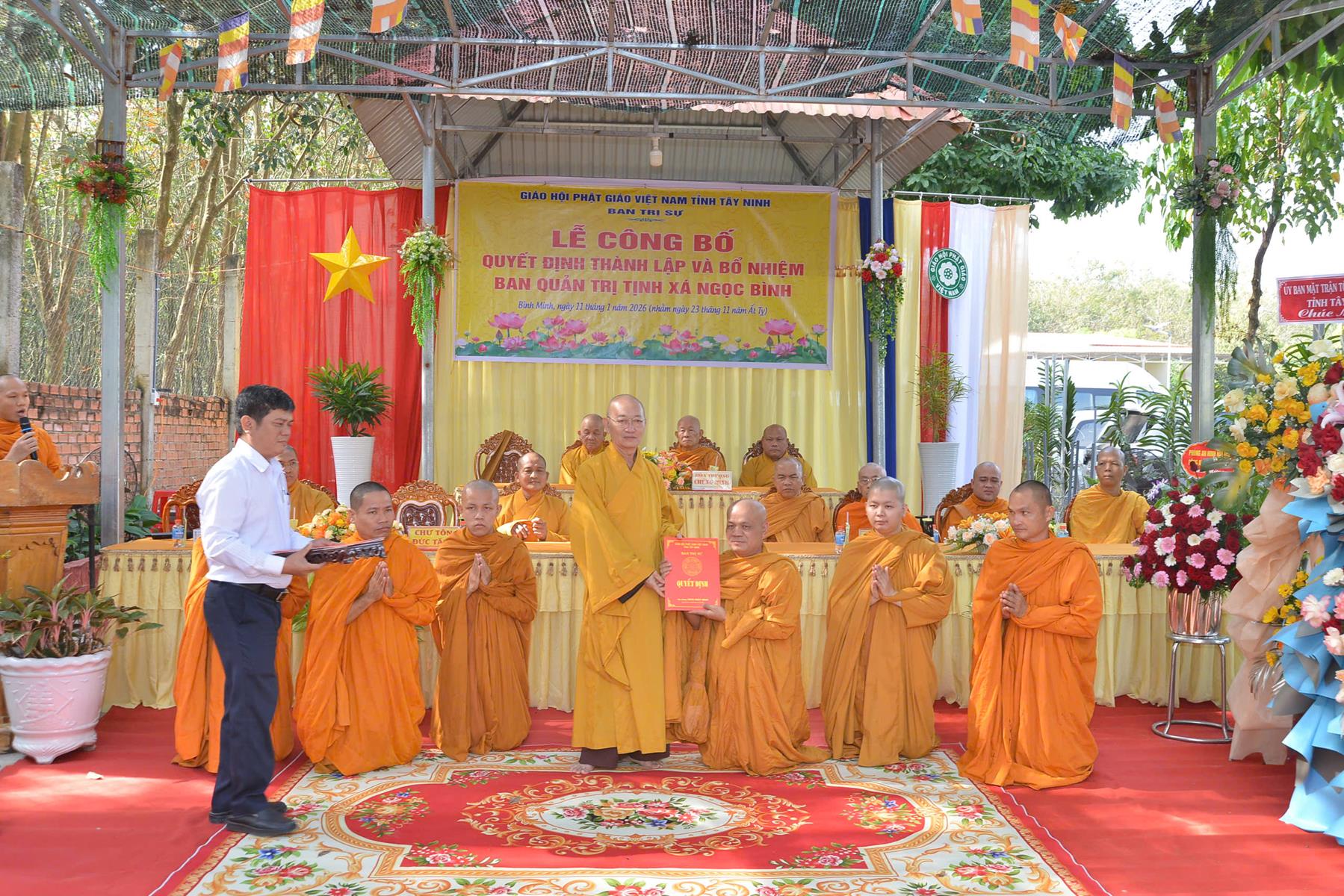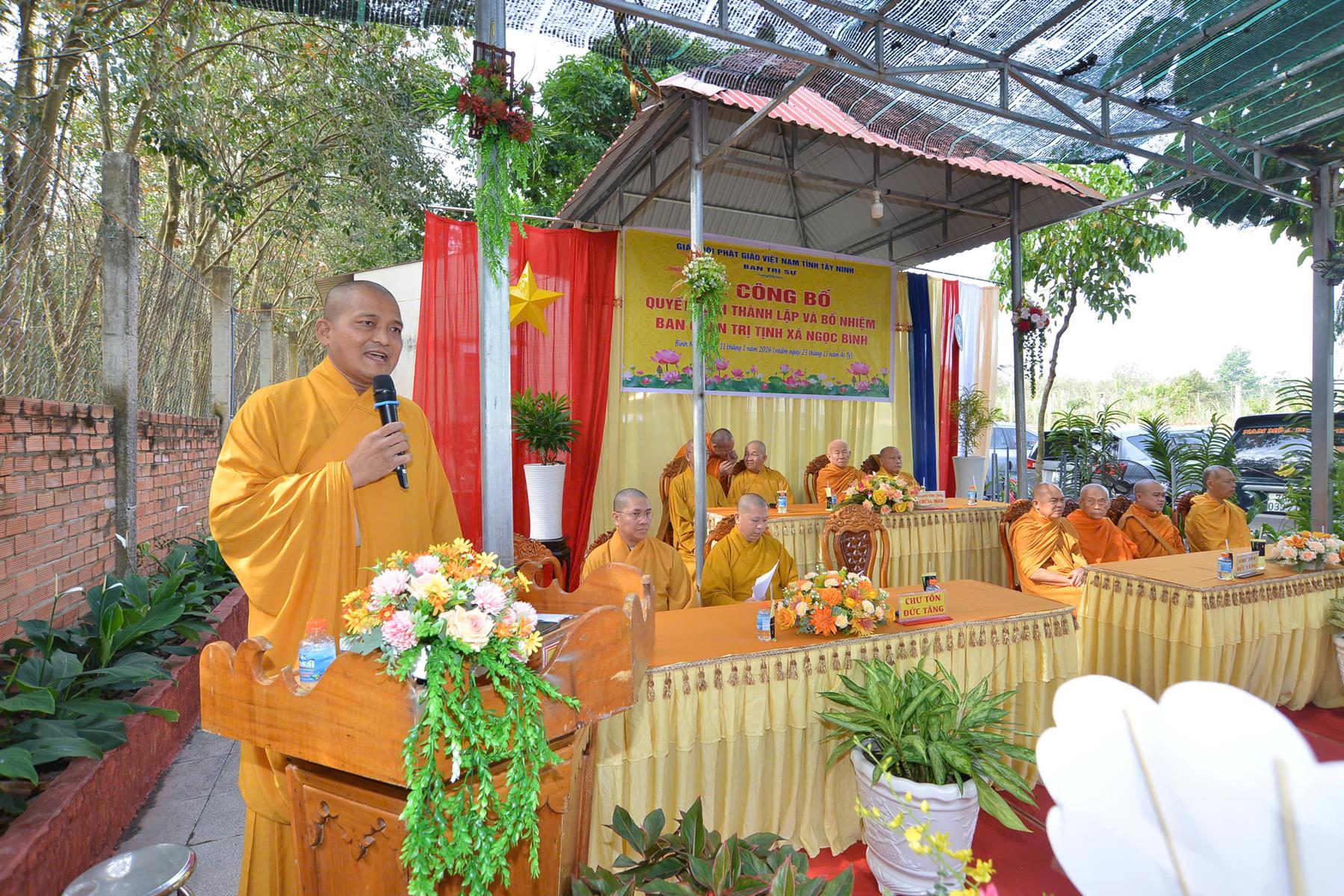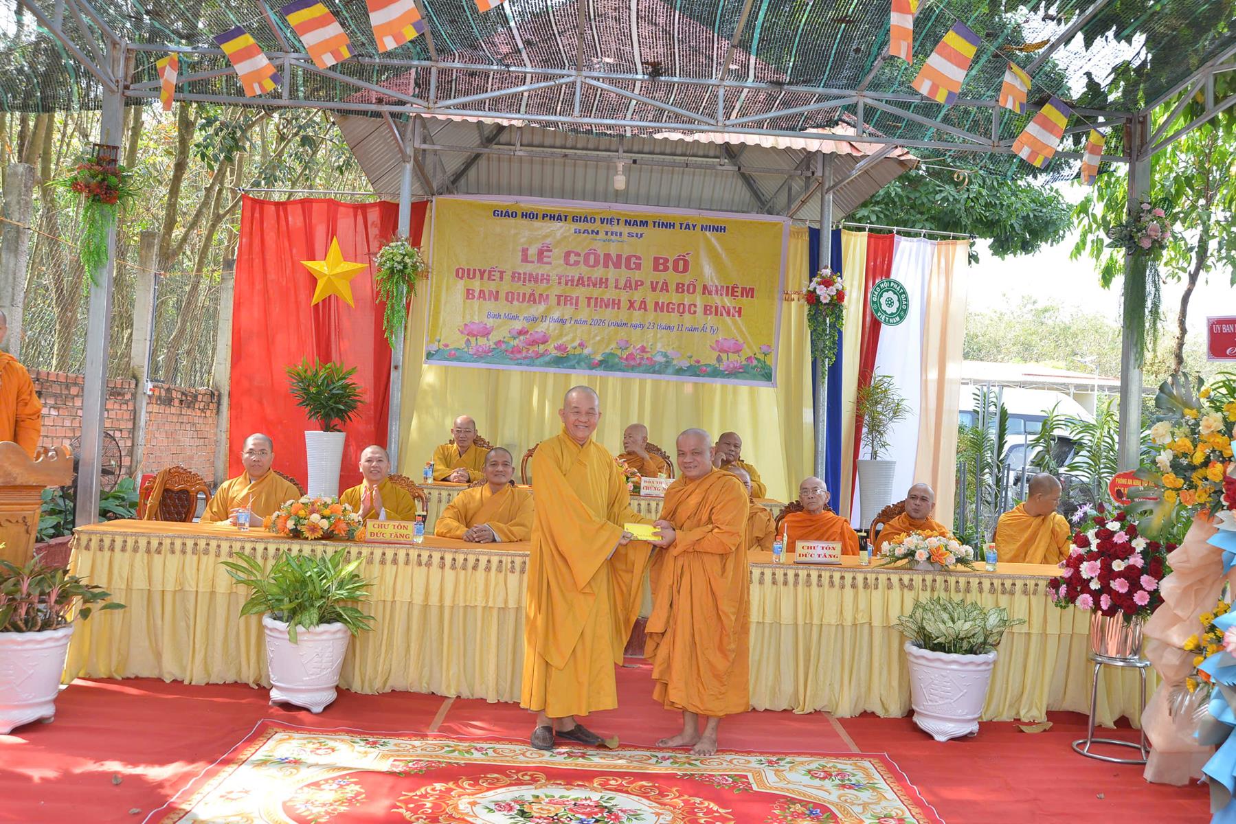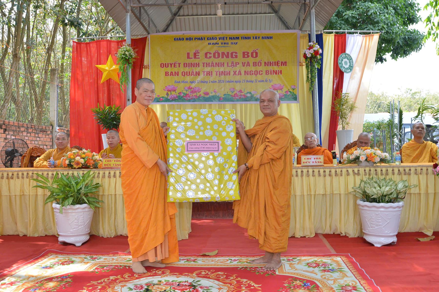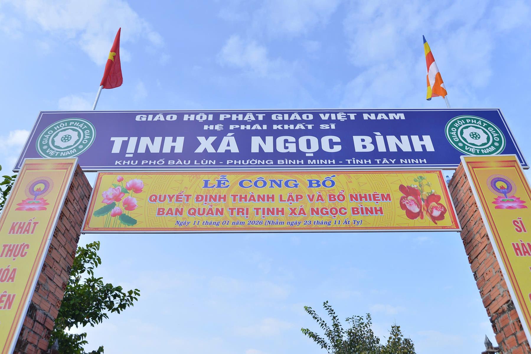 Sáng ngày 11/01/2026 (nhằm ngày 23/11/Ất Tỵ), Ban Trị sự GHPGVN tổ chức Lễ công bố quyết định thành lập và bổ nhiệm Ban Quản trị Tịnh xá Ngọc Bình, khu phố Bàu Lùn, phường Bình Minh, tỉnh Tây Ninh.