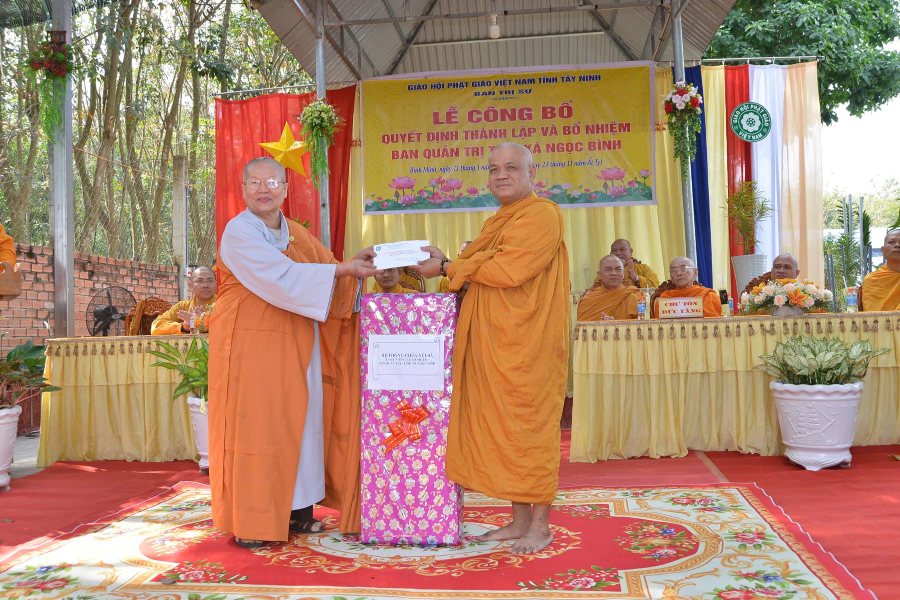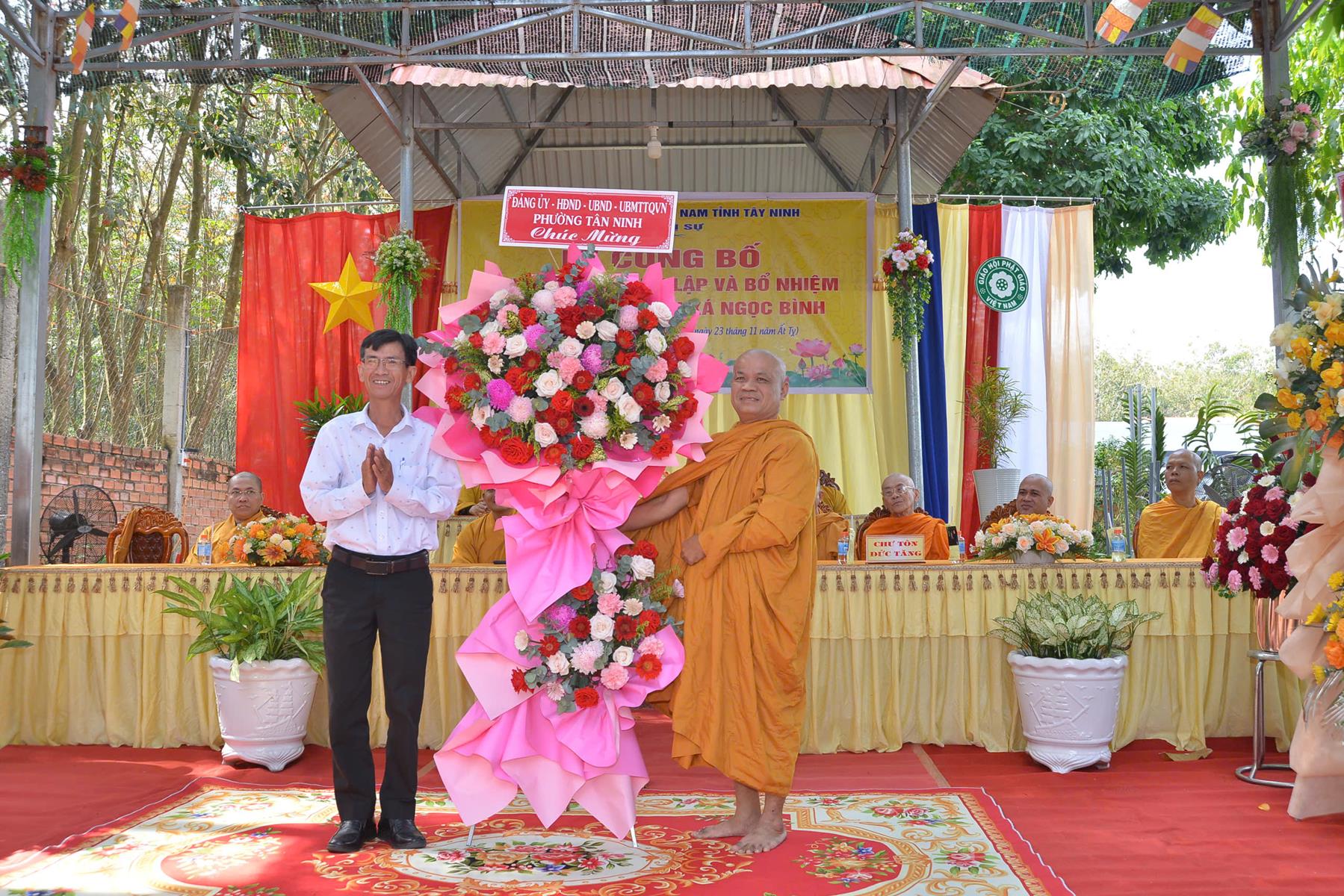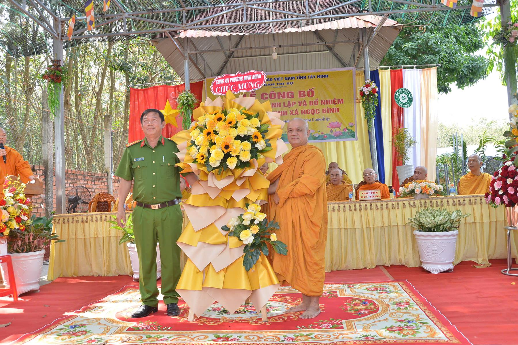 Buổi lễ đón nhận những lãng hoa, phần quà chúc mừng từ: HT. Thích Minh Thiện, BTS GHPGVN tỉnh Tây Ninh, Ban Trị sự Giáo đoàn VI Hệ phái Khất sĩ, Ủy ban MTTQVN tỉnh Tây Ninh, Sở Dân tộc và Tôn giáo tỉnh Tây Ninh, Phòng An ninh Nội địa Công an tỉnh Tây Ninh, Đảng ủy – HĐND – UBND – UBMTTQVN phường Tân Ninh, Đảng ủy – HĐND – UBND – UBMTTQVN phường Bình Minh, Công an phường Bình Minh, ĐĐ. Thích Huệ Dũng, NT. TN. Châu Liên, NT. TN. Tâm Liên, Phân ban Ni giới GHPGVN tỉnh, NS. TN. Diệu Hải và Hệ thống chùa Núi Bà Tây Ninh, Chùa Như Lai, Tịnh xá Ngọc Nhân,…