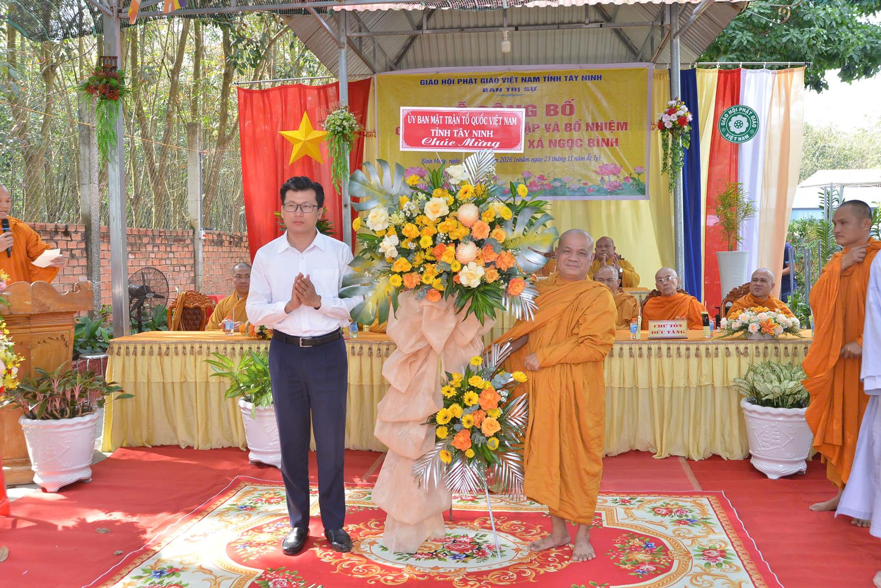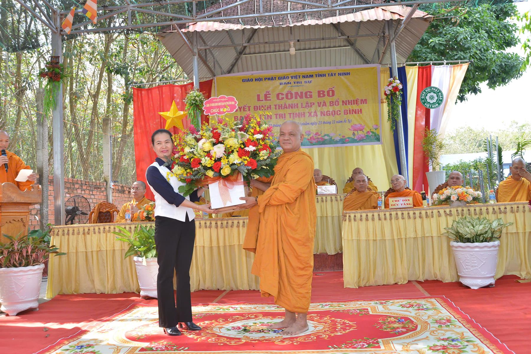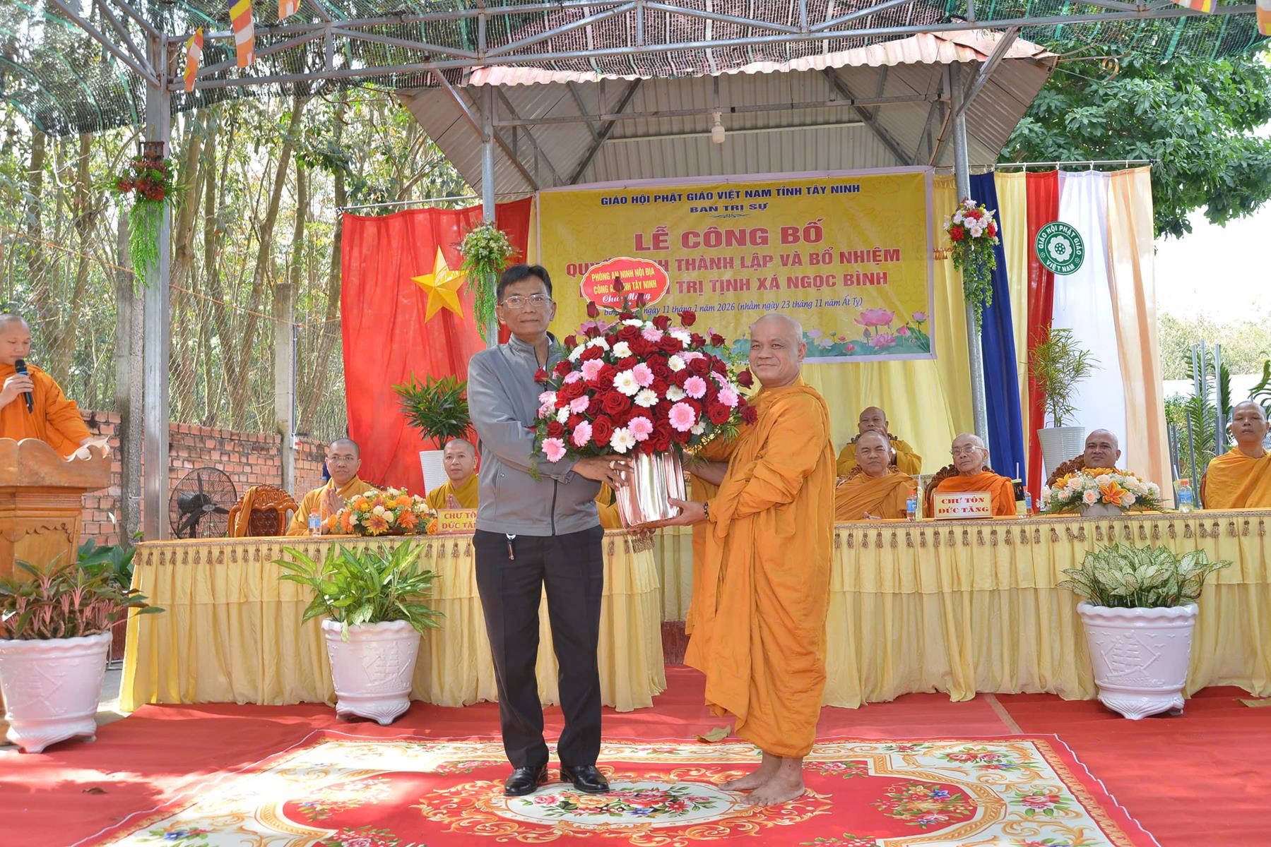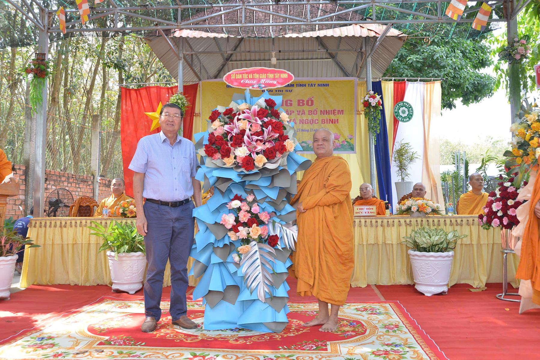 Buổi lễ đón nhận những lãng hoa, phần quà chúc mừng từ: HT. Thích Minh Thiện, BTS GHPGVN tỉnh Tây Ninh, Ban Trị sự Giáo đoàn VI Hệ phái Khất sĩ, Ủy ban MTTQVN tỉnh Tây Ninh, Sở Dân tộc và Tôn giáo tỉnh Tây Ninh, Phòng An ninh Nội địa Công an tỉnh Tây Ninh, Đảng ủy – HĐND – UBND – UBMTTQVN phường Tân Ninh, Đảng ủy – HĐND – UBND – UBMTTQVN phường Bình Minh, Công an phường Bình Minh, ĐĐ. Thích Huệ Dũng, NT. TN. Châu Liên, NT. TN. Tâm Liên, Phân ban Ni giới GHPGVN tỉnh, NS. TN. Diệu Hải và Hệ thống chùa Núi Bà Tây Ninh, Chùa Như Lai, Tịnh xá Ngọc Nhân,…