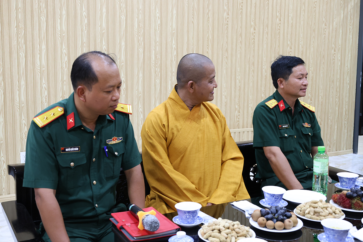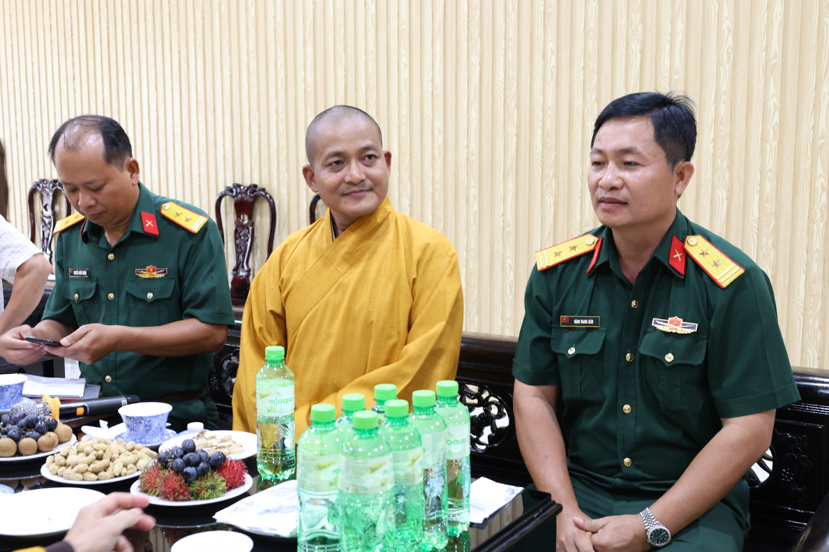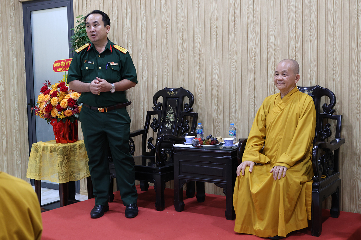 Tại buổi gặp mặt, Thượng tá Ngô Khánh – Phó Chính ủy Bộ CHQS tỉnh gửi lời chúc mừng đến chư tôn đức tăng ni, phật tử tỉnh nhà nhân dịp tổ chức thành công công tác sắp xếp lại tổ chức bộ máy của Ban Trị sự sau khi điều chỉnh địa giới hành chính, thực hiện chính quyền 2 cấp của Đảng và Nhà nước.