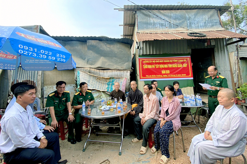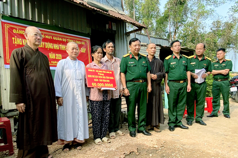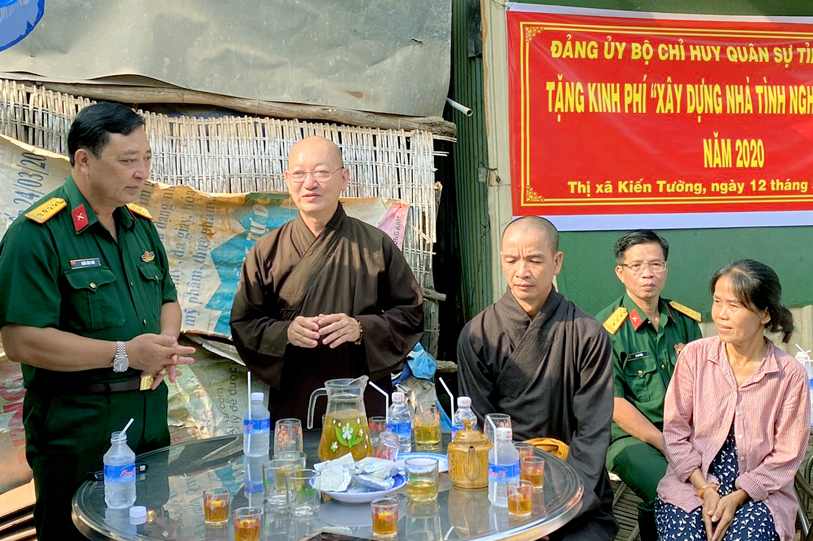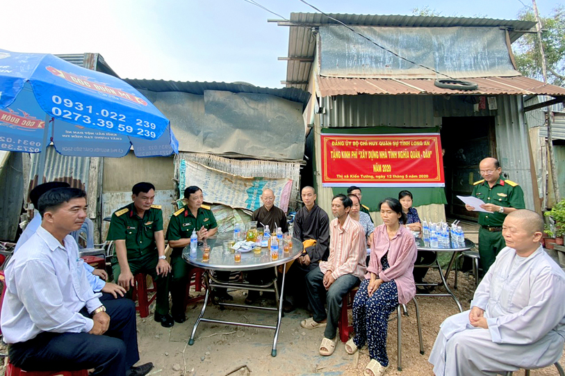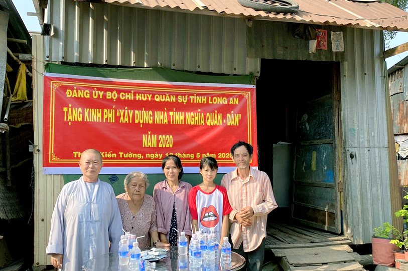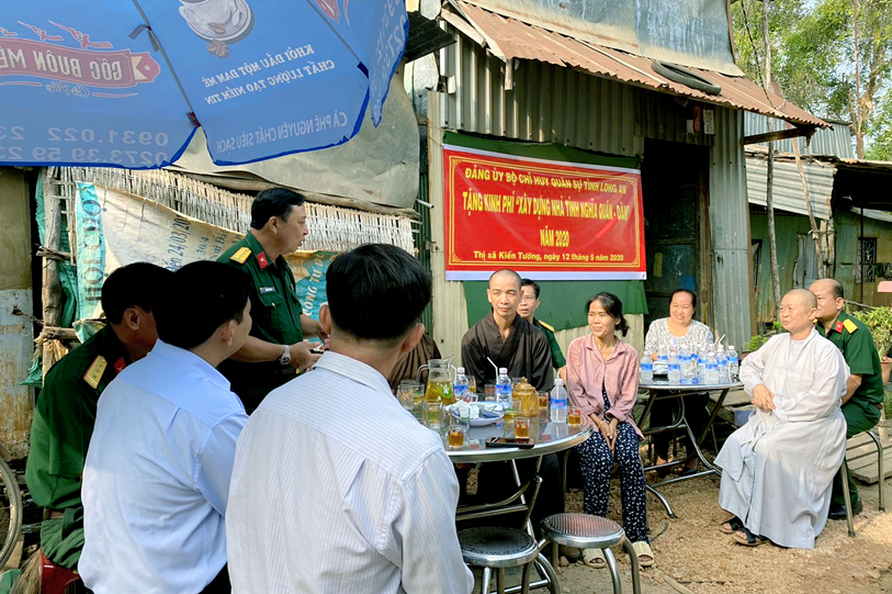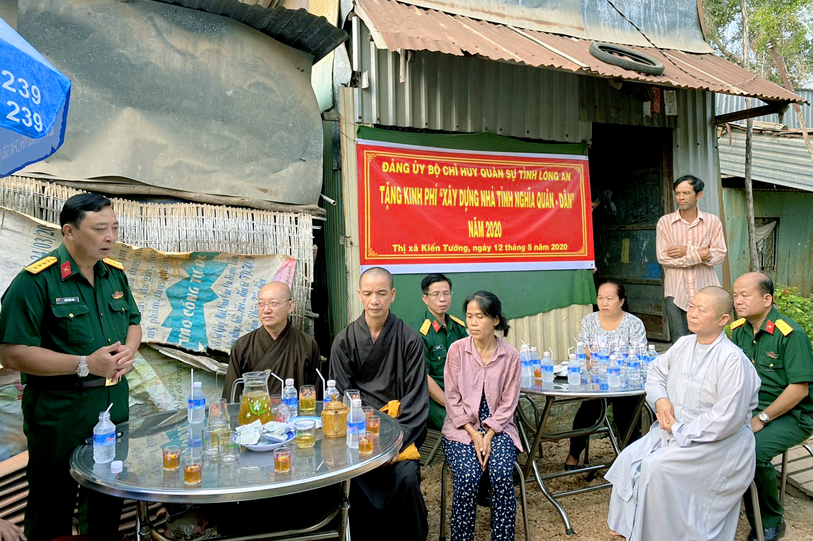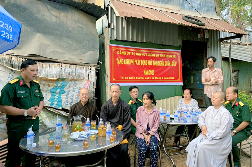 Nhằm chia sẻ những khó khăn đối với đồng bào các dân tộc thiểu số, đồng bào các tôn giáo đã và đang gặp khó khăn về nhà ở, sáng ngày 12/5/2020 (nhằm ngày 20/4/Canh Tý), tại thị xã Kiến Tường, tỉnh Long An, Bộ chỉ huy Quân sự tỉnh đã phối hợp Ban Trị sự Phật giáo tỉnh Long An tổ chức lễ trao kinh phí xây dựng nhà tình nghĩa quân – dân cho gia đình ông Lý Văn Quốc.
