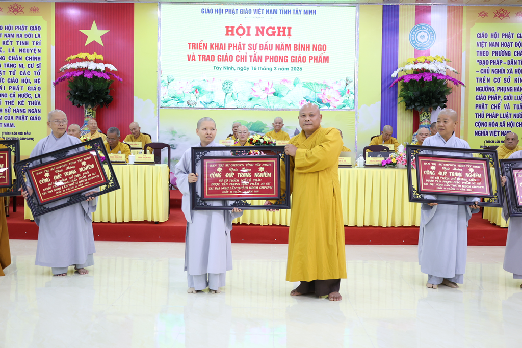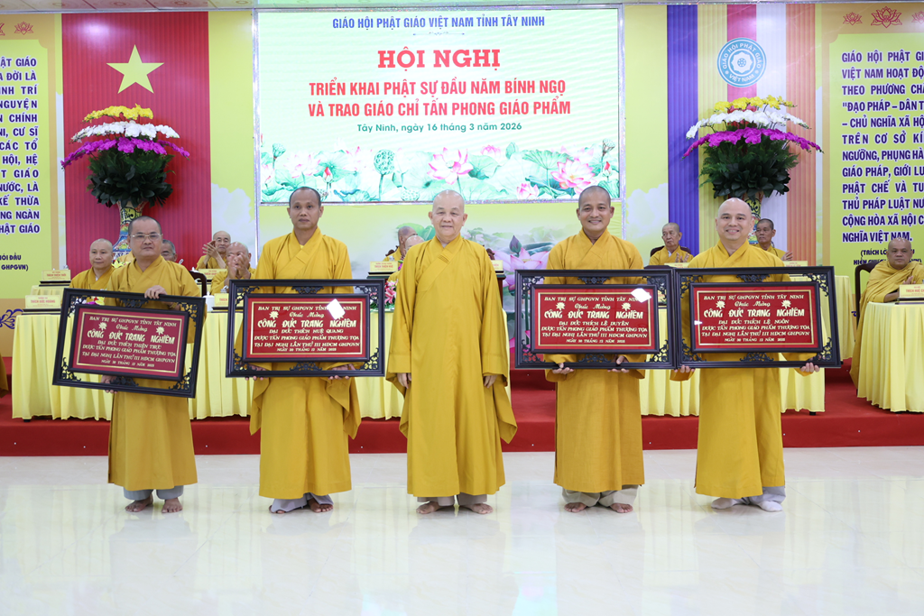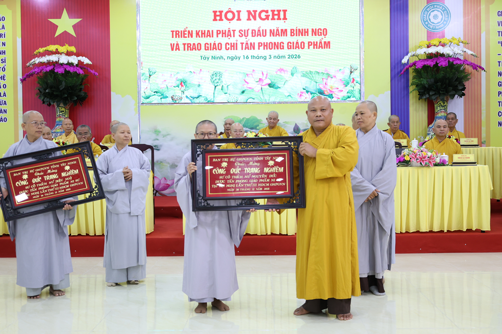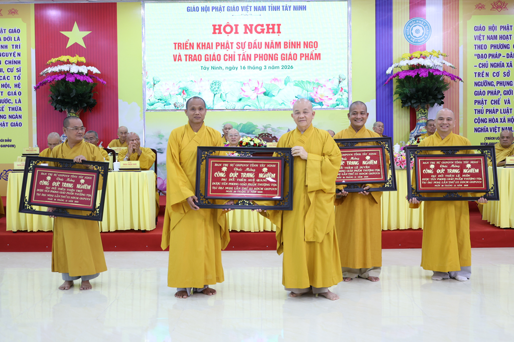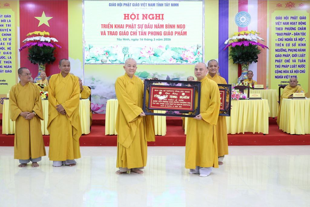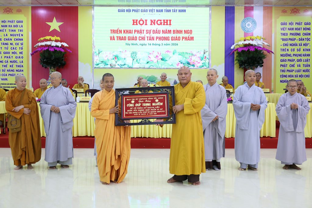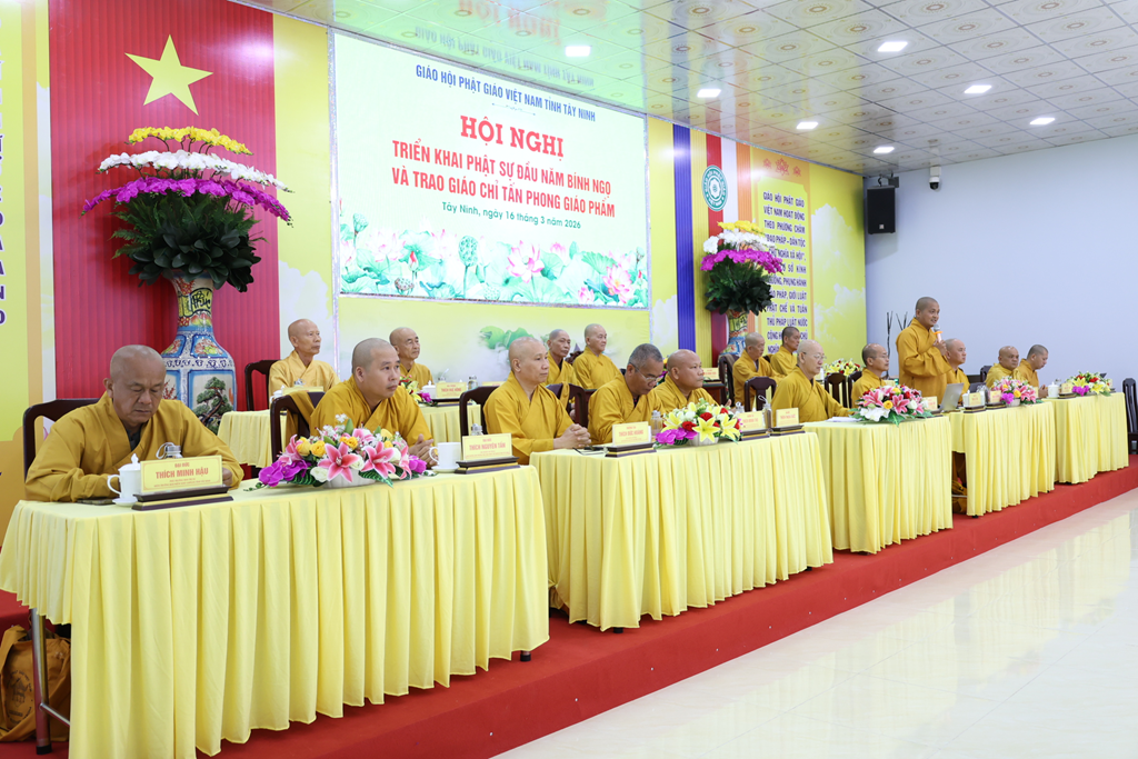Sáng ngày 16/3/2026 (nhằm ngày 28/Giêng/Bính Ngọ), Ban Trị sự GHPGVN tỉnh Tây Ninh tổ chức Hội nghị triển khai Phật sự đầu năm Bính Ngọ và Trao giáo chỉ tấn phong giáo phẩm tại Trụ sở Văn phòng BTS – chùa Pháp Minh, ấp Giồng Lớn, xã Mỹ Hạnh, tỉnh Tây Ninh.