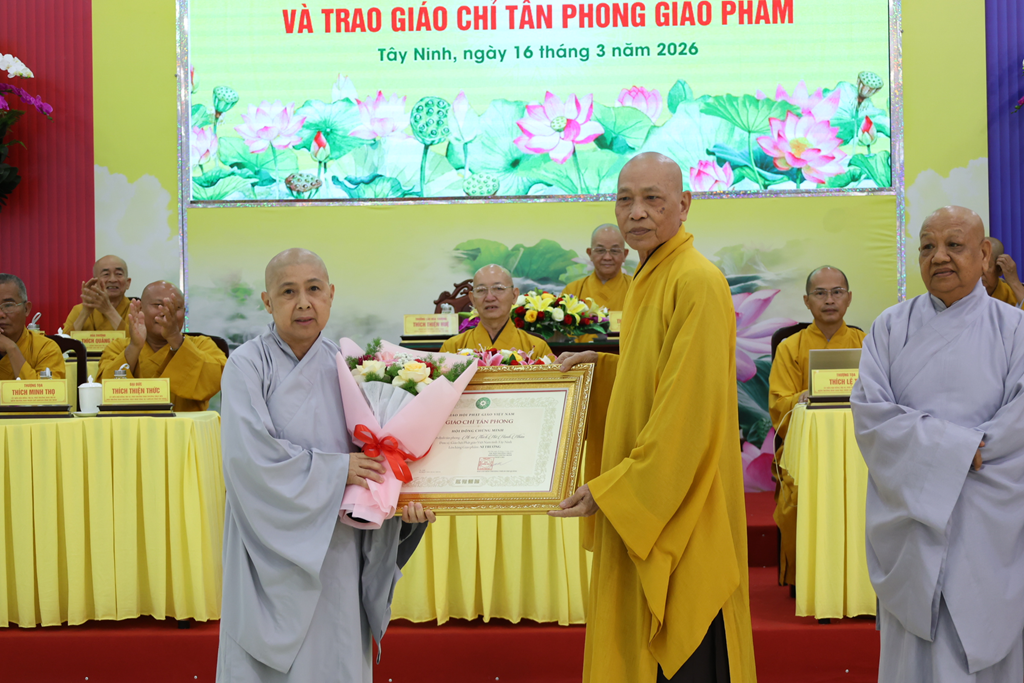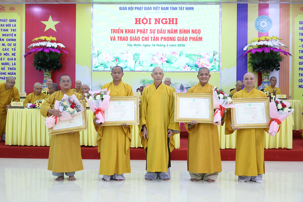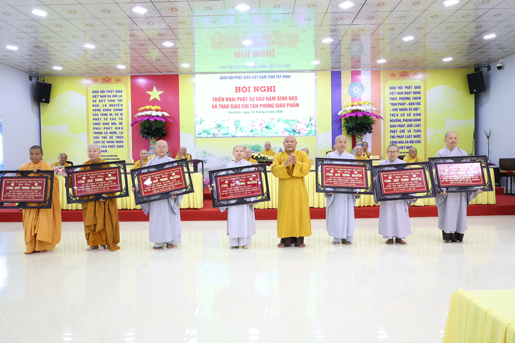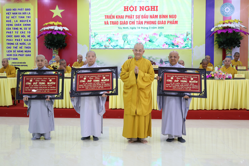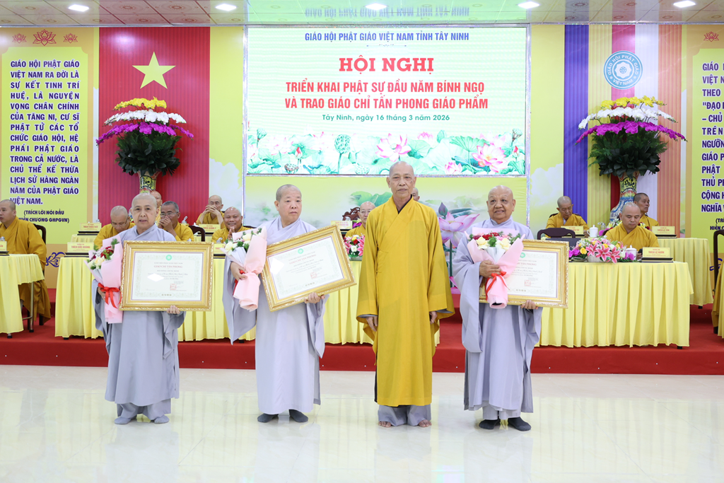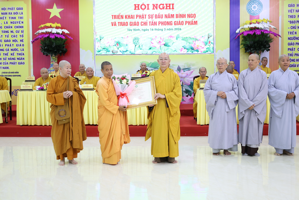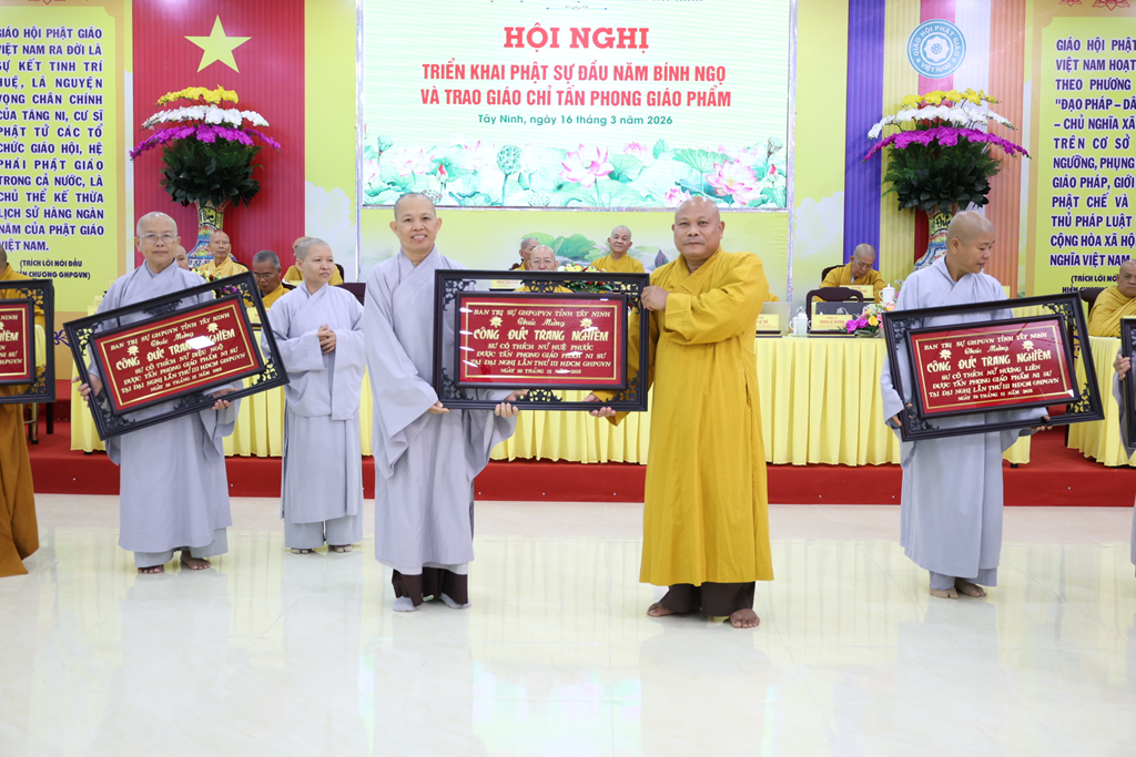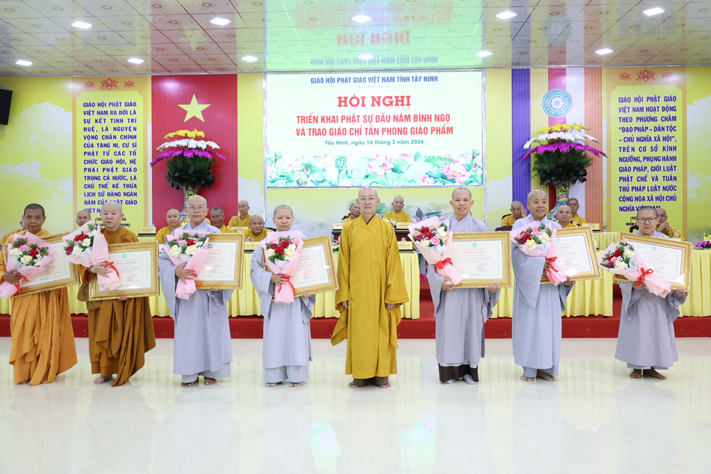 Sáng ngày 16/3/2026 (nhằm ngày 28/Giêng/Bính Ngọ), Ban Trị sự GHPGVN tỉnh Tây Ninh tổ chức Hội nghị triển khai Phật sự đầu năm Bính Ngọ và Trao giáo chỉ tấn phong giáo phẩm tại Trụ sở Văn phòng BTS – chùa Pháp Minh, ấp Giồng Lớn, xã Mỹ Hạnh, tỉnh Tây Ninh.