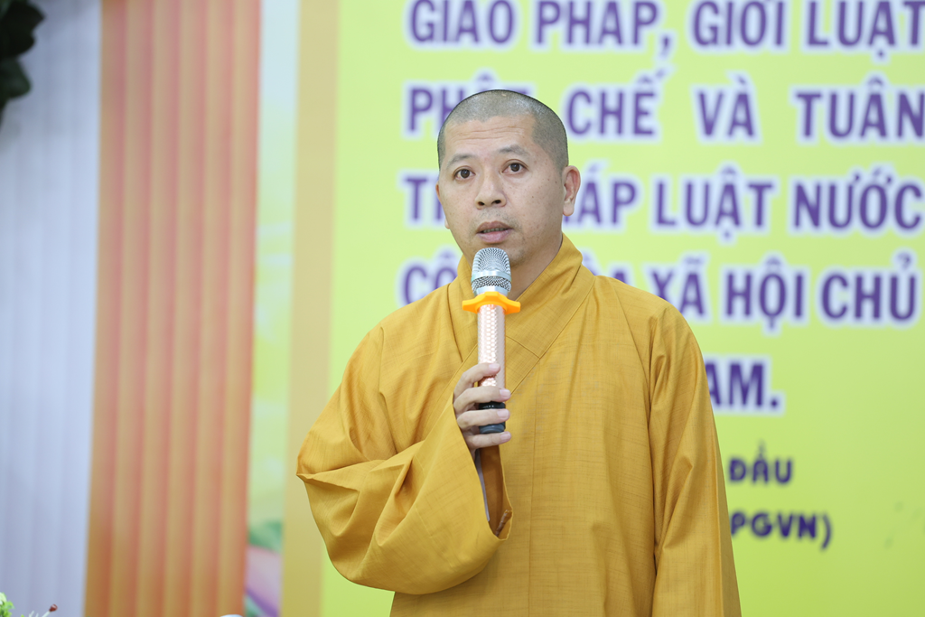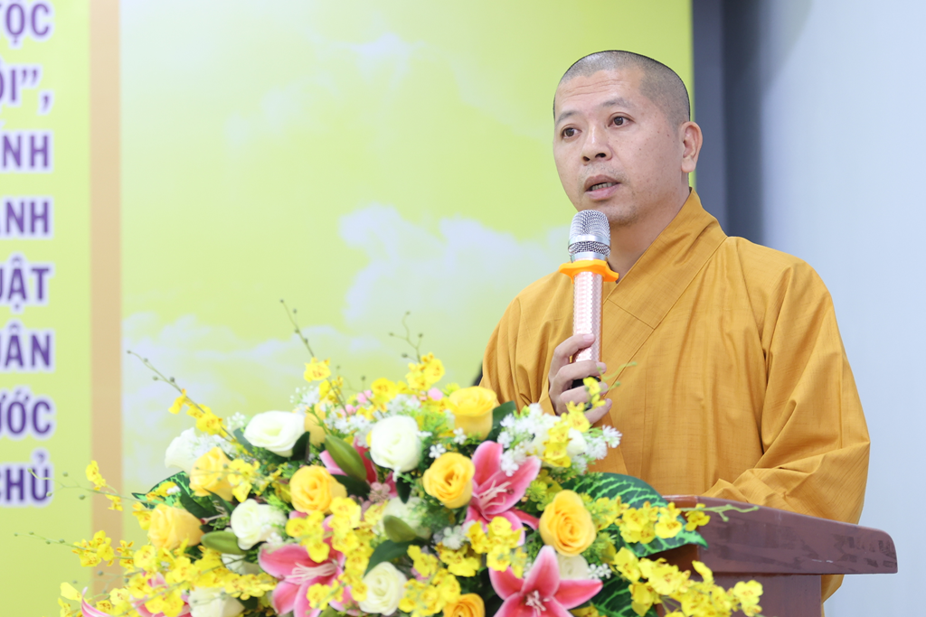 Đại diện Chư Tôn đức vừa được tấn phong giáo phẩm, TT. Thích Lệ Ngôn – Phó BTS kiêm Trưởng ban Hoằng pháp GHPGVN tỉnh đã dâng lời tri ân sâu sắc đến Hội đồng Chứng minh, Hội đồng Trị sự và BTS GHPGVN tỉnh. Thượng tọa bày tỏ niềm hoan hỷ và xem đây là niềm vinh dự đồng thời cũng là trách nhiệm lớn lao, nguyện tiếp tục tinh tấn tu học, nghiêm trì giới luật, chung tay cùng Giáo hội phụng sự Đạo pháp và dân tộc.