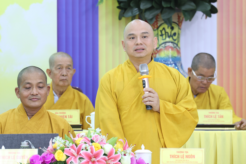 TT. Thích Lệ Duyên – Phó ban kiêm Chánh Thư ký BTS GHPGVN tỉnh thay mặt bộ phận Thư ký – Văn phòng thông qua báo cáo Phật sự tháng Chạp/Ất Tỵ và tháng Giêng/Bính Ngọ. Theo đó, hoạt động Phật sự toàn tỉnh nhìn chung ổn định, đặc biệt là các sự kiện: Công bố quyết định thành lập và bổ nhiệm Ban Quản trị các cơ sở tự viện; tổ chức Lễ Tổng kết công tác Phật sự tỉnh Tây Ninh năm 2025; Tổ chức đoàn khánh tuế Đức Pháp chủ, Chư Tôn đức HĐCM, Chư Tôn đức HĐTS, Văn phòng II TW, Chư Tôn đức Chứng minh, cố vấn BTS GHPGVN tỉnh nhân dịp Xuân Bính Ngọ; Tiếp đoàn lãnh đạo tỉnh Tây Ninh thăm và chúc tết BTS Phật giáo tỉnh; tổ chức Lễ Tưởng niệm tại nghĩa trang liệt sĩ Trà Võ, nghĩa trang liệt sĩ Long An; Dự Họp mặt đại biểu Dân tộc – Tôn giáo của Ủy ban MTTQ Việt Nam tỉnh; tổ chức đoàn thăm và chúc tết lãnh đạo tỉnh Tây Ninh; tổ chức trao tặng quà đến các chùa Nam Tông – Khmer, Nam Tông – Kinh, đến người dân khó khăn, khu vực biên giới,…
