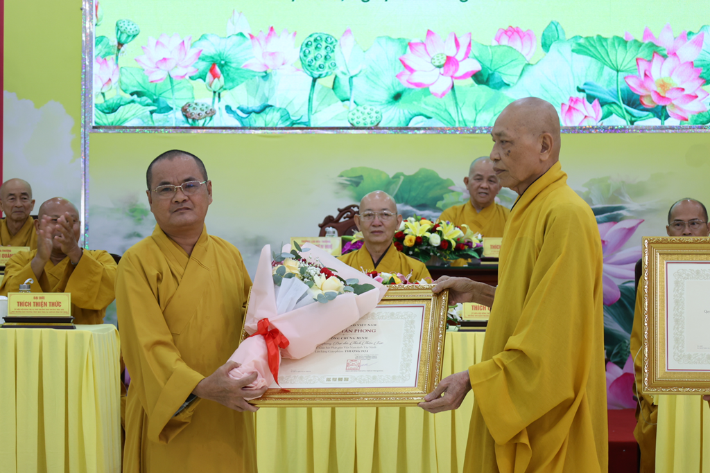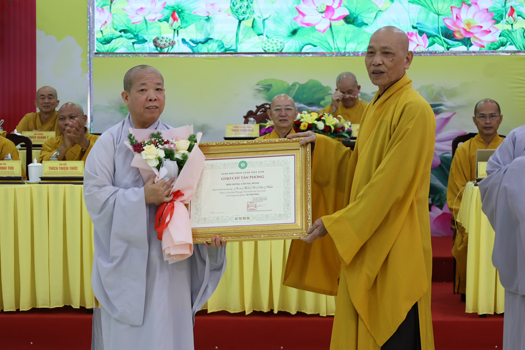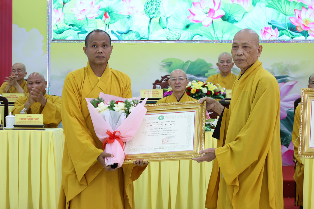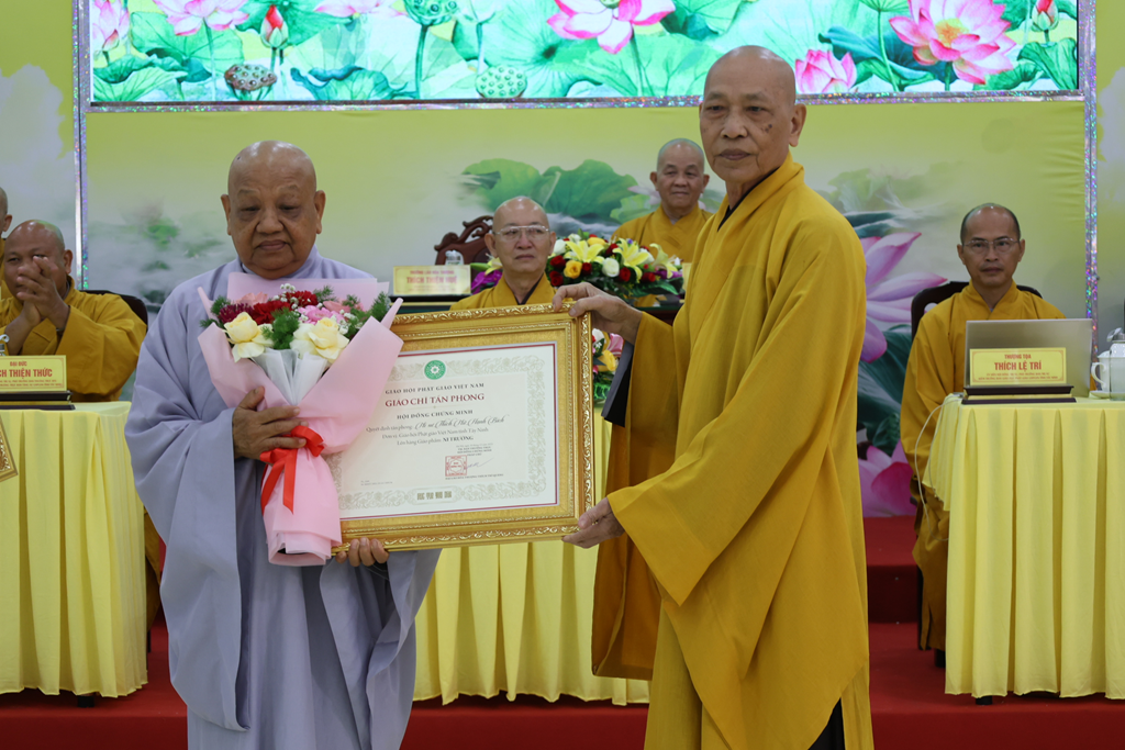 Tiếp đó, Chư Tôn đức Chứng minh BTS GHPGVN đã trao giáo chỉ tấn phong đến Chư vị tôn đức được tấn phong giáo phẩm trong niềm hoan hỷ của toàn thể hội nghị.