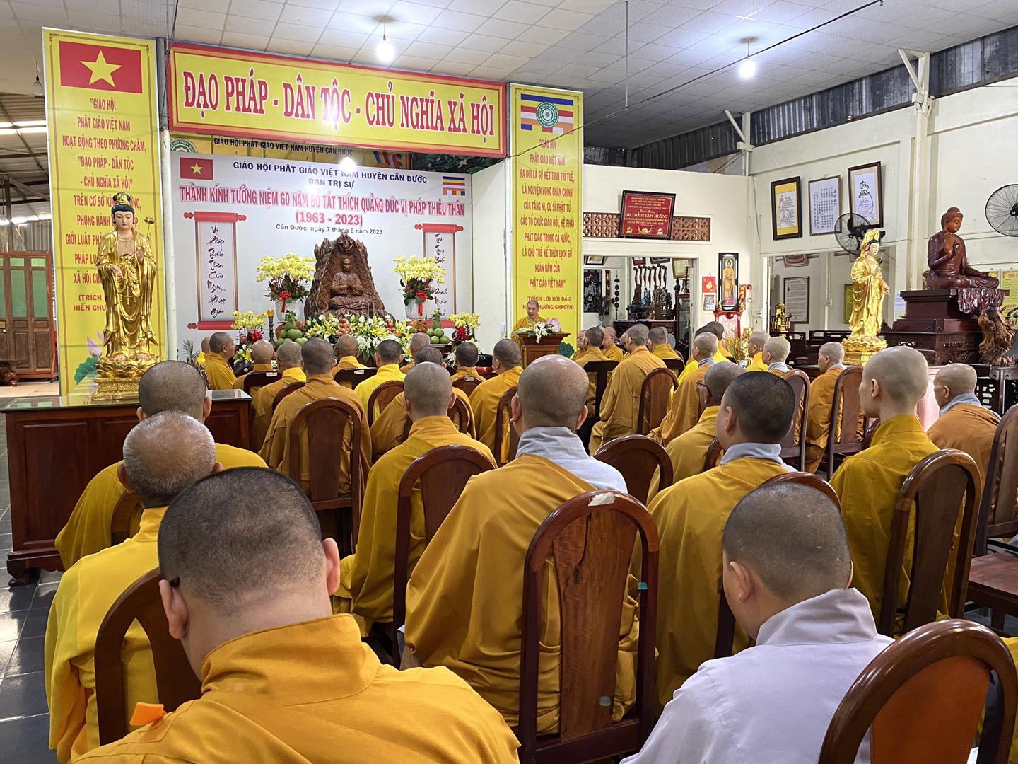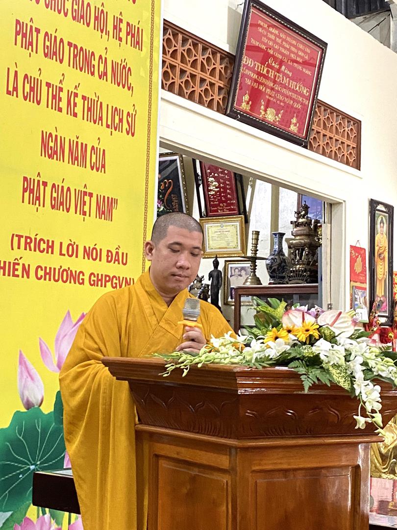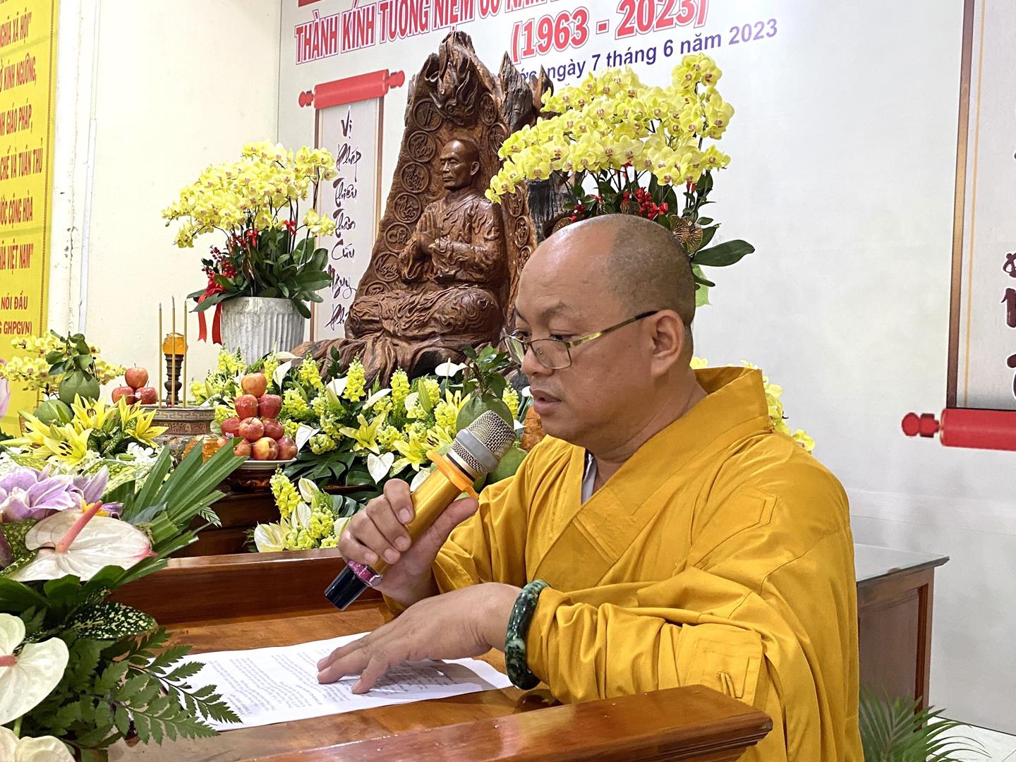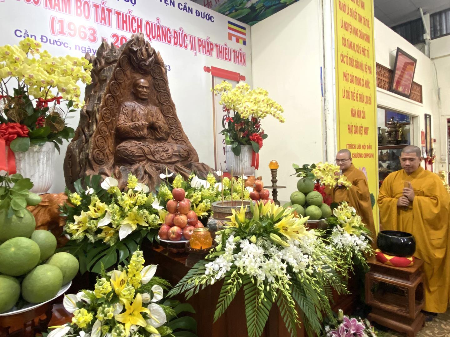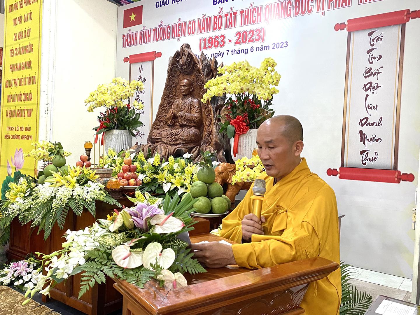Trước sự xúc động của Đại chúng hướng về tôn tượng Bồ tát trong ngày Đại lễ Tưởng niệm, Đại đức Thích Trí Minh – UV Thường trực TS GHPGVN tỉnh, Trưởng BTS GHPGVN huyện Cần Đước đã dâng lời tưởng niệm, trong lời tưởng niệm Đại đức đã nhấn mạnh tấm lòng từ bi của bậc Bò tát đại sĩ, xuất thân trong trần nhưng khác với người trần, Bồ tát đã thực hiện việc lành khó làm trong đời mà không phải ai cũng có thể phát tâm làm được, chí nguyện lợi sanh của Ngài, con đường thoát ly sinh tử, đòi bình đẳng tôn giáo, phá bỏ sự độc tài của chính quyền thời đó, đưa ngọn cờ Phật giáo tung bay, Tăng, Ni, Phật tử được tự do trong quá trình tu hành giải thoát.