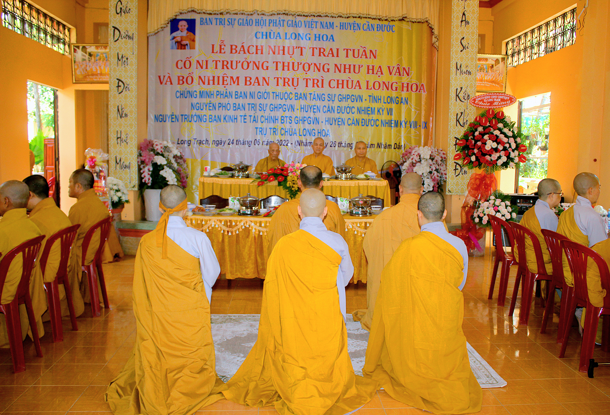 Sáng nay, ngày 24 tháng 6 năm 2022 (nhằm ngày 26 tháng 05 năm Nhân Dần) dưới sự chứng minh của mười phương chư Phật, sự chỉ đạo của Thường trực BTS GHPGVN tỉnh Long An, Ban Trị sự GHPGVN huyện Cần Đước cùng môn đồ pháp quyến trang nghiêm lễ tưởng niệm Bách nhật trai tuần cố Ni trưởng Thích nữ Như Vân – Chứng minh Phân ban Đặc trách Ni giới GHPGVN tỉnh Long An – Chứng Minh Phân ban Ni giới BTS GHPGVN huyện Cần Đước – Trụ trì Chùa Long Hoa và lễ bổ nhiệm Ban Trụ trì Chùa Long Hoa, tại Chùa Long Hoa, xã Long Trạch, huyện Cần Đước, tỉnh Long An.