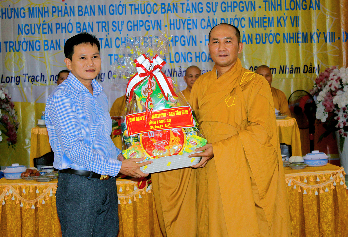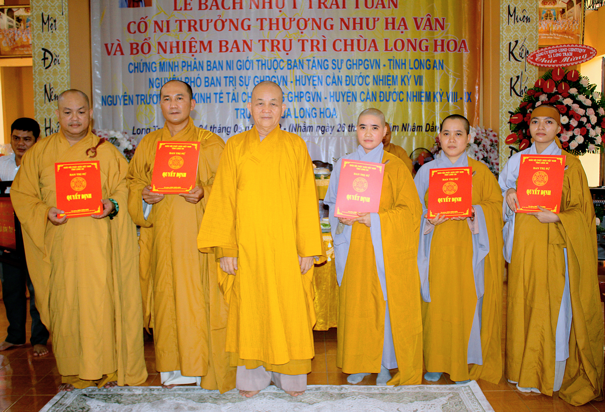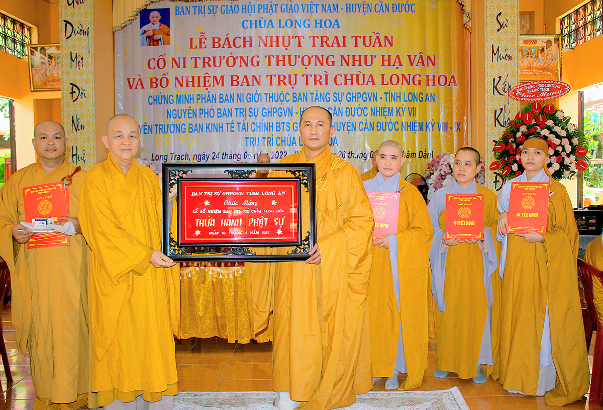 Tân Ban Trụ trì Chùa Long Hoa được tiếp nhận quyết định bổ nhiệm Ban Trụ trì và con dấu từ Hòa thượng Thích Minh Thiện – UV HĐTS – Phó Trưởng Ban Hoằng pháp TW – Trưởng BTS GHPGVN tỉnh Long An, đồng thời được nhận khánh vàng lưu niệm từ Hòa thượng trao tặng.