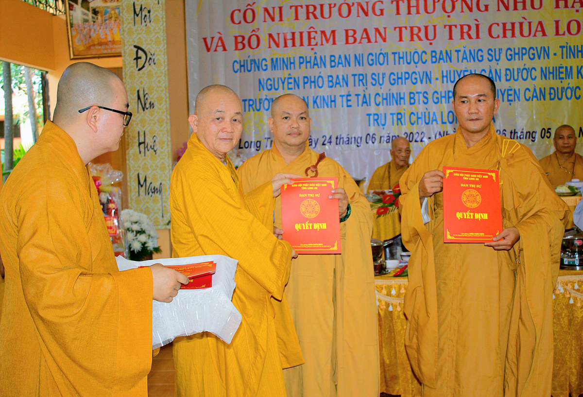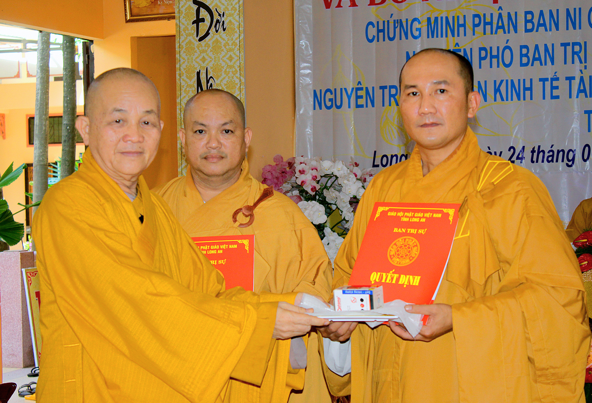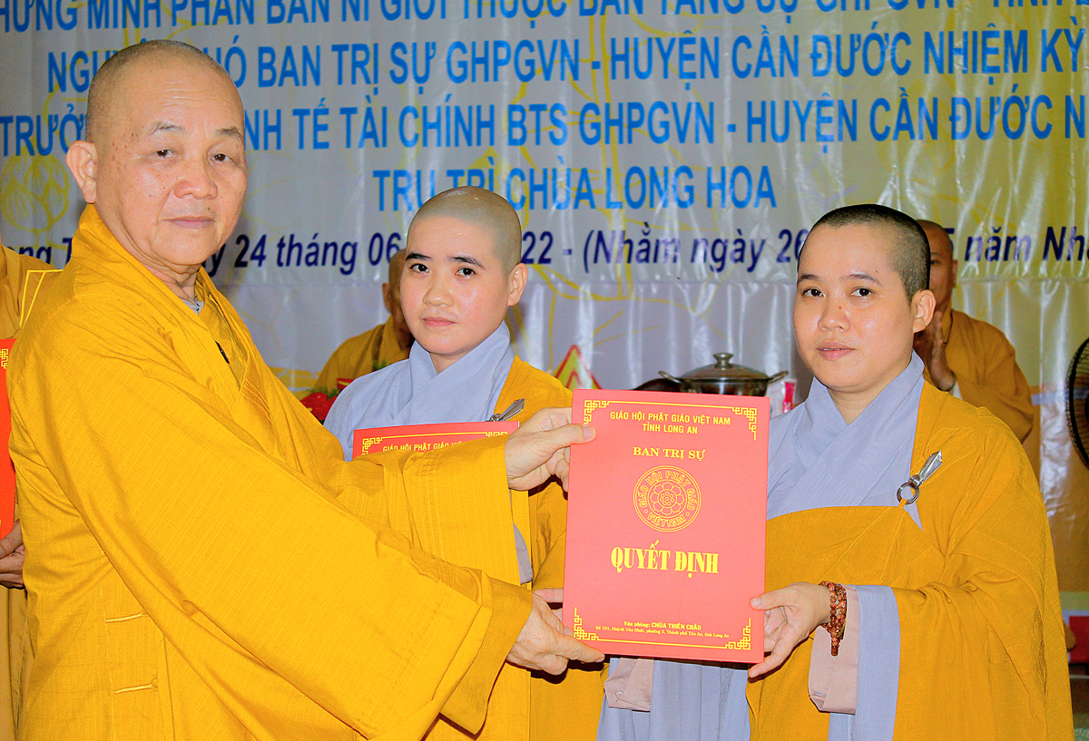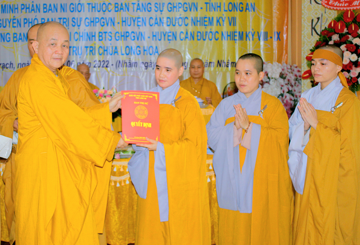 Tân Ban Trụ trì Chùa Long Hoa được tiếp nhận quyết định bổ nhiệm Ban Trụ trì và con dấu từ Hòa thượng Thích Minh Thiện – UV HĐTS – Phó Trưởng Ban Hoằng pháp TW – Trưởng BTS GHPGVN tỉnh Long An, đồng thời được nhận khánh vàng lưu niệm từ Hòa thượng trao tặng.