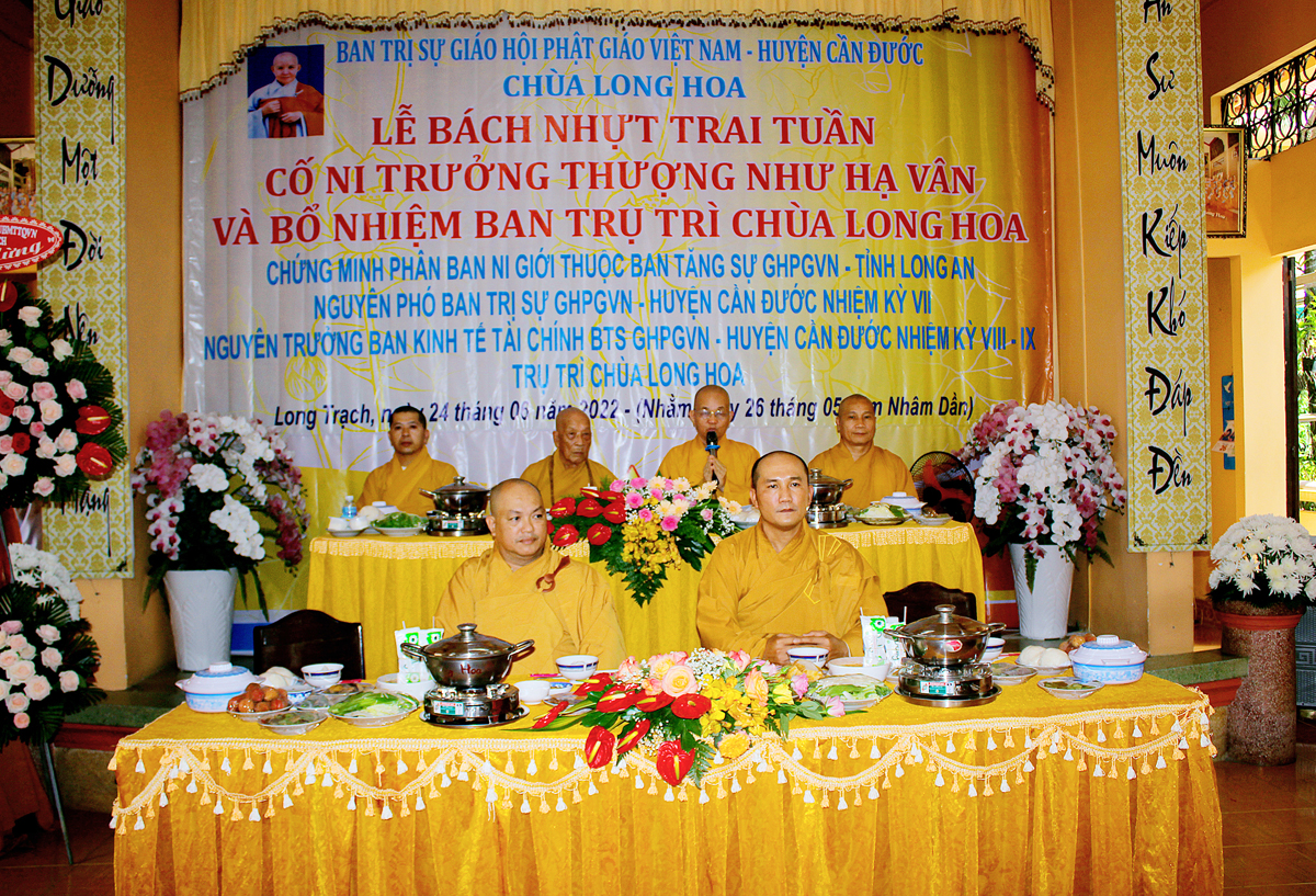 Sau lời tác bạch tưởng niệm Bách nhật trai tuần cố Ni trưởng Thượng NHƯ Hạ VÂN của đại diện môn đồ pháp quyến, toàn thể hội chúng được lắng nghe lời đạo từ cao quý của Hòa thượng Thích Minh Thiện – UV HĐTS – Phó Trưởng Ban Hoằng pháp TW – Trưởng BTS GHPGVN tỉnh Long An, trong lời đạo từ Hòa thượng đã lần nữa ôn lại giá trị của Phật giáo nước nhà trong sự đồng hành và phát triển cùng dân tộc, nhấn mạnh hiến chương của Giáo hội Phật giáo Việt Nam trong quá lãnh lãnh đạo Phật giáo nước nhà, sự thống nhất toàn vẹn về các tổ chức hệ phái trọn vẹn trong mái nhà chung mang tên Giáo hội Phật giáo Việt Nam, đồng thời Ngài diễn giải mọi mặt về tính khách quan trong việc quản lý động sản, bất động sản mọi tài sản thuộc về giáo hội và việc quản lý của giáo hội tại các Tự viện trực thuộc, quản lý đời sống sinh hoạt và tu học của Tăng, Ni, Phật tử trong cả nước.