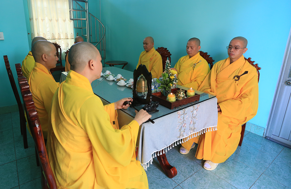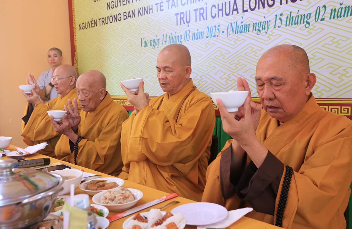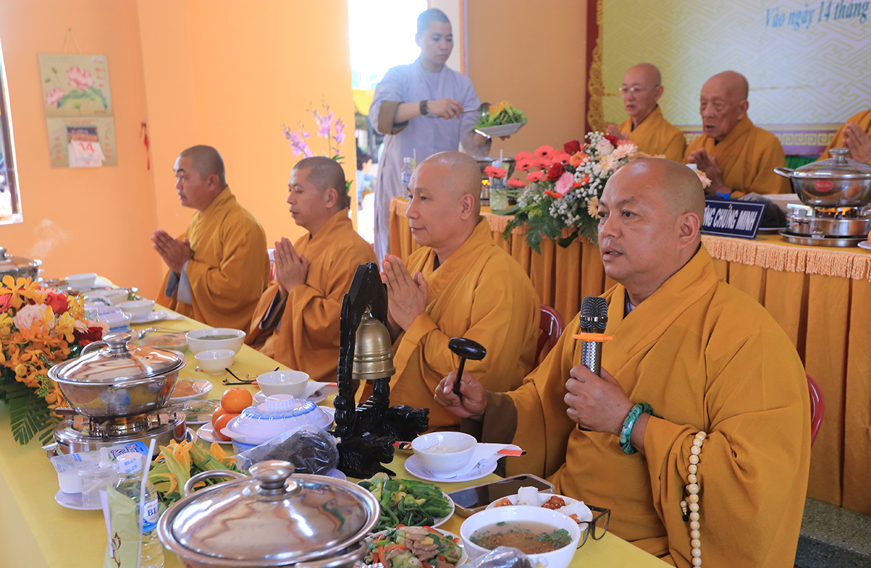 Hòa thượng cùng chư tôn đức nhất tâm niệm Phật, cầu nguyện Giác linh Cố Ni trưởng cao đăng Phật cảnh. Nghi thức quá đường trong buổi lễ tưởng niệm và hồi hướng hoàn mãn buổi lễ.