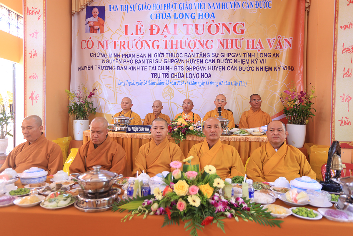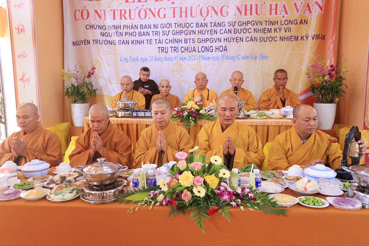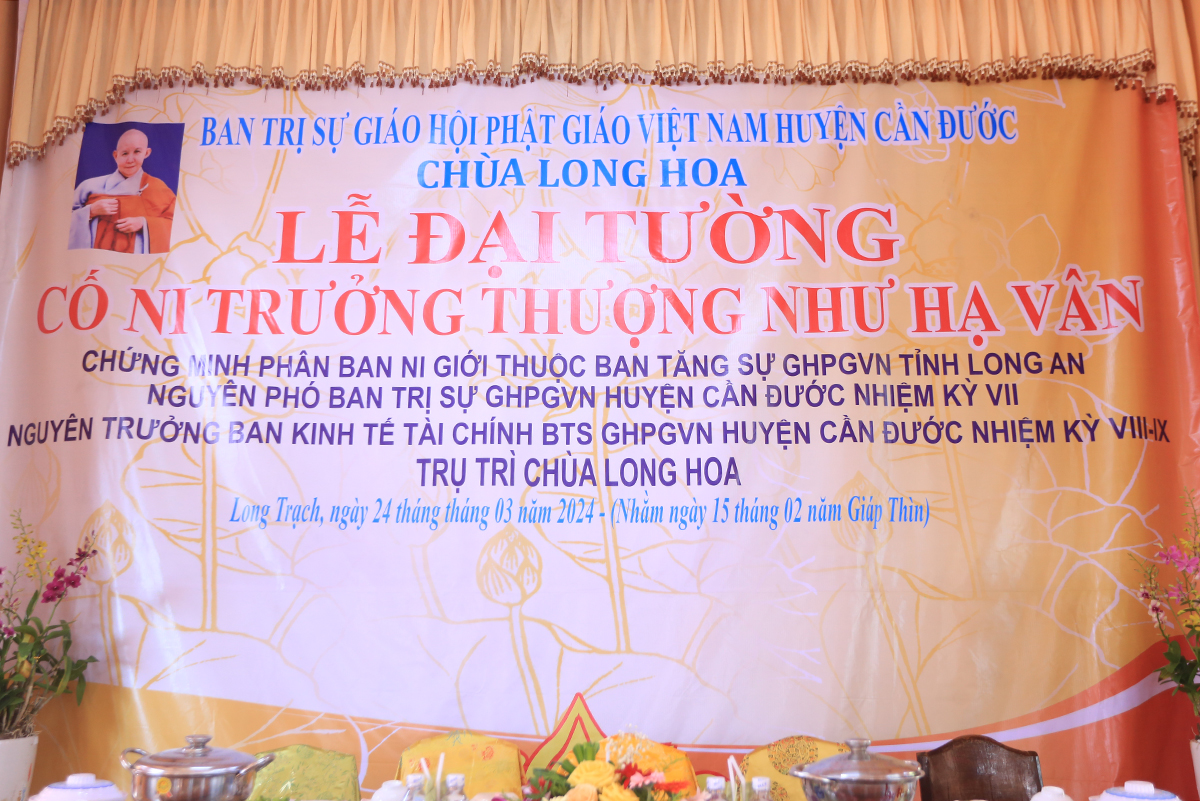 Sáng nay, ngày 24 tháng 3 năm 2024 (nhằm ngày 15 tháng 02 năm Giáp Thìn), dưới sự chứng minh của mười phương chư Phật, sự chỉ đạo của Thường trực BTS GHPGVN tỉnh Long An, Ban Trị sự GHPGVN huyện Cần Đước cùng môn đồ pháp quyến trang nghiêm lễ tưởng niệm Đại tường cố Ni trưởng Thượng NHƯ Hạ VÂN – Chứng minh Phân ban Ni giới thuộc Ban Tăng sự GHPGVN tỉnh Long An – Chứng Minh Phân ban Ni giới BTS GHPGVN huyện Cần Đước – Trụ trì Chùa Long Hoa, xã Long Trạch, huyện Cần Đước, tỉnh Long An.
