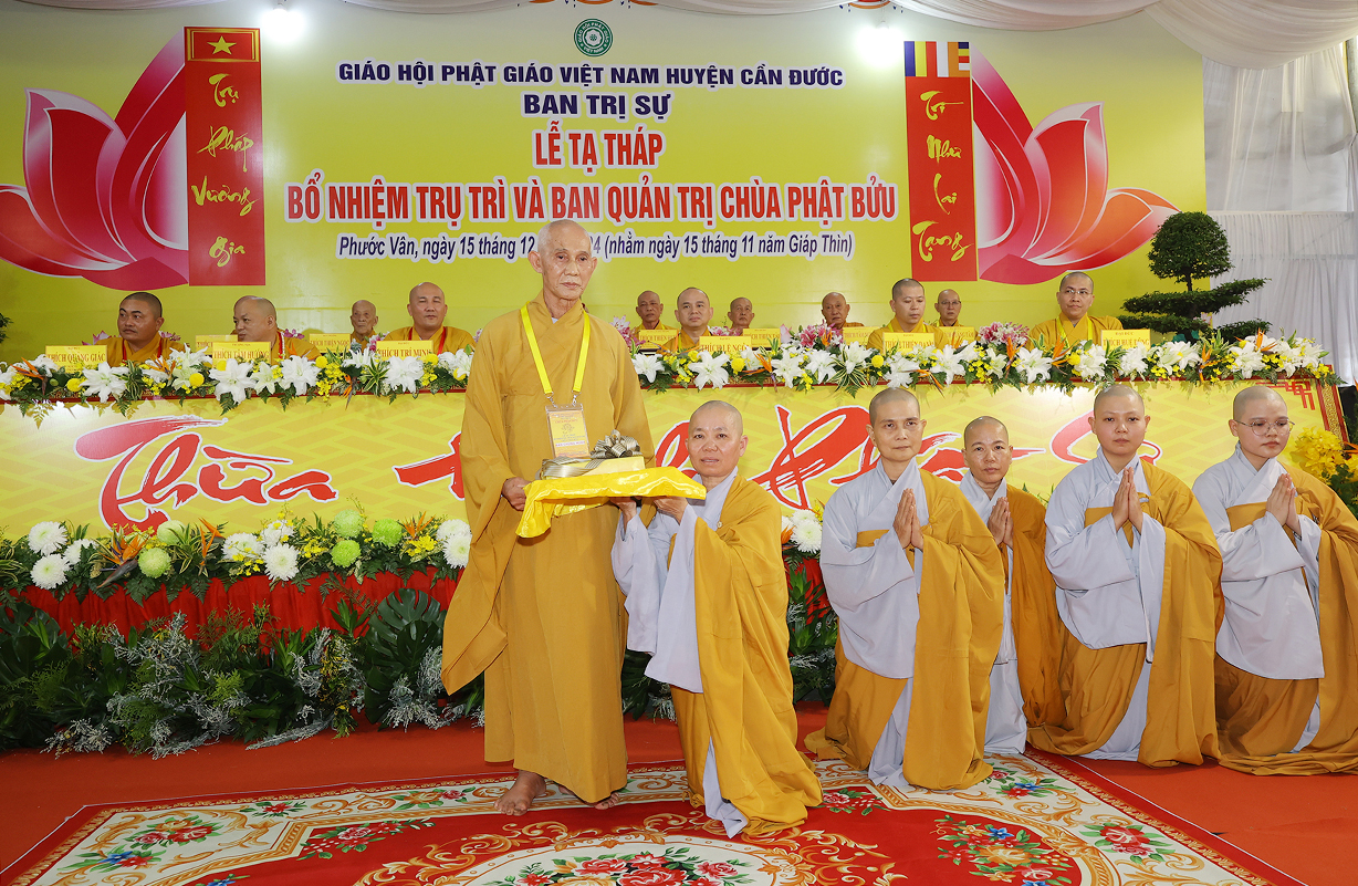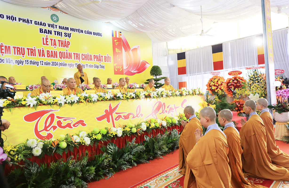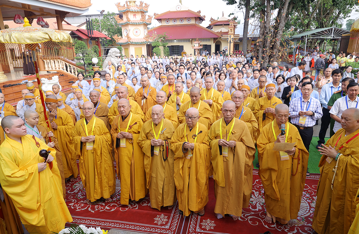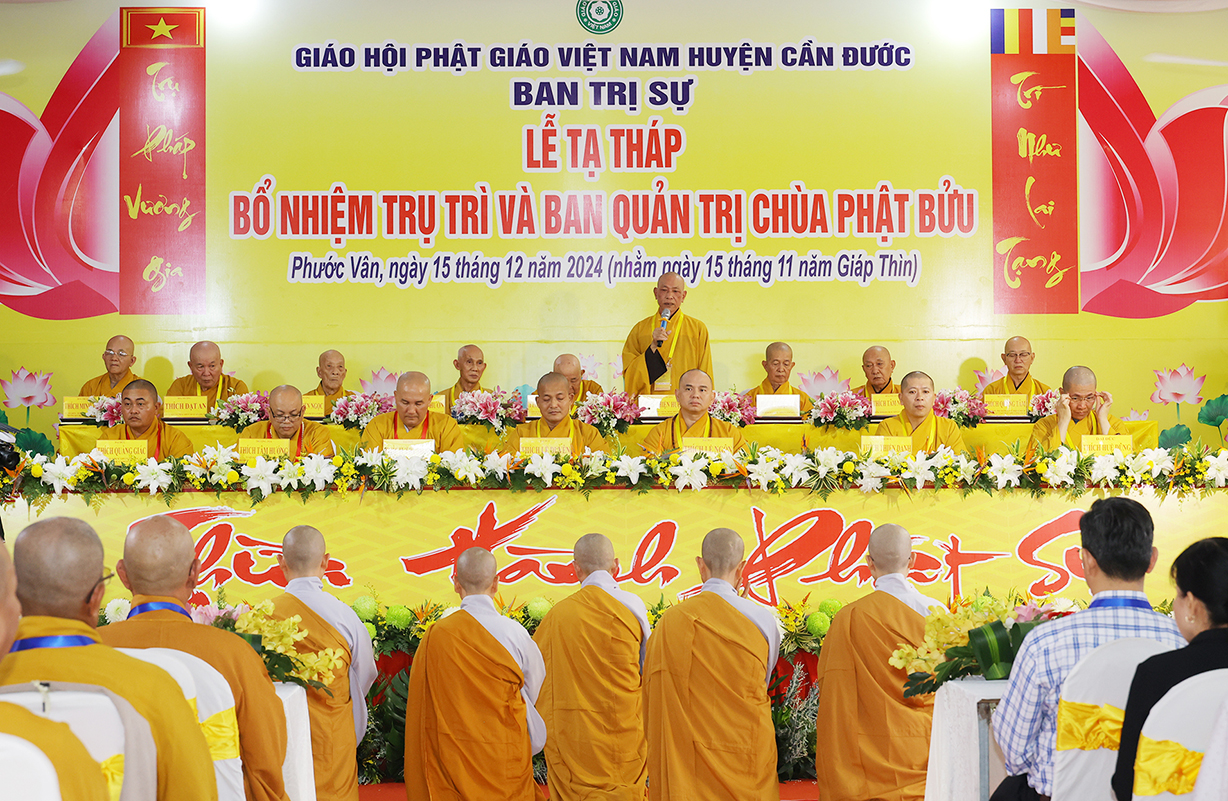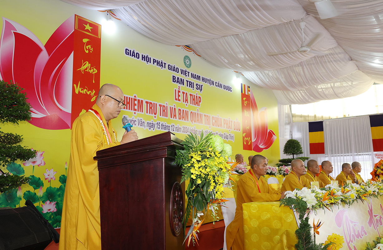 Thay mặt Thường trực BTS GHPGVN huyện Cần Đước, Thượng tọa Thích Tâm Hướng có lời cảm tạ, tri ân Chư Tôn Trưởng lão Hòa thượng, Chư tôn đức Tăng, Ni, Chính quyền các cấp đã luôn tận tâm, giúp đỡ, hỗ trợ về mọi mặt để buổi lễ được thập phần viên mãn. Sau đó. Ban tổ chức cung thỉnh chư Tôn đức chứng minh quang lâm trai đường thọ trai hoàn mãn buổi lễ trong niềm hoan hỷ.