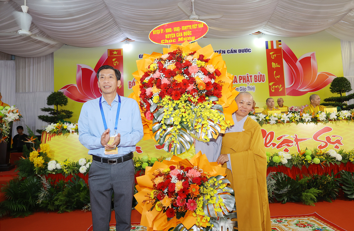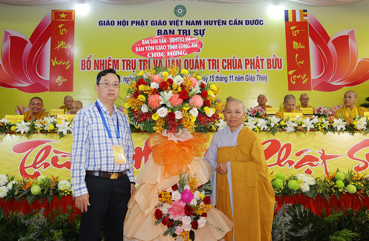 Ông Nguyễn Minh Vương – Phó Chư tịch UBND huyện Cần Đước, thay mặt lãnh đạo huyện Cần Đước có lời phát biểu tại buổi lễ. Buổi lễ này là sự kiện trọng đại của Phật giáo, Ông chúc mừng BTS GHPGVN, huyện Cần Đước và Ni sư Tân trụ trì. Ông nêu ra một số thành tựu của huyện nhà trong thời gian qua và kêu gọi Chư Ni và Phật tử Chùa Phật Bửu cùng chung tay góp sức xây dựng quê hương Cần Đước ngày một giàu đẹp.