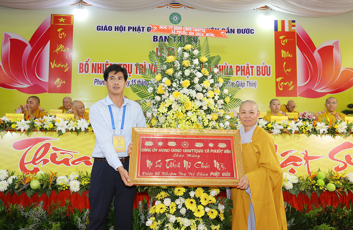 Buổi lễ đón nhận nhiều lãng hoa, khánh vàng chúc mừng từ: Hòa thượng Thích Thiện Huệ, Hòa thượng Thích Minh Thiện, BTS GHPGVN tỉnh Long An, Ban Dân vận – Ban Tôn giáo tỉnh Long An; BTS GHPGVN huyện Cần Đước; Chư Ni huyện Cần Đước; Huyện ủy – HĐND – UBND – UB MTTQ huyện Cần Đước; Công an huyện Cần Đước; UBND xã Phước Vân,… và nhiều phần quà khác.