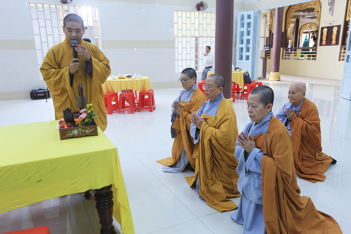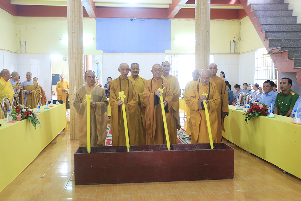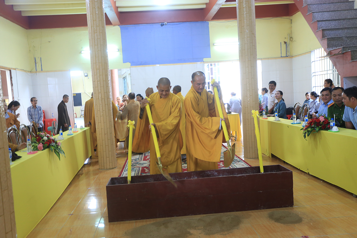 Buổi lễ đã cung thỉnh chư tôn đức chứng minh, quý lãnh đạo khách quý và toàn thể Phật tử trang nghiêm trước Lễ đường để thực hiện nghi thức niêm hương bạch Phật, sái tịnh đàn tràng, động thổ xây dựng Giảng đường, cùng nguyện cho Phật sự sớm viên thành.