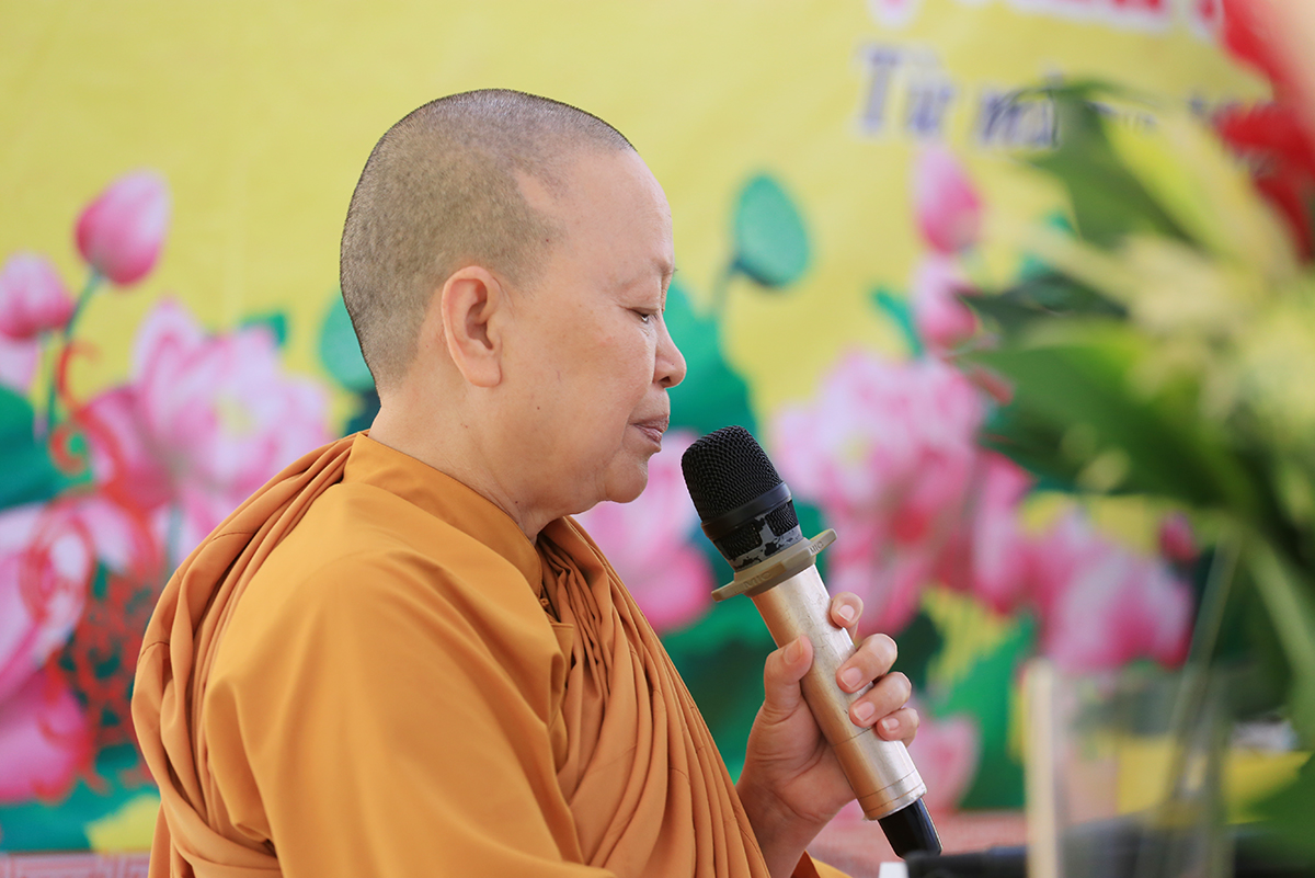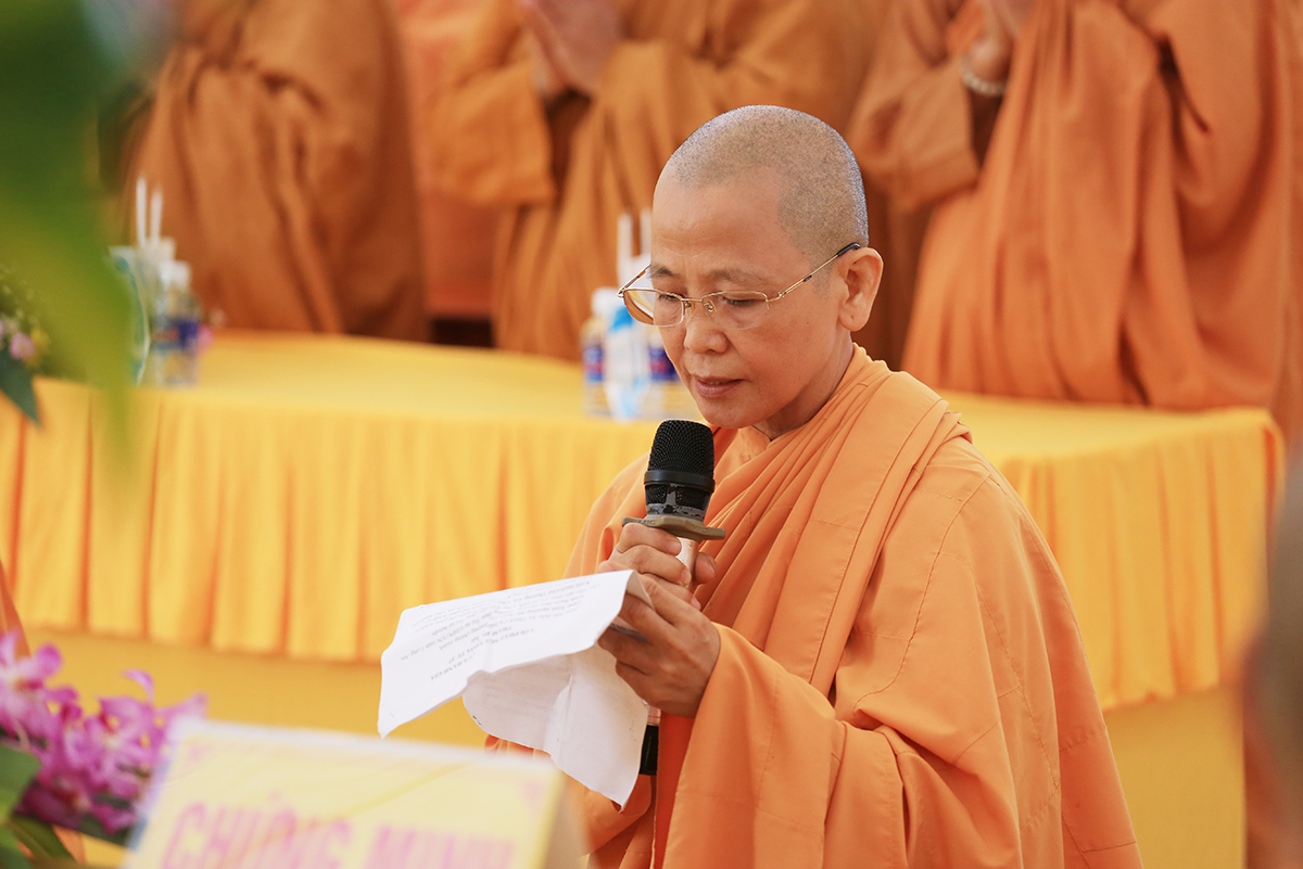Tiếp đó, Ni sư Thích Nữ Tính Liên đã đối trước Chư tôn đức chứng minh báo cáo thông kiểm về số hành giả tập trung tu tập trong khóa tu, đồng thời Ni Trưởng Thích Nữ Tố Liên thay mặt Ban tổ chức triển khai nội quy khóa tu.