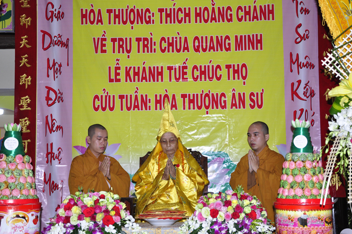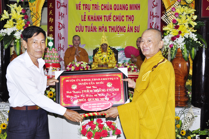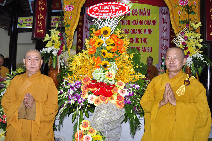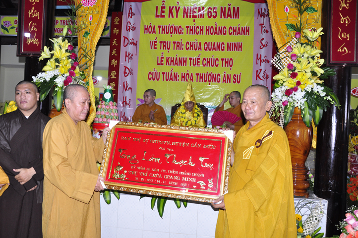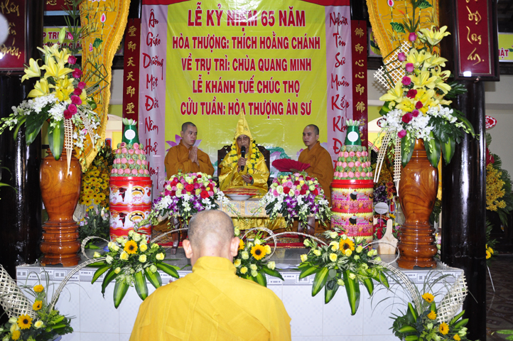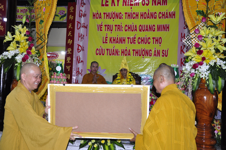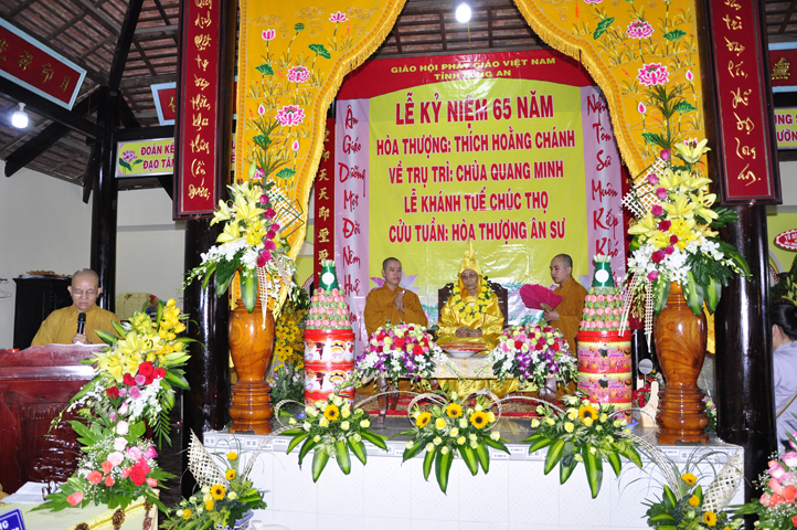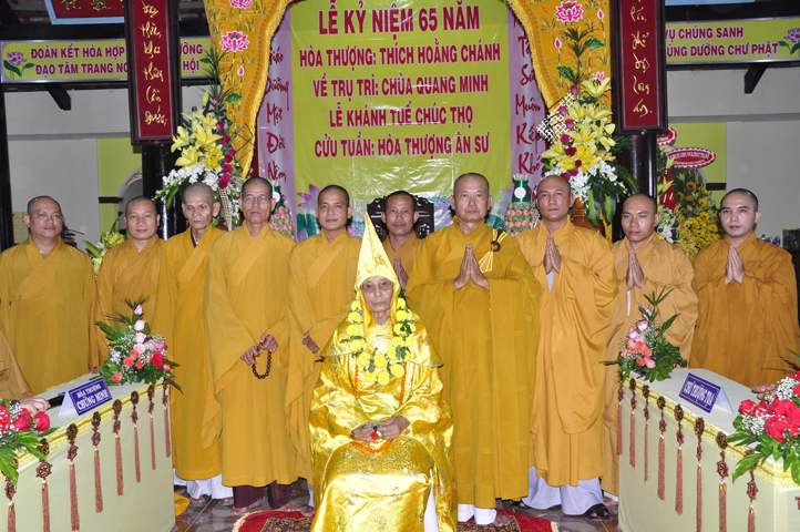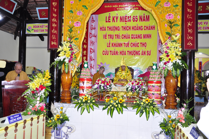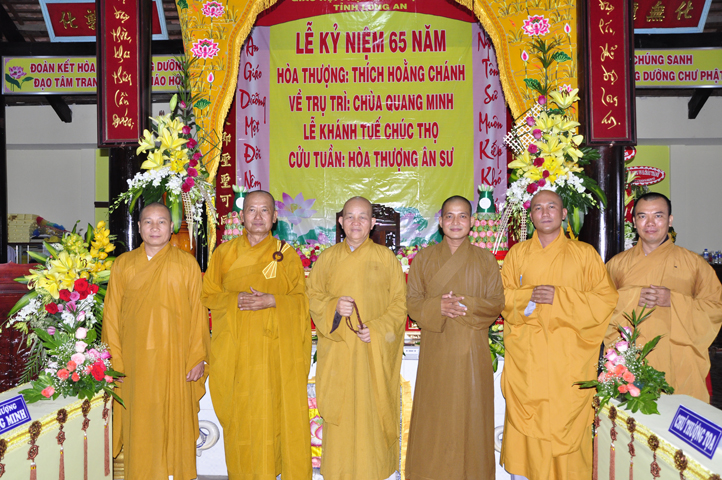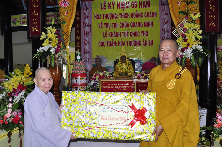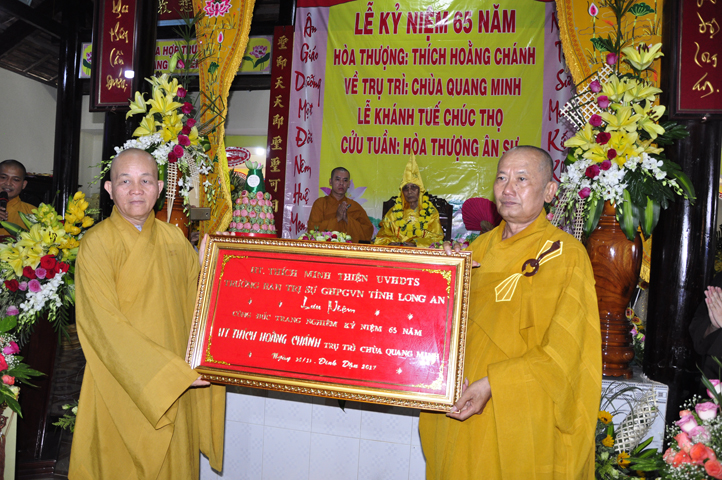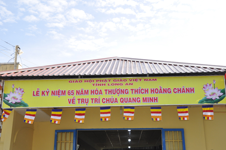 Nhằm ghi nhận công đức sâu dày, tấm gương giới hạnh trong sáng, hy sinh một đời cho Đạo pháp – Dân tộc, đặc biệt trong giai đoạn sơ kỳ Phật giáo Long An, có nhiều đóng góp cho giáo dục Phật giáo, đào tạo Tăng Ni, sáng ngày 31/12/2107 ( 14/11/ Đinh Dậu), BTS GHPGVN huyện Cần Đước, tứ chúng đệ tử của Hoà thượng thượng Hoằng hạ Chánh trang nghiêm tổ chức lễ kỷ niệm 65 năm trụ trì, khánh tuế Hoà thượng Ân Sư và công bố kế vị trụ trì chùa Quang Minh do BTS GHPGVN tỉnh Long quyết định.