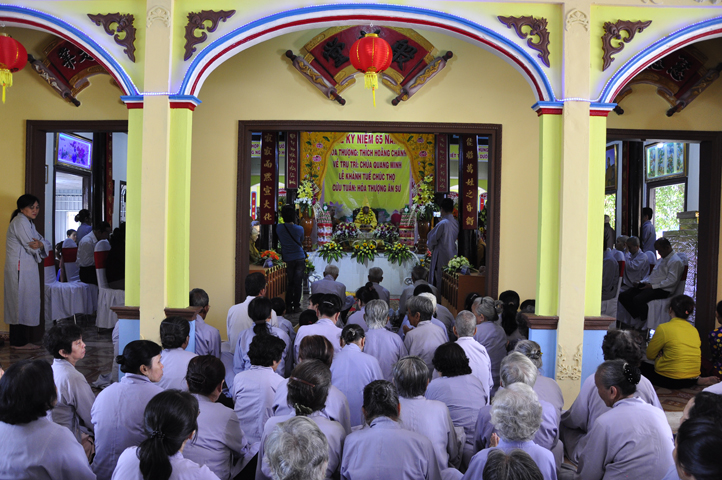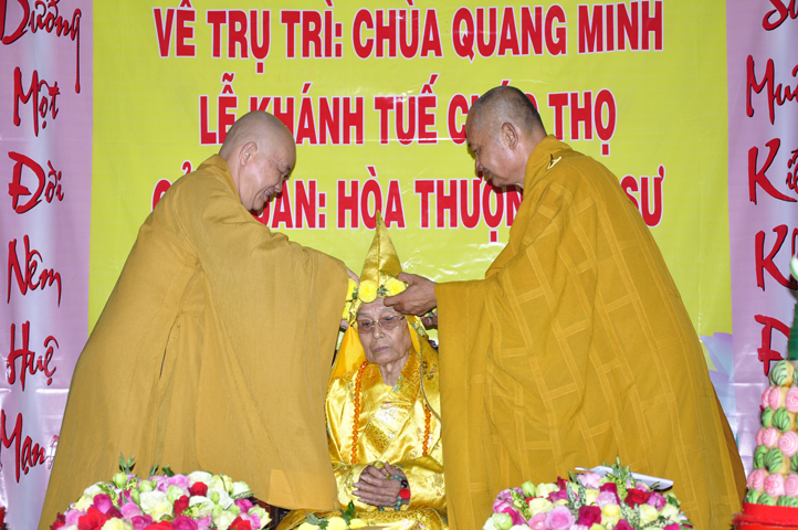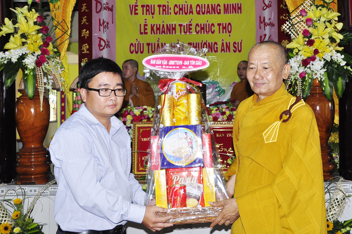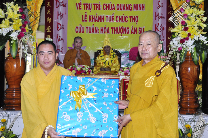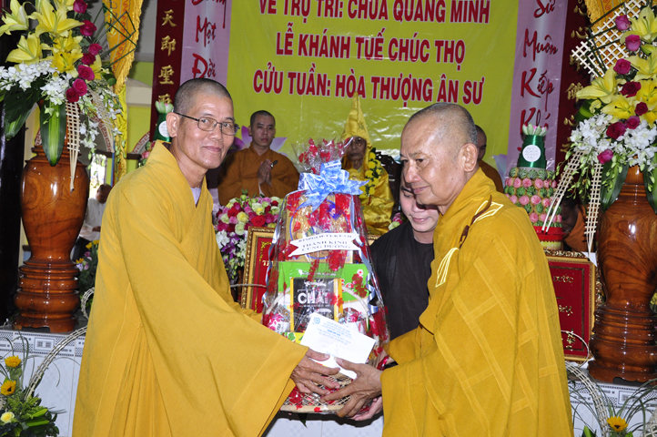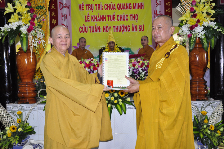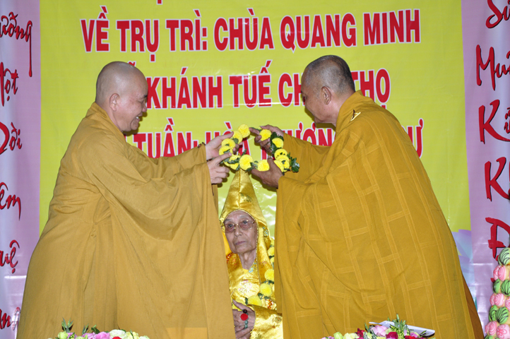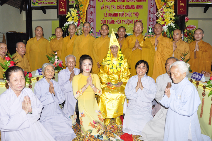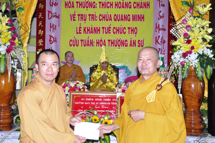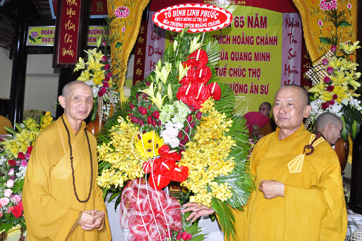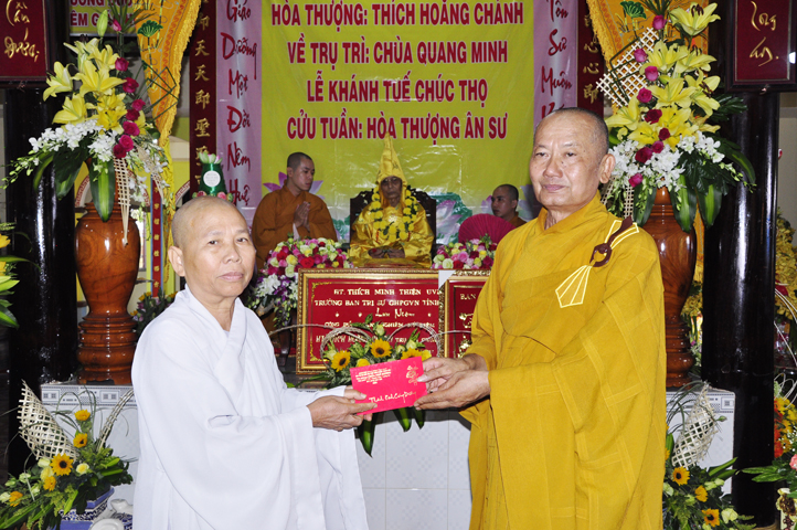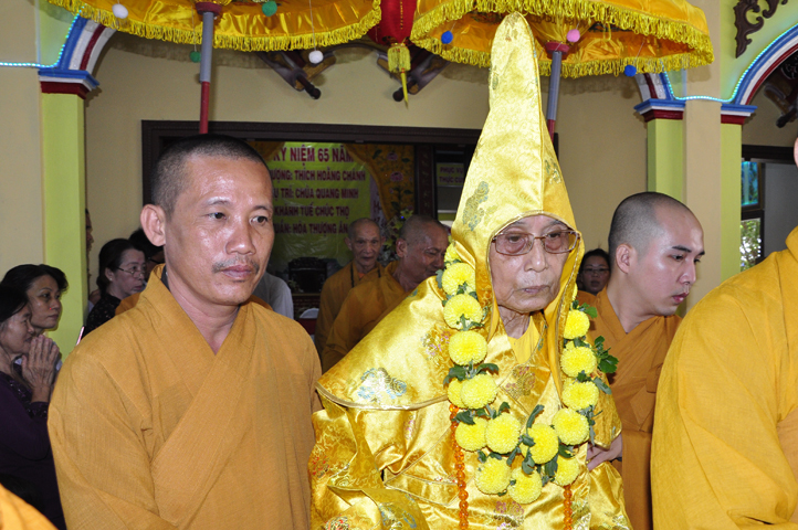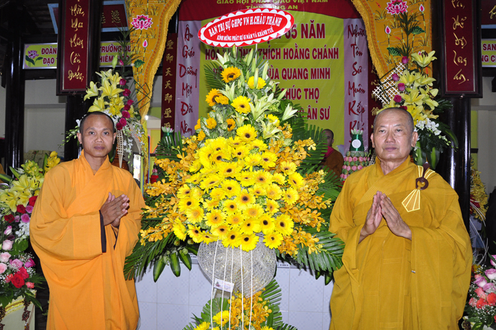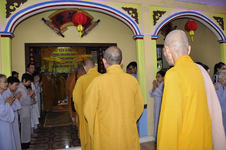 Nhằm ghi nhận công đức sâu dày, tấm gương giới hạnh trong sáng, hy sinh một đời cho Đạo pháp – Dân tộc, đặc biệt trong giai đoạn sơ kỳ Phật giáo Long An, có nhiều đóng góp cho giáo dục Phật giáo, đào tạo Tăng Ni, sáng ngày 31/12/2107 ( 14/11/ Đinh Dậu), BTS GHPGVN huyện Cần Đước, tứ chúng đệ tử của Hoà thượng thượng Hoằng hạ Chánh trang nghiêm tổ chức lễ kỷ niệm 65 năm trụ trì, khánh tuế Hoà thượng Ân Sư và công bố kế vị trụ trì chùa Quang Minh do BTS GHPGVN tỉnh Long quyết định.