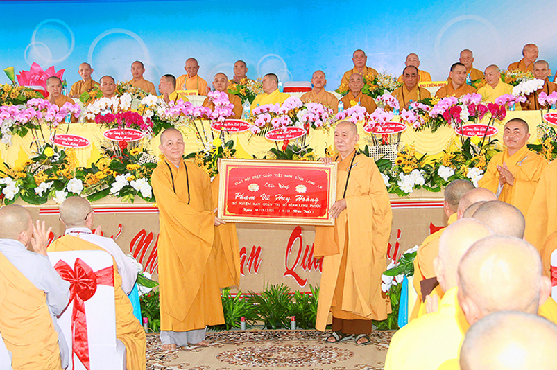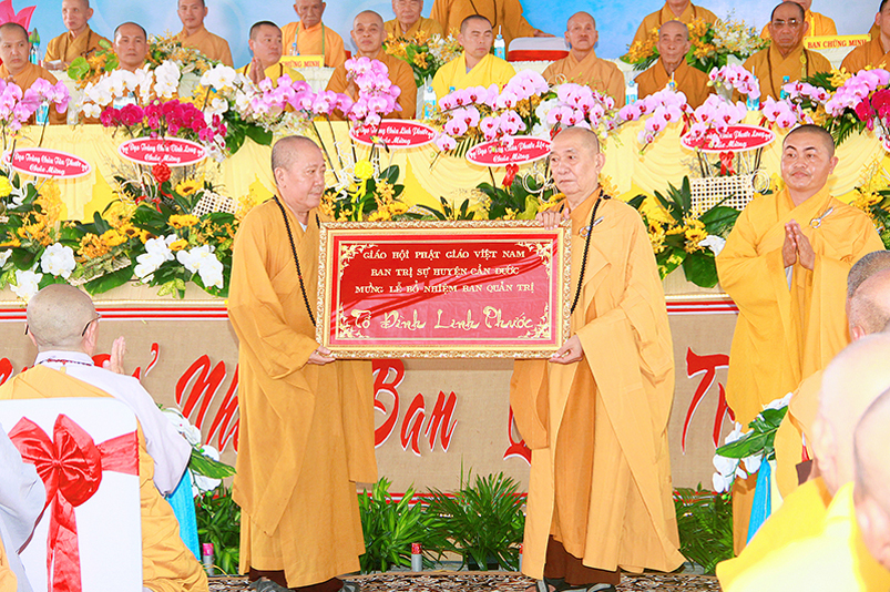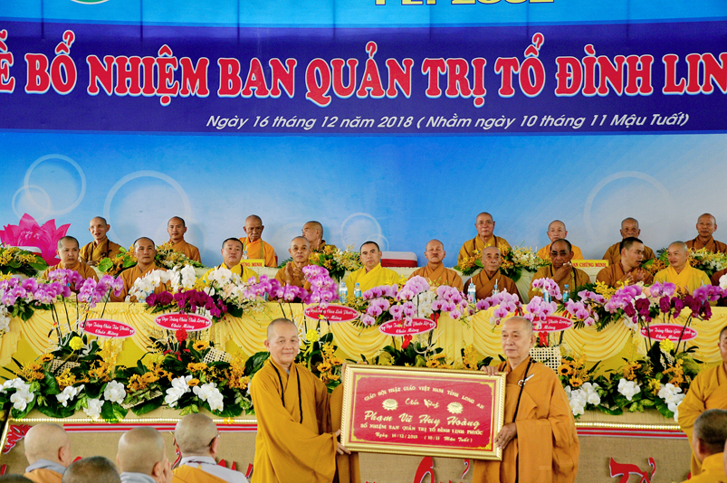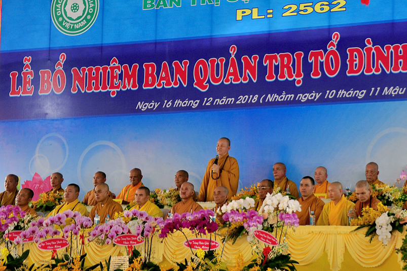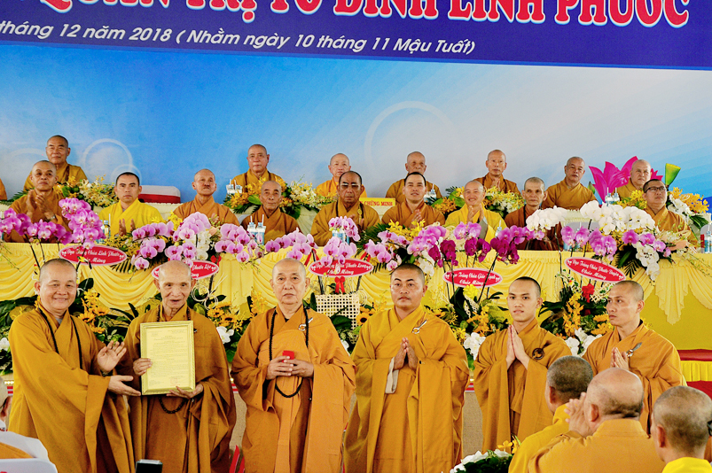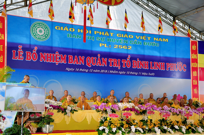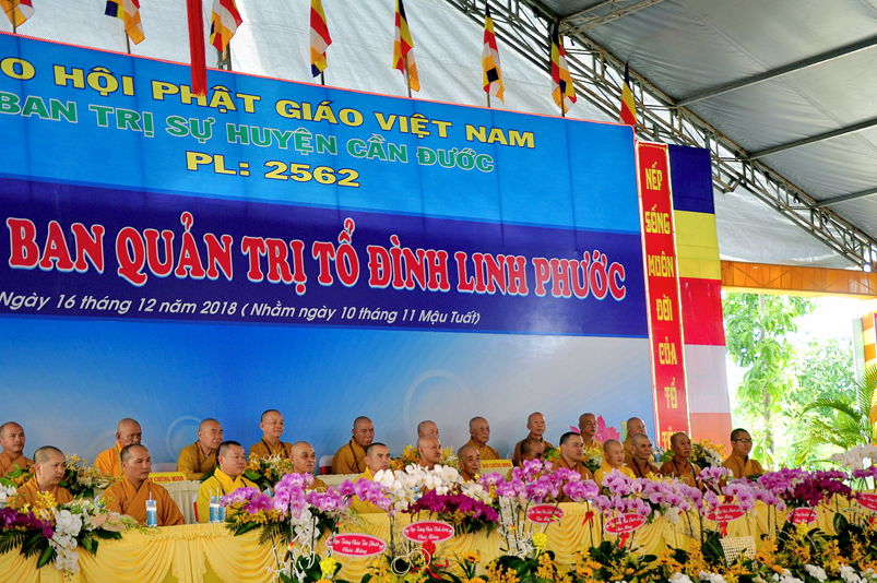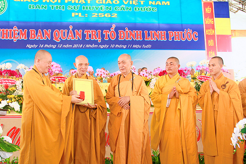 Trong buổi lễ, với sự hoan hỷ vô tận, Hòa thượng Trưởng BTS GHPGVN Tỉnh Long An, Thượng Minh Hạ Thiện, đã ban lời đạo từ chúng minh, Hòa thượng lần nữa đề cao giá trị cao quý của tinh thần “ Truyền đăng tục diệm” Ngài nhắc lại quá trình hình thành lịch sử của ngôi Tổ đình, trải qua hơn 100 năm lịch sử, truyền thừa qua 5 đời Trụ trì, với những biến cố từ chiến tranh. Ngôi Tổ đình đã bị hư hoại hoàn toàn và được tái lập ở một vị trí khác trong vùng đất gần cạnh. Hôm nay đây với long khát khao lưu lại dấu ấn ngôi Cổ tự xưa, mà nhị vị Hòa thượng trưởng tử của Cố Hòa thượng Thượng Tâm hạ Nhựt, trụ trì Chùa Linh Phước khi xưa, đã trùng tu lại ngôi Tổ đình trên vùng đất khi xưa. Hòa thượng sách tấn Tăng Ni Phật tử cần cố sức tu tập để phát triển ngôi Tổ đình ngày thêm hưng thịnh, thực hiện tốt giá trị nhân văn cao đẹp của Phật giáo, trong thời kì hội nhập, Phật giáo đồng hành cùng dân tộc. Cuối lời Hòa thượng chúc mừng Tân Ban Quản Trị Tổ đình Linh Phước, cầu nguyện chư Phật mười phương gia hộ cho Phật sự chốn tòng lâm Linh Phước mãi mãi được trường lưu.