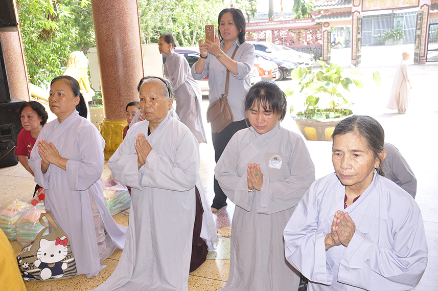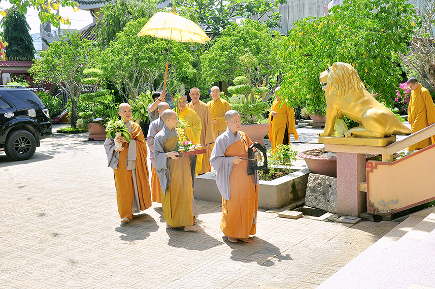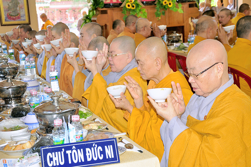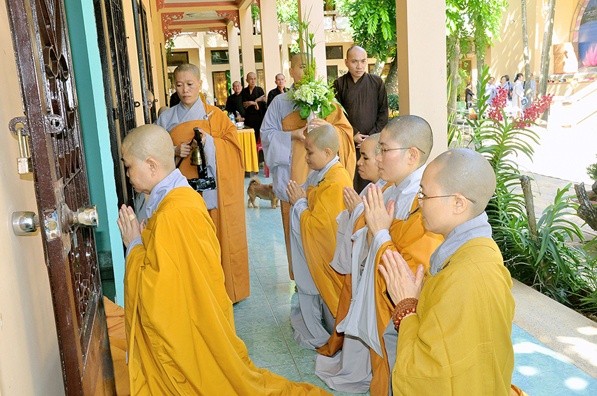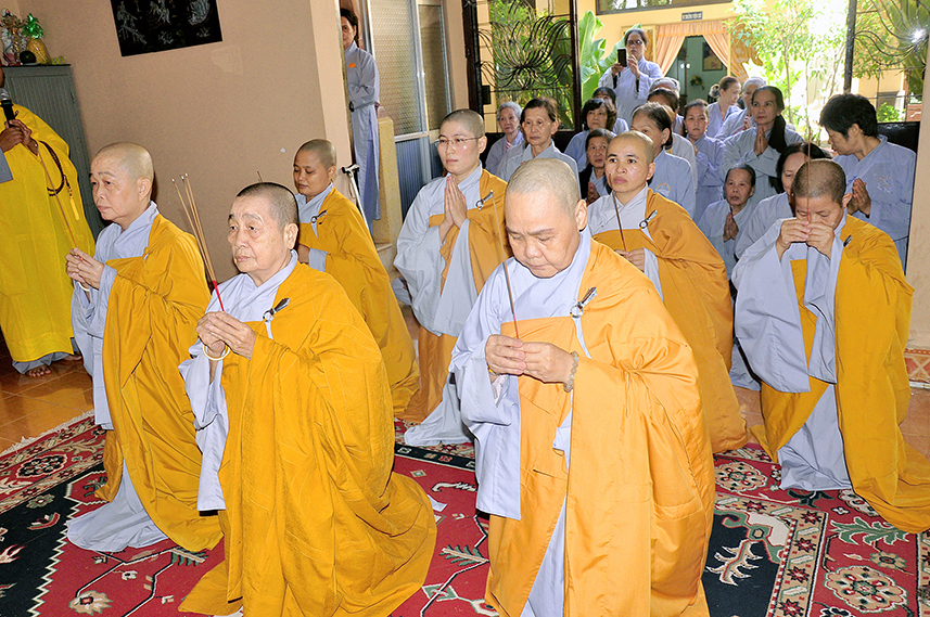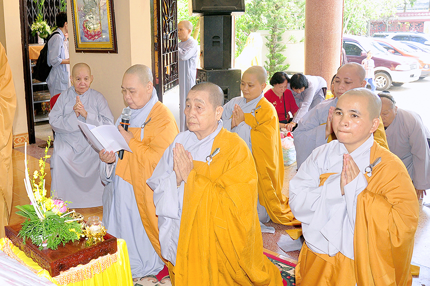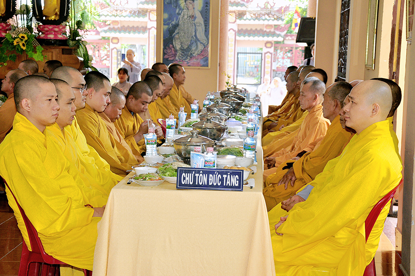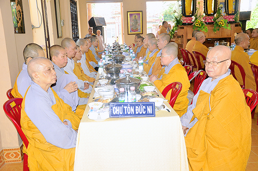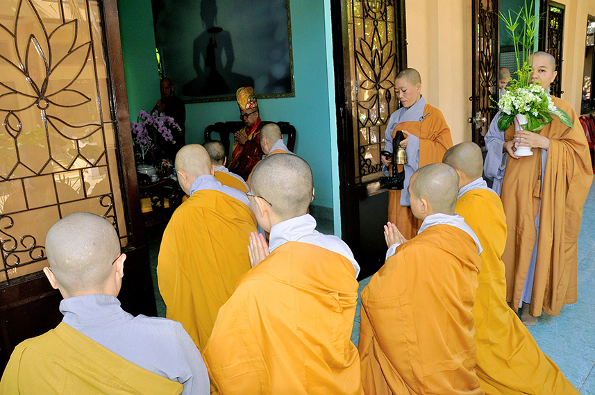 Sau lời đạo từ, chư Tôn đức tiến hành nghi thức trai đường, chư Ni pháp quyến đảnh lễ cúng dường và hướng dẫn Phật tử nhiễu đàn dâng tứ sự.