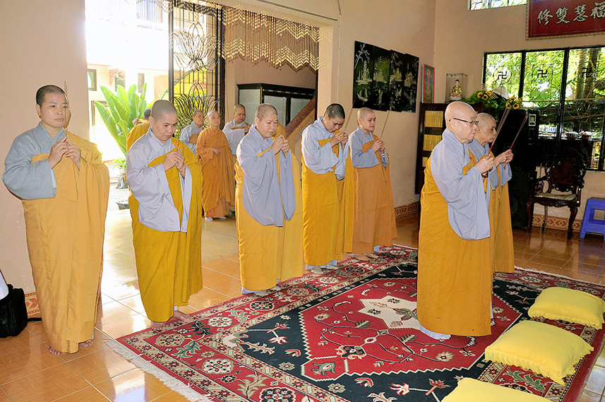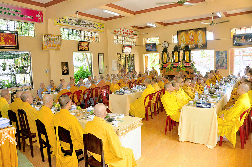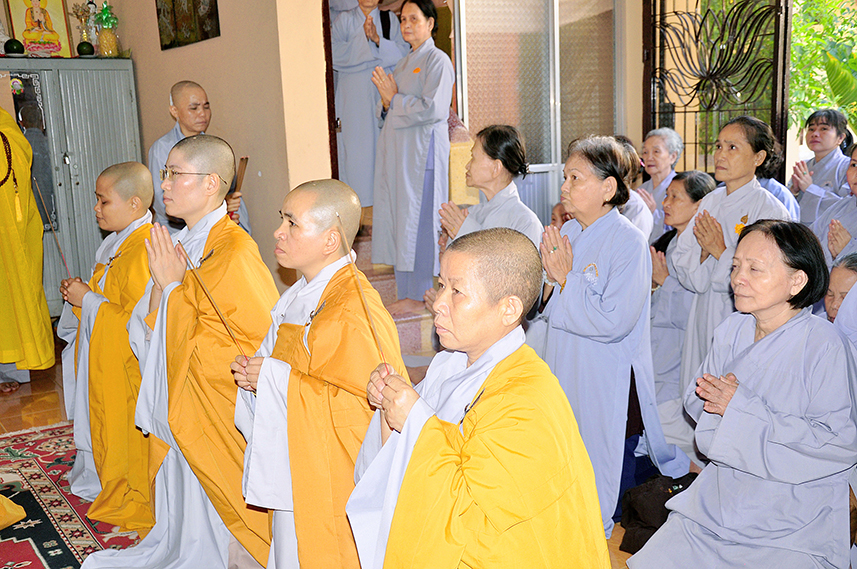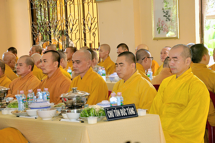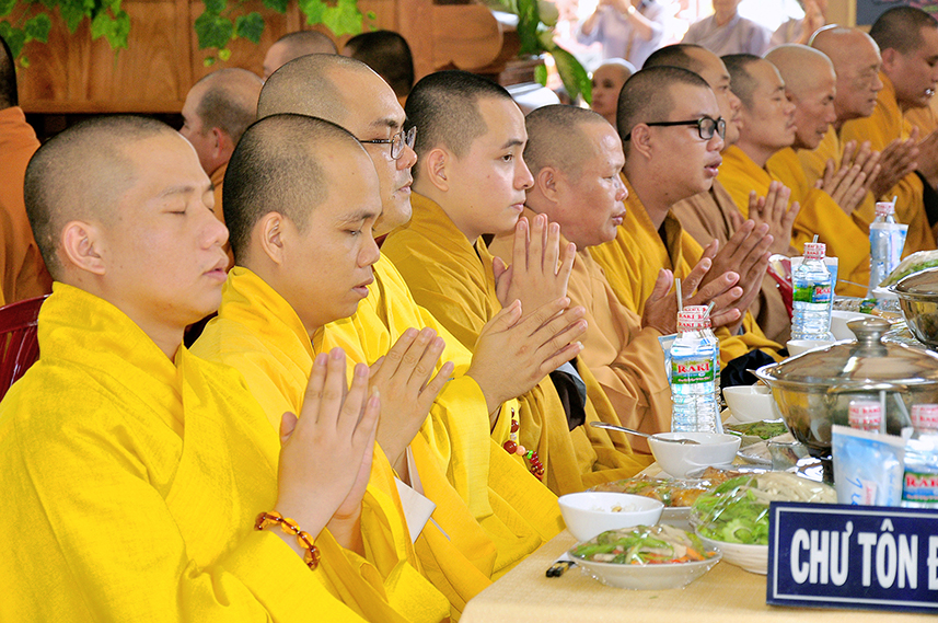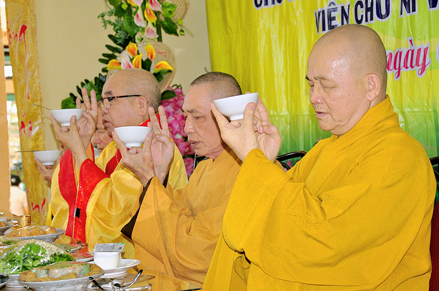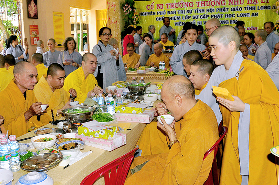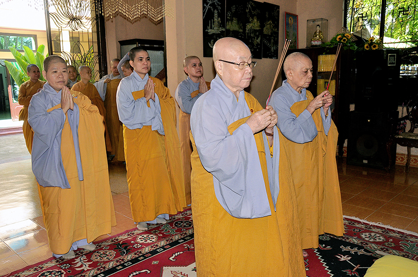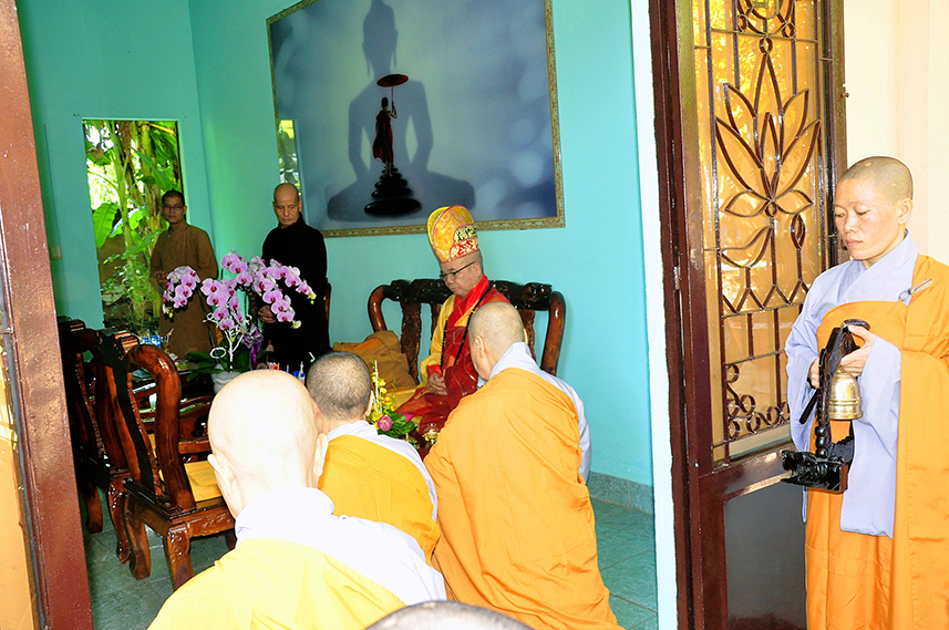 Sau lời đạo từ, chư Tôn đức tiến hành nghi thức trai đường, chư Ni pháp quyến đảnh lễ cúng dường và hướng dẫn Phật tử nhiễu đàn dâng tứ sự.
