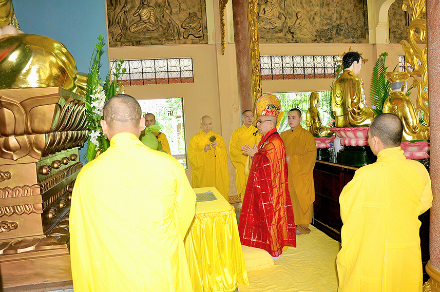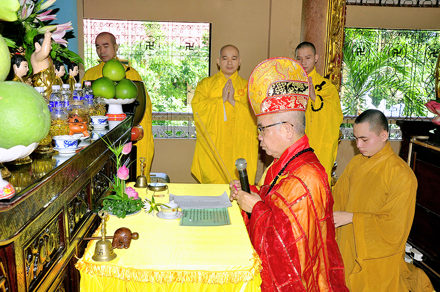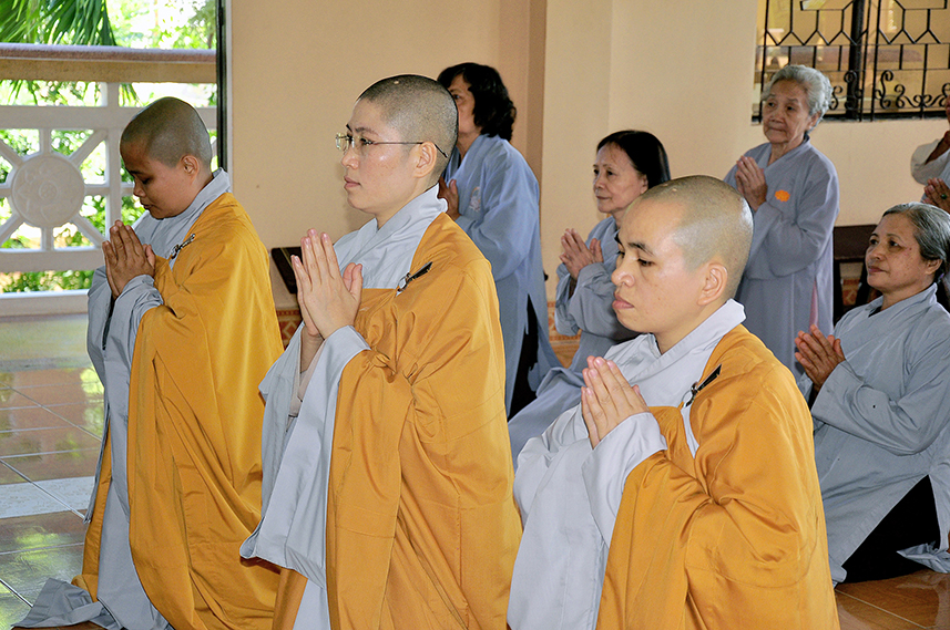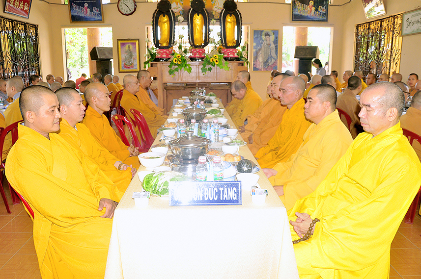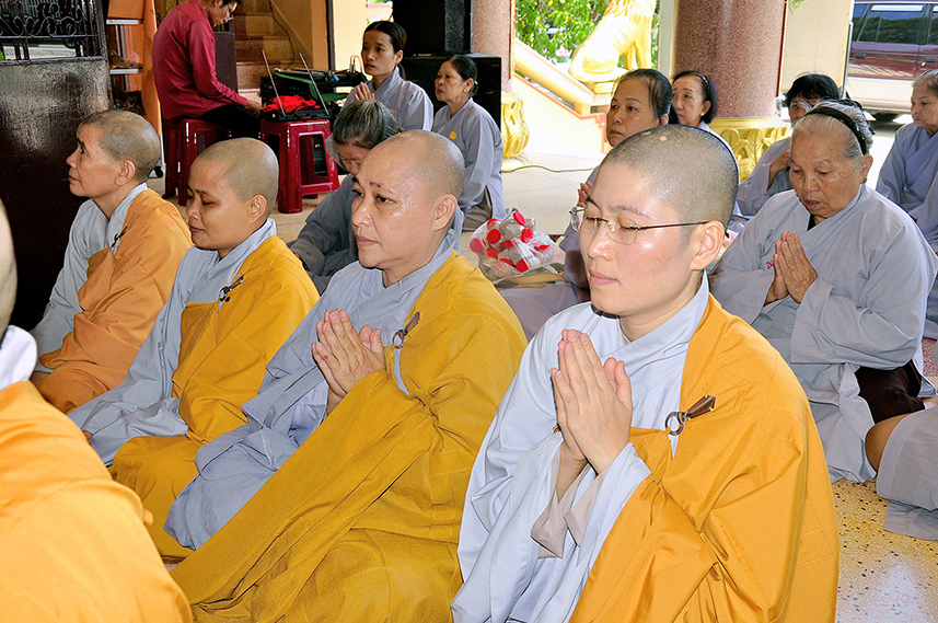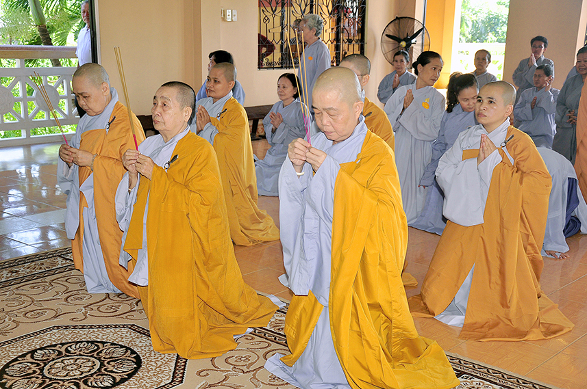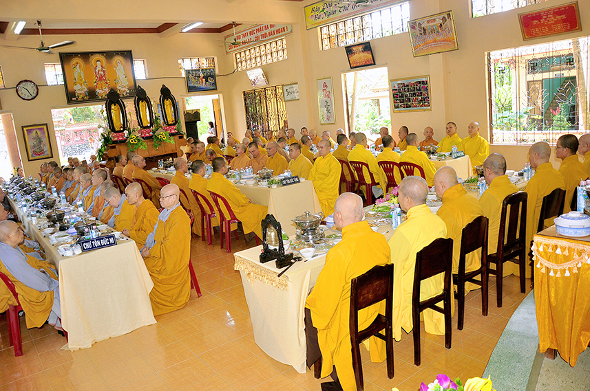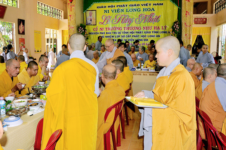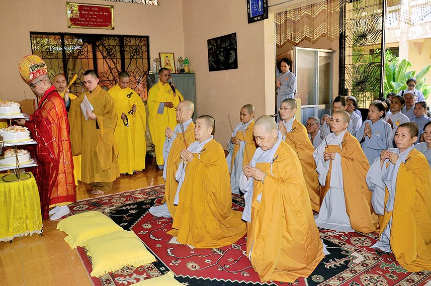 Sau lời đạo từ, chư Tôn đức tiến hành nghi thức trai đường, chư Ni pháp quyến đảnh lễ cúng dường và hướng dẫn Phật tử nhiễu đàn dâng tứ sự.