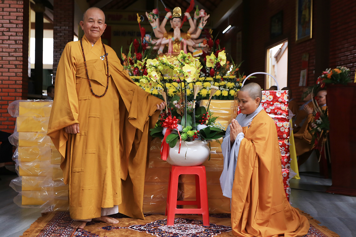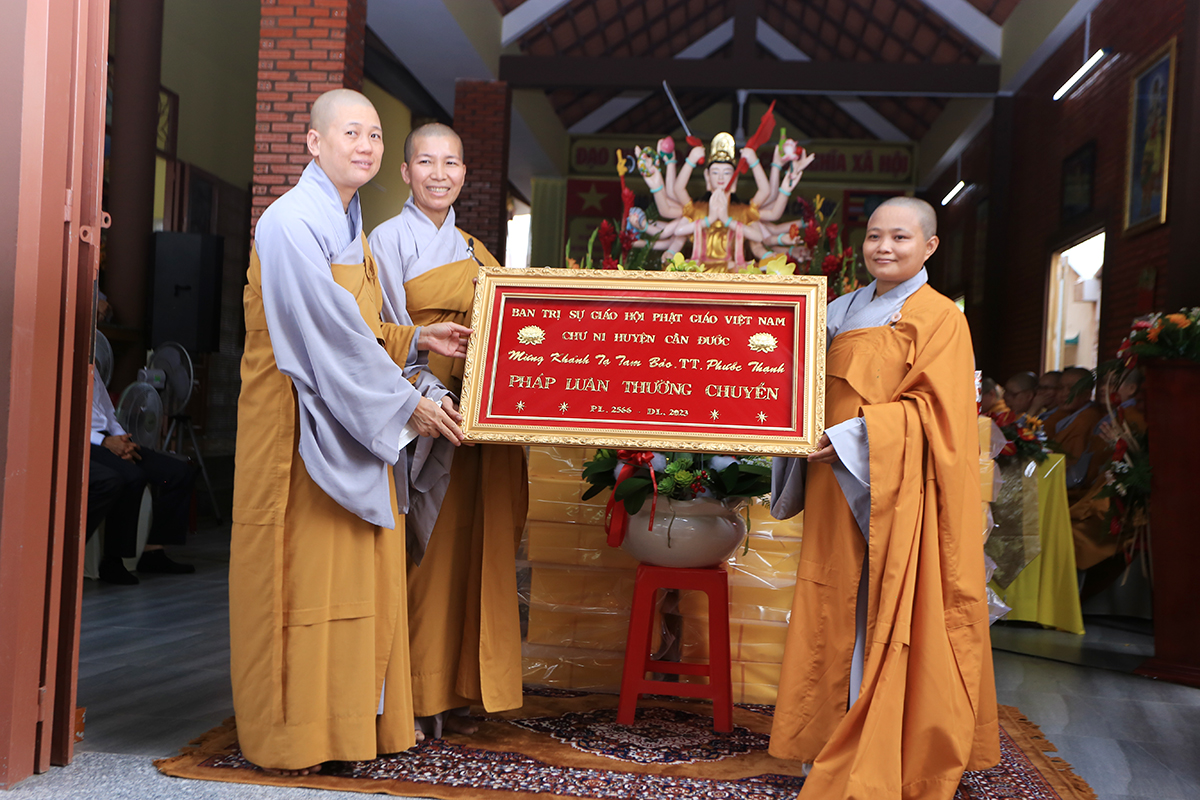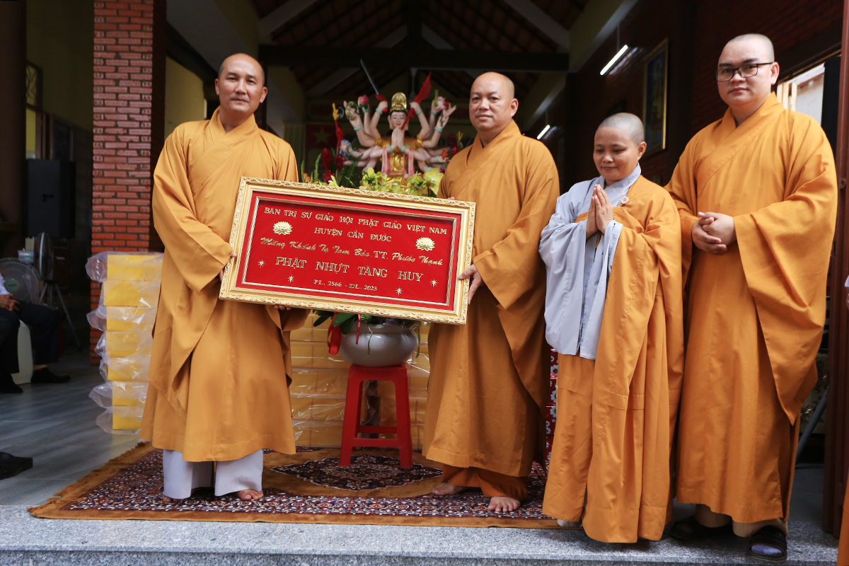 Sư Cô Trụ trì Tịnh thất Phước Thạnh đã hoan hỷ đón nhận nhiều phần quà, khánh vàng, lẵng hoa tươi thắm từ chư tôn đức BTS GHPGVN tỉnh Long An, BTS GHPGVN huyện Cần Đước và Chư tôn đức các Trú xứ thân cận chúc mừng.