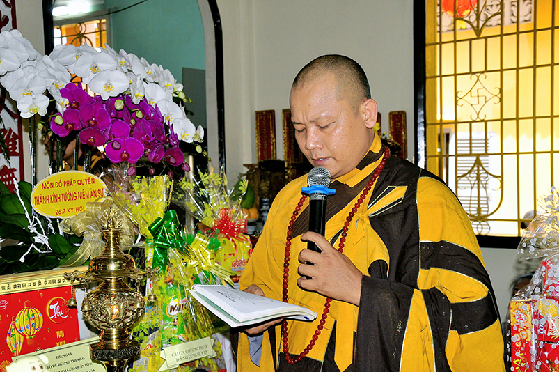 Mở đầu chương trình buổi lễ, đại diện Ban tổ chức ĐĐ.Thích Tắc Hiền tuyên đọc cảm niệm công đức của Hòa thượng, Vị ân sư đã từng dày công tiếp nối, truyền thừa phát triển mạng mạch Phật Pháp của tỉnh Long An, tu tạo ngôi chùa Bồ Đề, và thâm ân cao cả của mẹ cha, Đồng thời cũng đề cao nét đẹp của ngày lễ tri ân Báo hiếu mà Chư Phật từ ngàn xưa chỉ dạy và đã trở thành truyền thống tốt đẹp của Dân tộc Việt Nam.