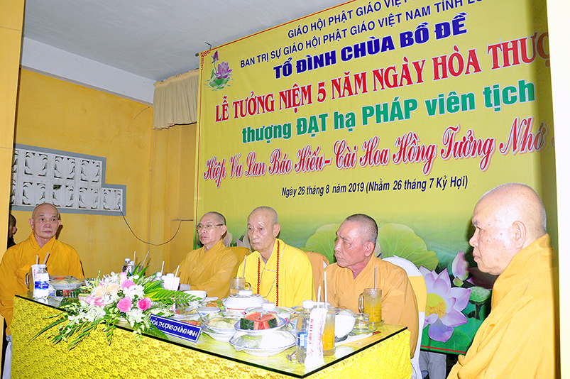 Sáng nay, ngày 26 tháng 08 năm 2019 (ngày 26 tháng 07năm Kỉ Hợi), Tổ đình chùa Bồ Đề, xã Tân Kim, huyện Cần Giuộc, tỉnh Long An trọng thể tổ chức Lễ Húy kị lần thứ năm của Cố Trưởng lão Hòa thượng thượng Đạt hạ Pháp – Nguyên Ủy viên Ban Thường trực Hội Đồng Chứng Minh Giáo hội Phật giáo Việt Nam, Chứng minh Ban Trị sự Giáo hội Phật giáo Việt Nam tỉnh Long An, Chứng minh Đạo sư Thiên Thai Giáo Quán Tông. Trang trọng thiết lễ Vu Lan, cài hoa hồng tưởng nhớ tứ ân, dâng cúng Pháp y Ca sa.