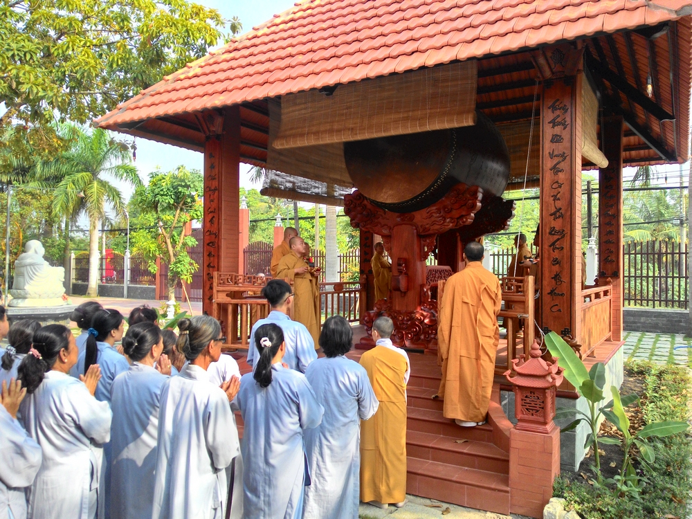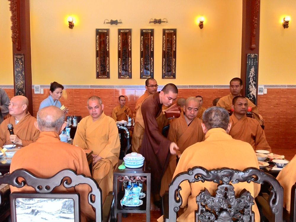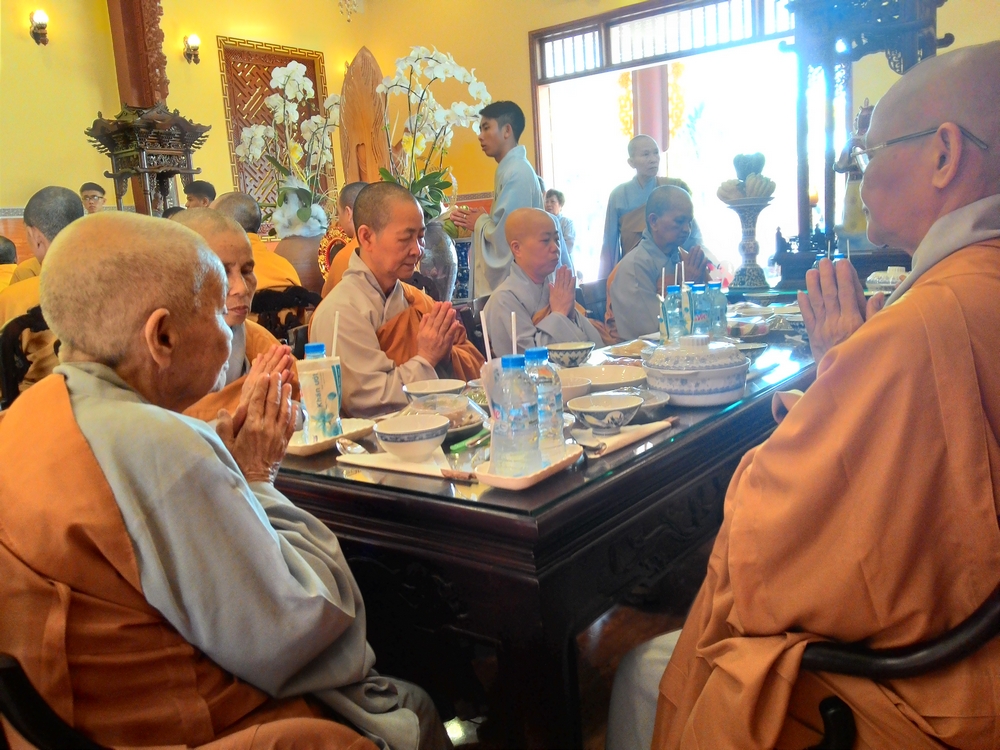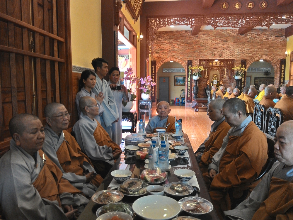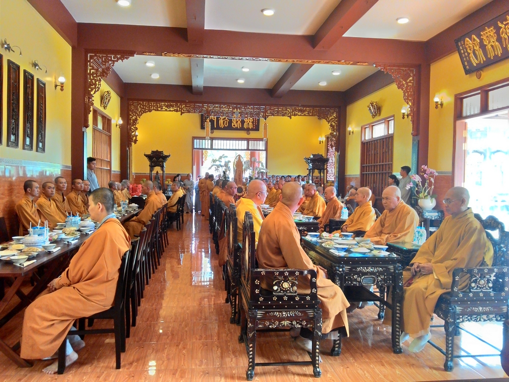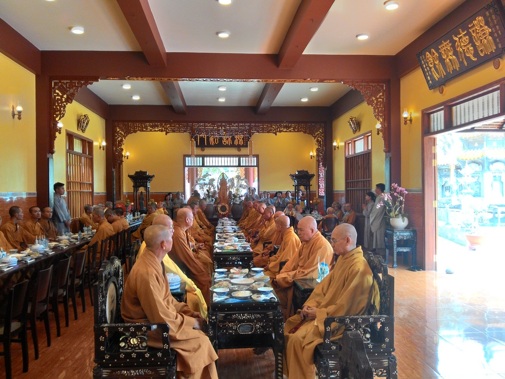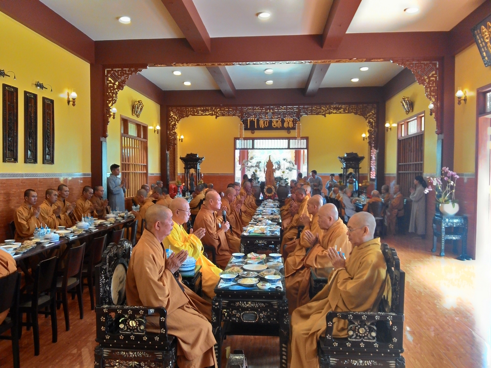 Vào lúc 8 giờ ban nghi lễ cung thỉnh chư Tôn đức ban kinh sư quang lâm bảo điện khai kinh sái tịnh cho lầu trống – giảng đường vừa hoàn thành đồng thời cúng ngọ tiến sư. Tiếp đến thỉnh chư tôn đức Tăng Ni thắp hương tưởng niệm cố Đại Lão Hòa Thượng và thiết lễ trai tăng cúng dường.