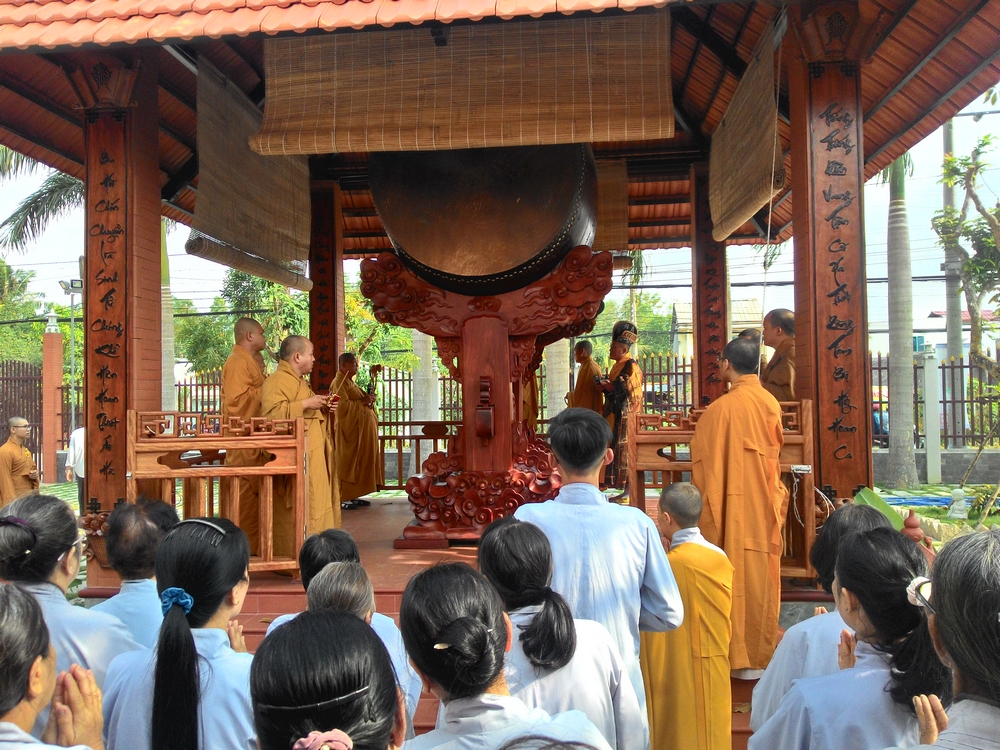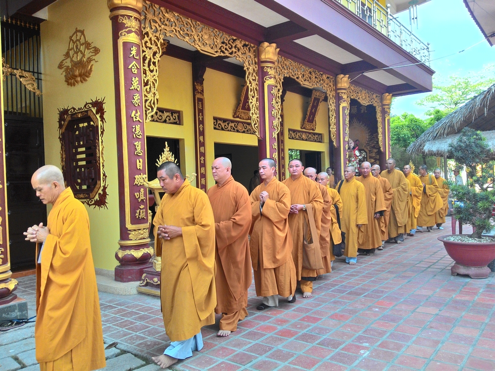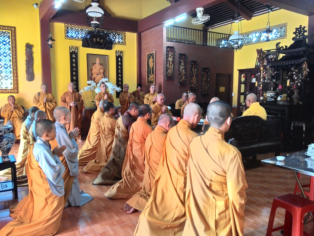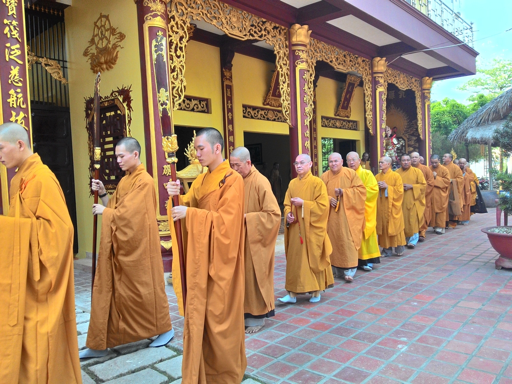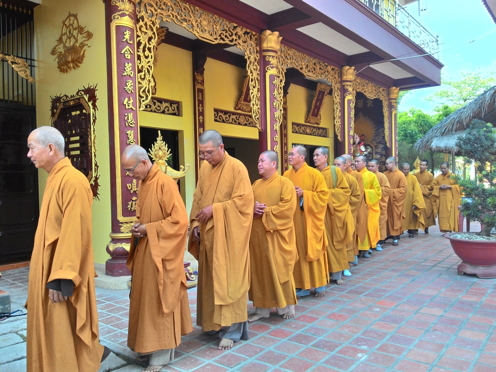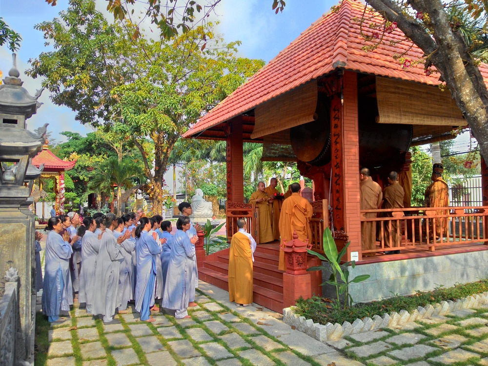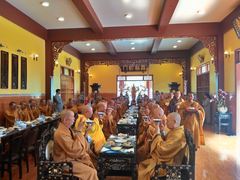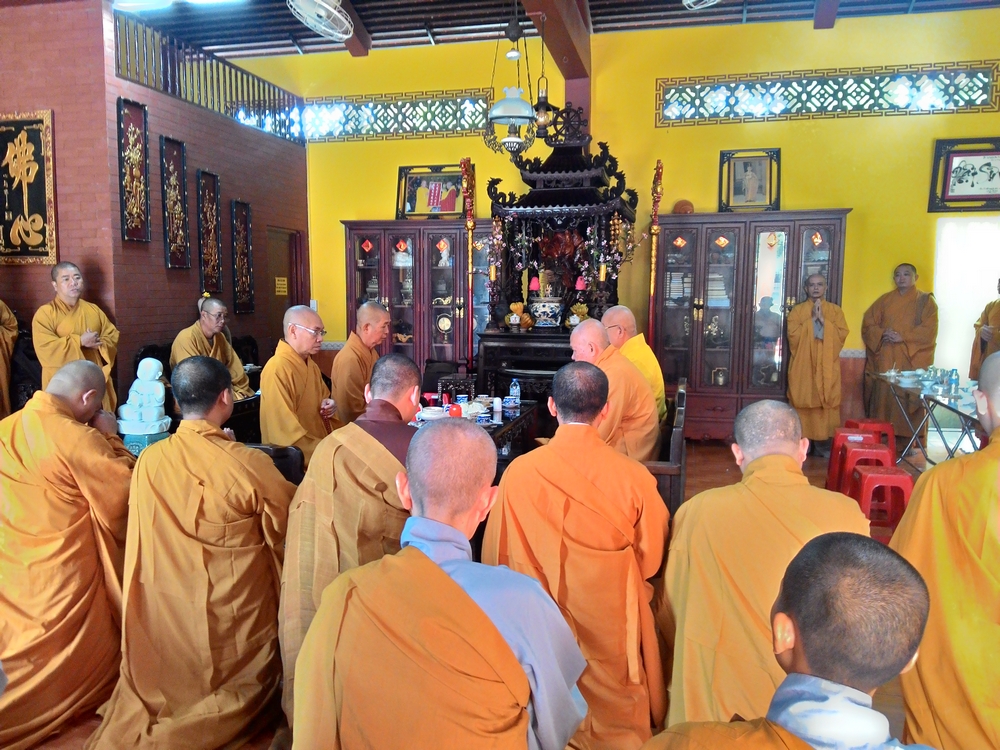 Vào lúc 8 giờ ban nghi lễ cung thỉnh chư Tôn đức ban kinh sư quang lâm bảo điện khai kinh sái tịnh cho lầu trống – giảng đường vừa hoàn thành đồng thời cúng ngọ tiến sư. Tiếp đến thỉnh chư tôn đức Tăng Ni thắp hương tưởng niệm cố Đại Lão Hòa Thượng và thiết lễ trai tăng cúng dường.