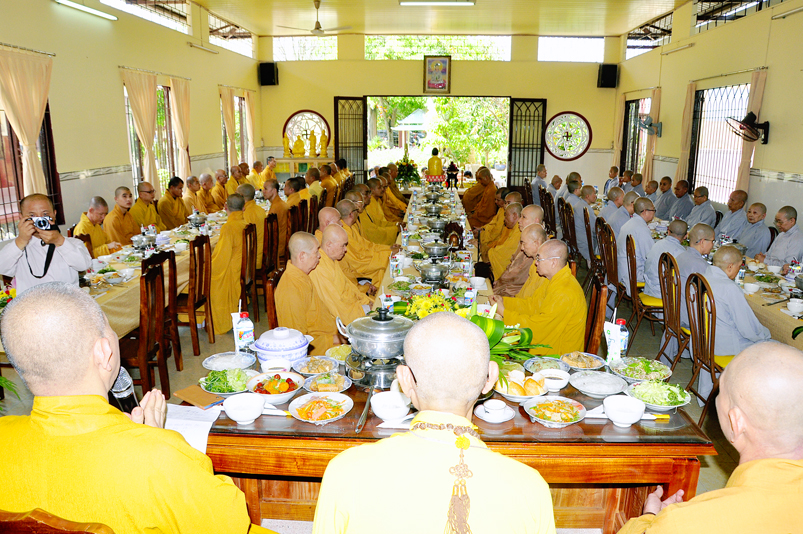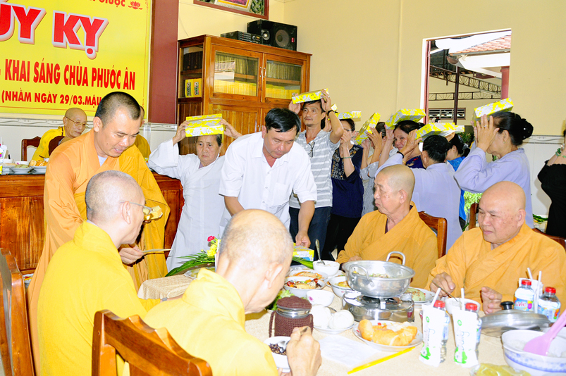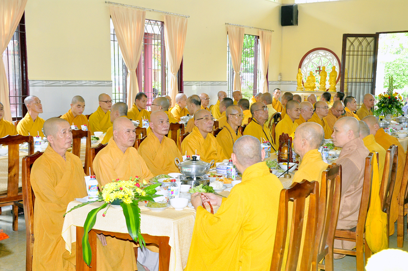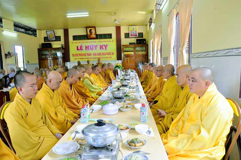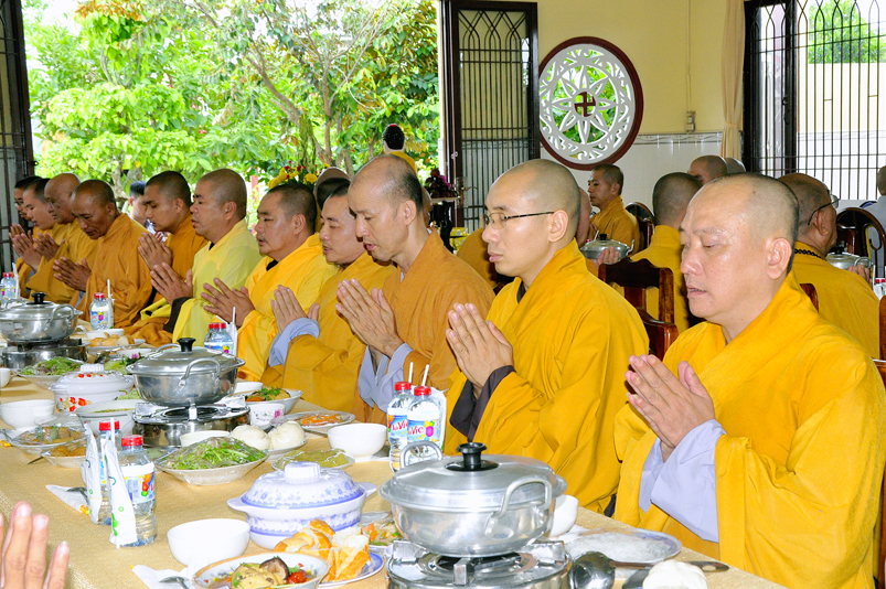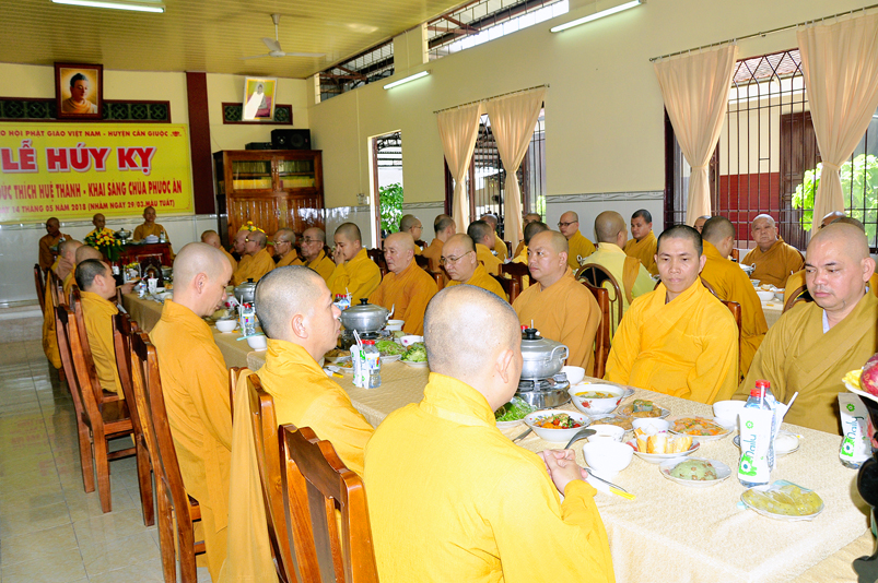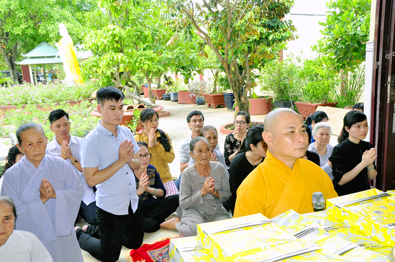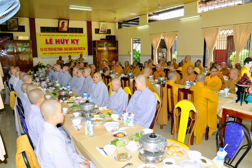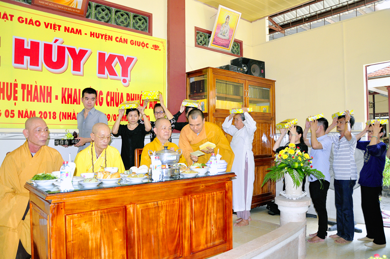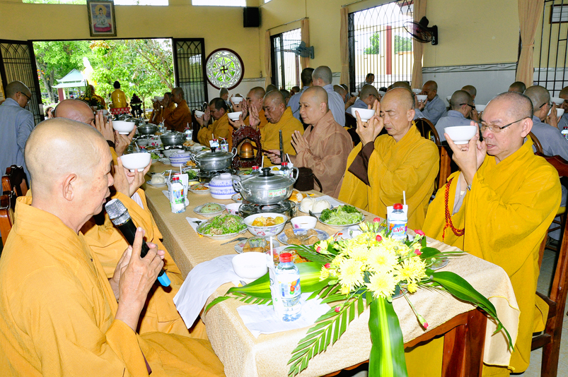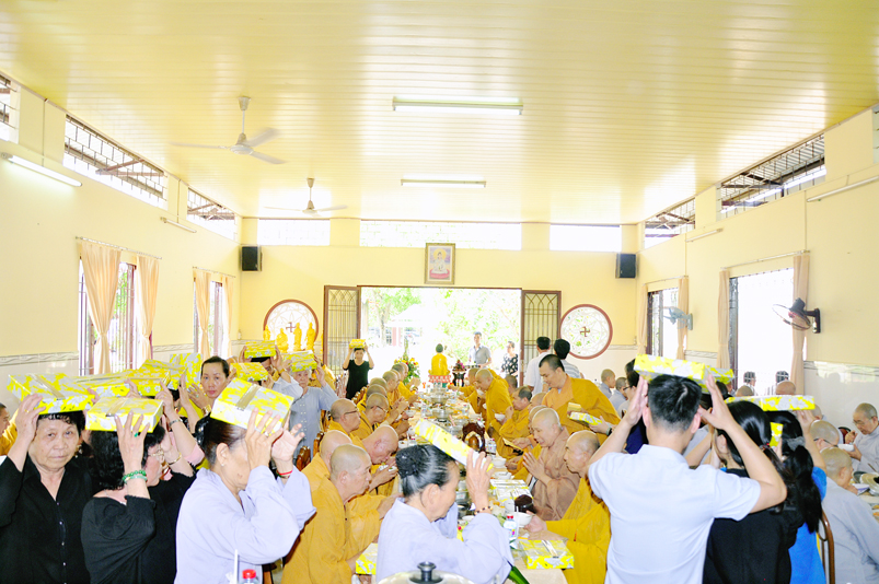 Trước lễ đường, chư tôn giáo phẩm chứng minh và quý nam nữ Phật tử đã thiết lễ cúng Ngọ, thành kính niêm hương tưởng niệm công đức của cố Đại Đức Thích Huệ Thành. Sau đó, Đại đức Thích Minh An- Phó trụ trì chùa tác pháp cúng dường Trai Tăng.