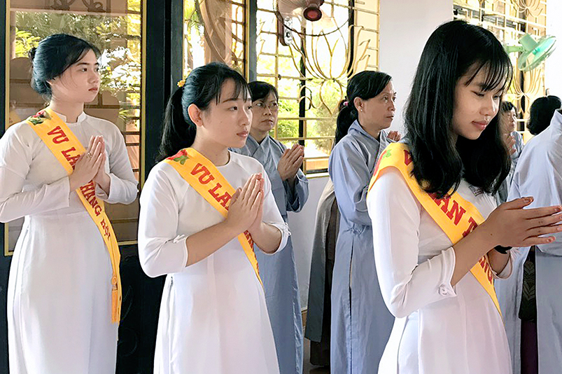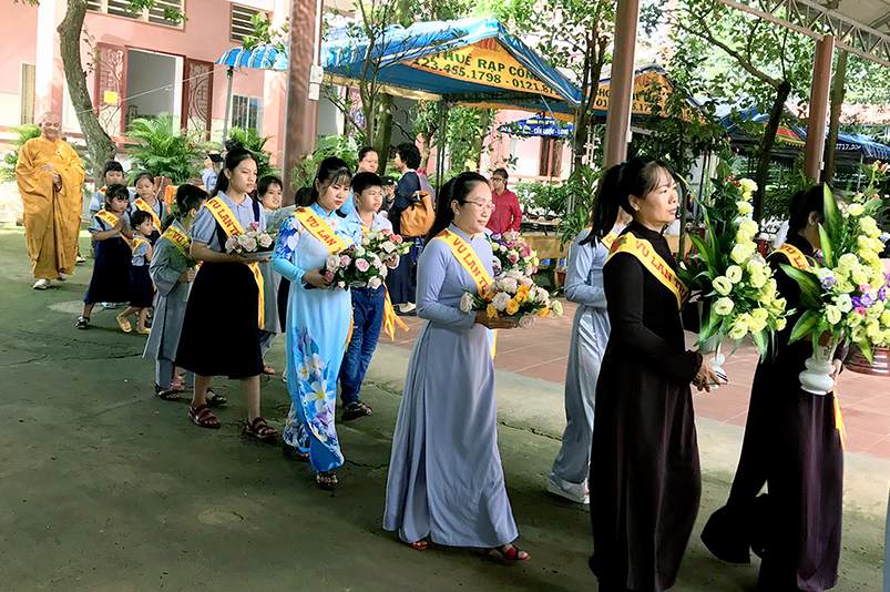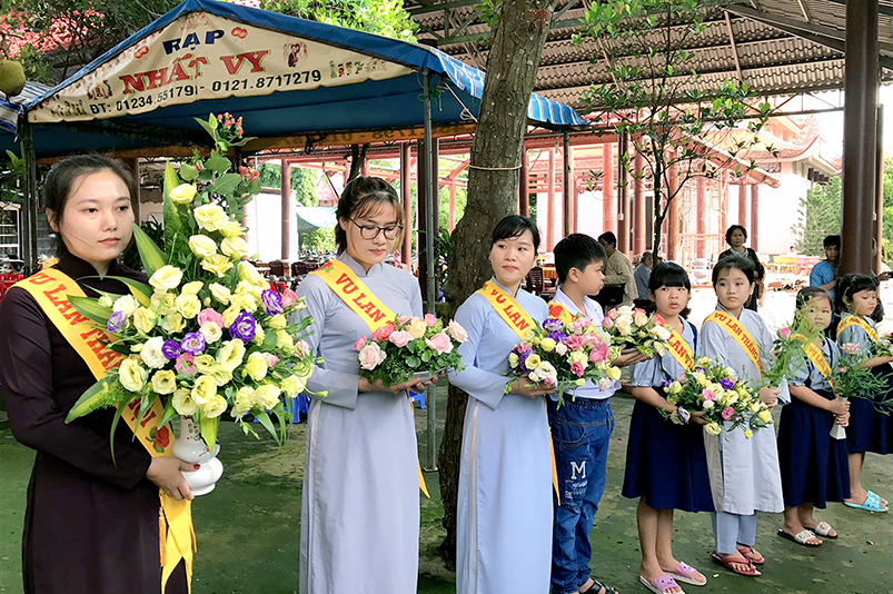 Một hoa hồng được cài lên ngực áo, một ánh nhìn khắc khoải chờ mong chan chứa tình thương sâu đậm. Nghi thức Cài hoa hồng và nhiễu hành dâng Pháp y tại giảng đường Tôn Vân được diễn ra trong không khí trang nghiêm đầm ấm tình đạo pháp. Tiếp đó, Sư cô An Diệu đãi lao Ân sư – Ni sư Thích Tắc Đức, kính dâng lời tác bạch Vu Lan, hoài niệm 45 năm ngày Cố Sư cô Diệu Ân vắng bóng.