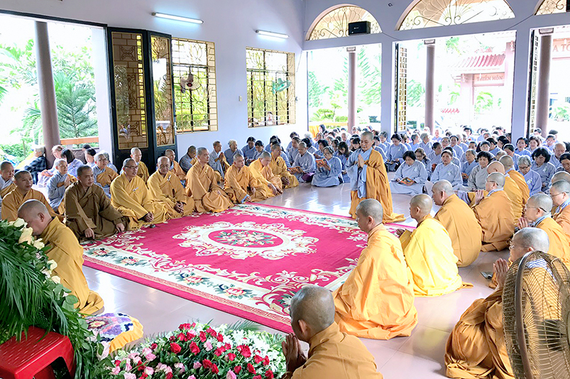 Mở đầu cho mùa Vu Lan Báo hiếu tại huyện Cần Giuộc, trong tiết mùa thu hòa quyện tình đạo vị, Hòa thượng Thích Minh Thiện thân lâm pháp tòa ân cần thăm hỏi, vấn an đại chúng và ban thời pháp thoại hàm nghĩa nhân văn sâu sắc. Với tất cả những điều tâm đắc trên lộ trình tu tập, Hòa thượng phổ hóa hình ảnh La Bốc (tên gọi sinh thời của tôn giả Mục Kiền Liên) biểu trưng tâm hạnh hiếu của một người con Phật, chí thành dùng mọi phương tiện cảm độ mẹ hiền. Dù trong nghịch cảnh mẫu thân bị sai đường đọa lạc ba đường ác, tôn giả vẫn hết lòng báo đáp ân dưỡng dục, nương thần lực Phật vào tận chốn A-tỳ cứu độ Mẹ hiền. Thời pháp thoại ngắn nhưng đầy ý vị thâm tình, Hòa thượng đã nhắn gởi đến mọi người con Phật trong hiện tại muốn báo đáp ân sâu của Cha Mẹ, thì hãy thực hiện noi gương ngài La Bốc (Mục Kiền Liên), hãy dành thời gian tạo phương tiện để song thân có dịp hướng tâm, nuôi dưỡng tâm hiền thiện, quy kính Tam Bảo, được niềm vui trong chánh pháp. Đó là món quà tinh thần hiếu hạnh trân trọng nhất mà kinh Vu Lan, kinh Mục Liên Sám pháp đã nêu.