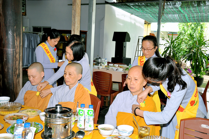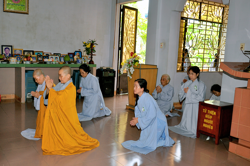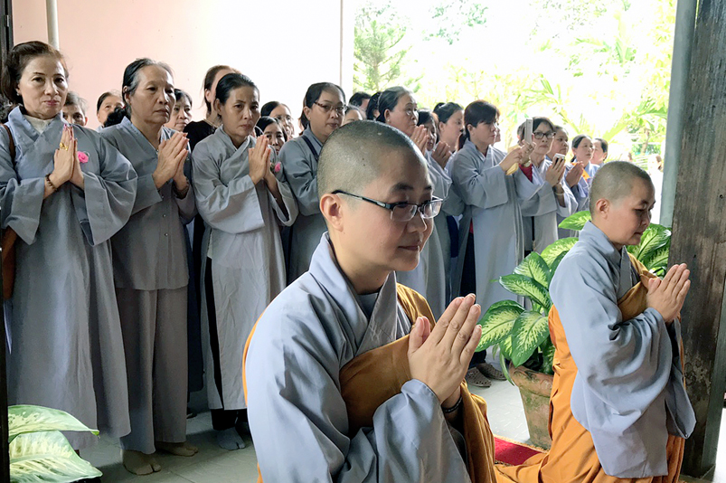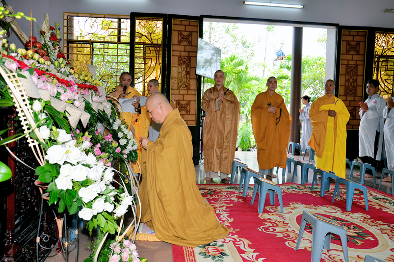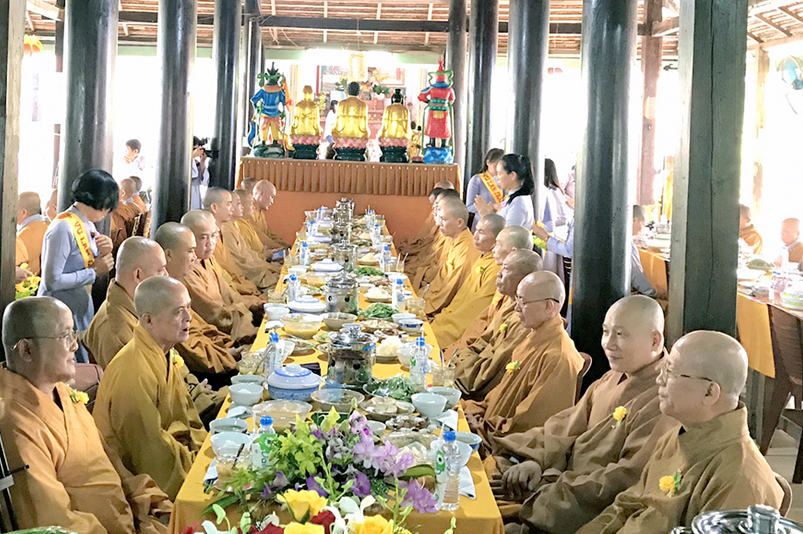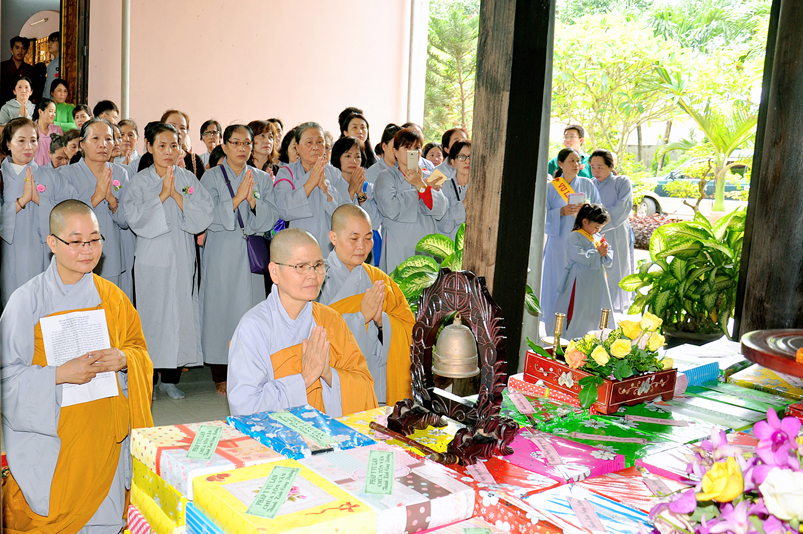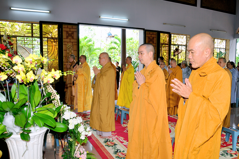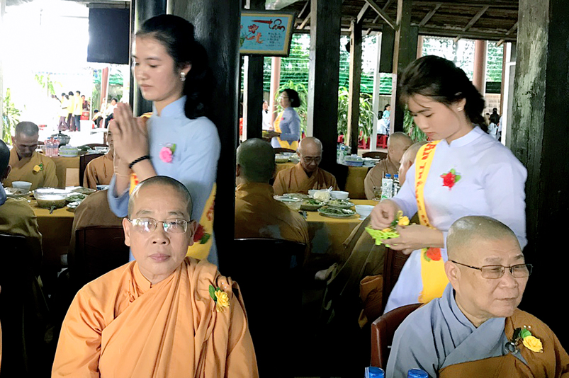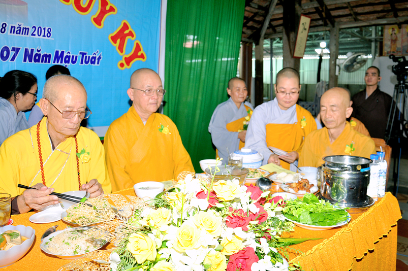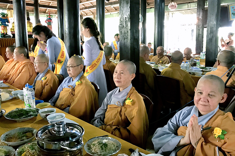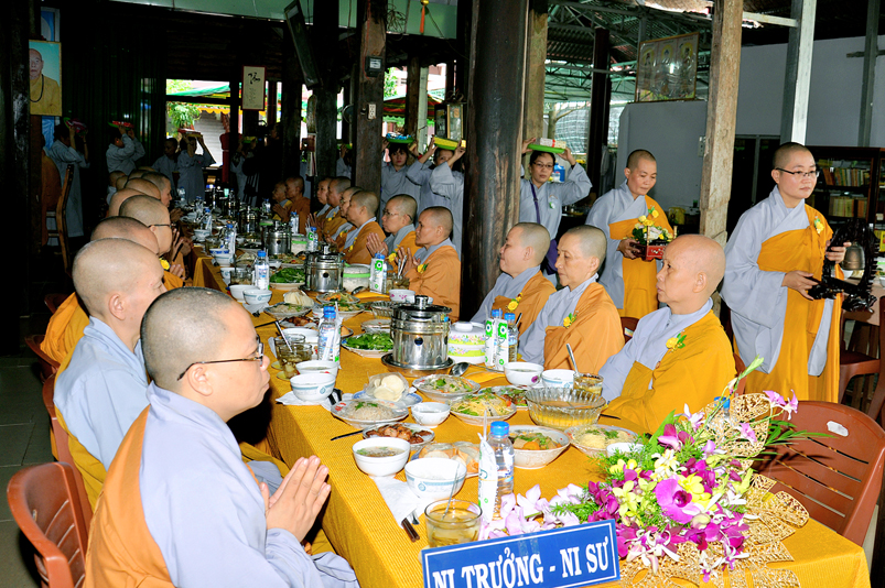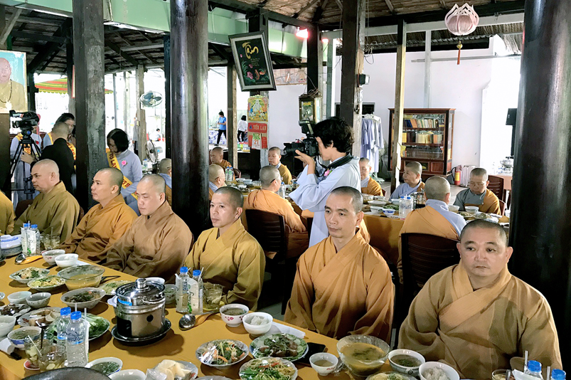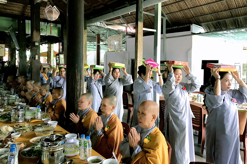 Đúng 10g30, Ni sư trụ trì cùng chư Ni đệ tử, các Phật tử đồng chí thành vân tập tại phương trượng tác bạch cung thỉnh chư Tôn đức Giáo phẩm tỉnh Long An, chư Tôn đức Trưởng-Phó các Ban Trị sự huyện, thị, thành quang lâm trai đường chứng minh Pháp sự.