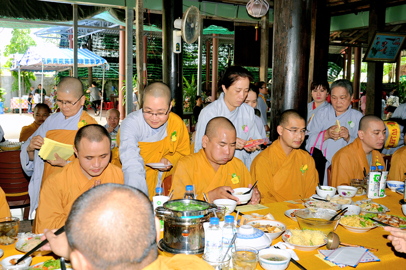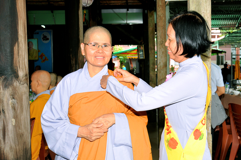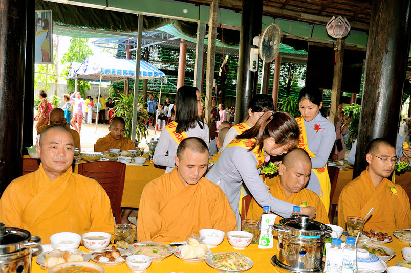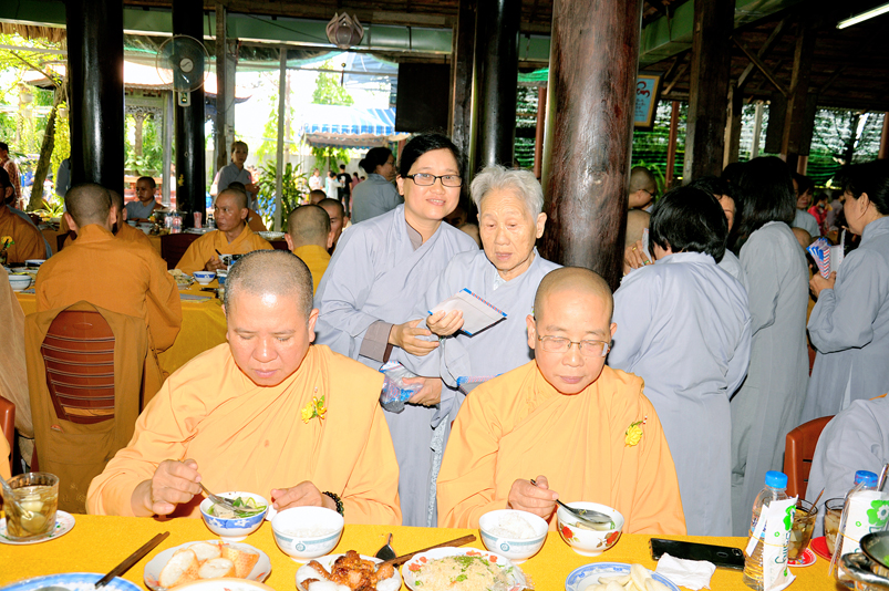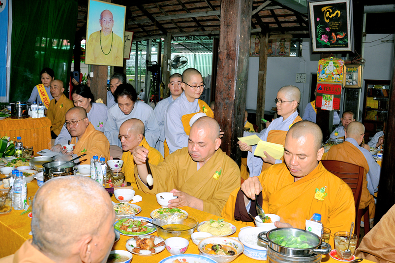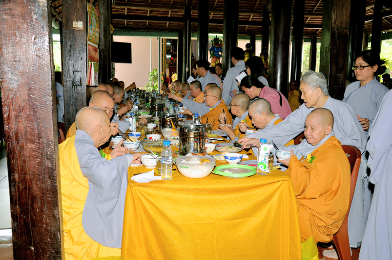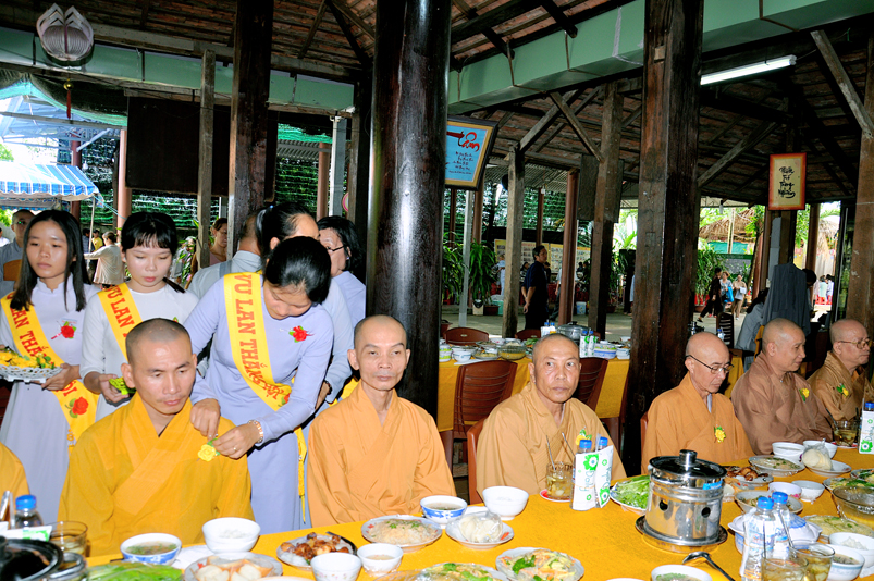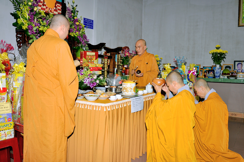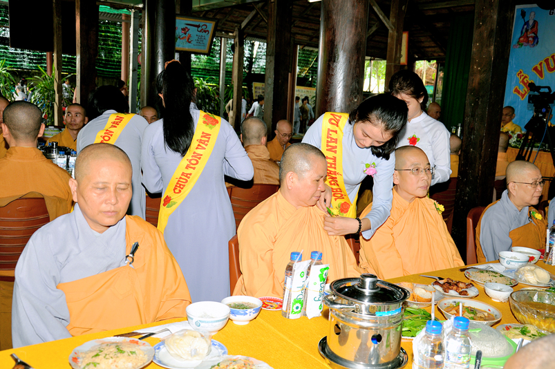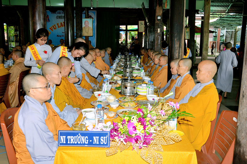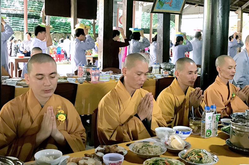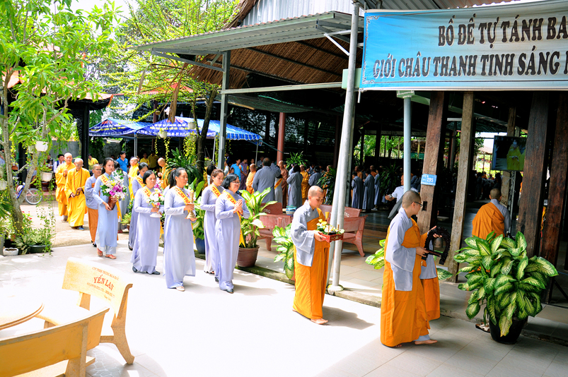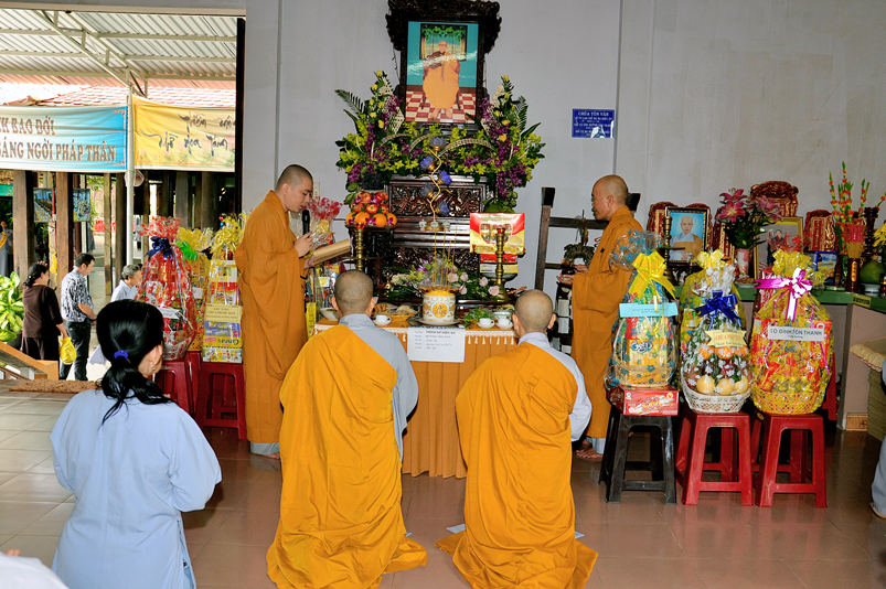 Đúng 10g30, Ni sư trụ trì cùng chư Ni đệ tử, các Phật tử đồng chí thành vân tập tại phương trượng tác bạch cung thỉnh chư Tôn đức Giáo phẩm tỉnh Long An, chư Tôn đức Trưởng-Phó các Ban Trị sự huyện, thị, thành quang lâm trai đường chứng minh Pháp sự.