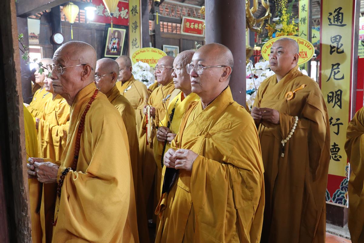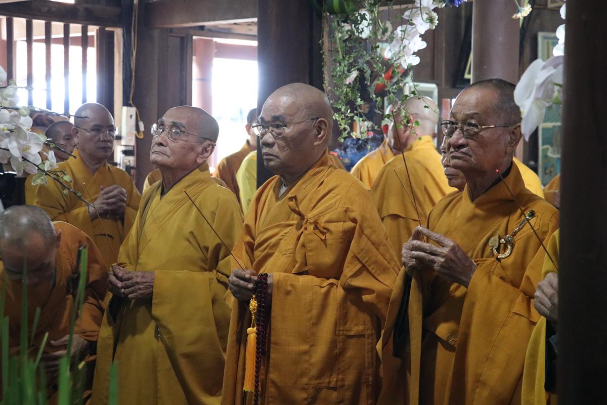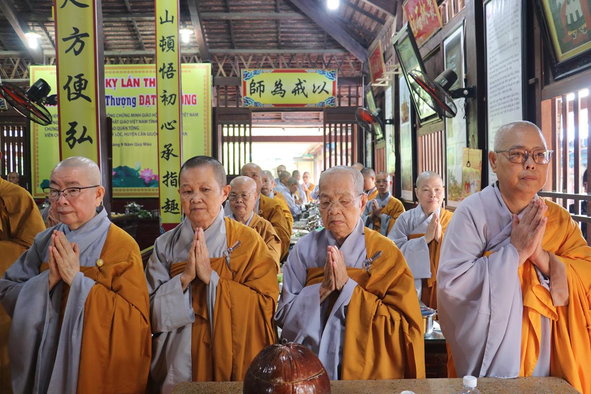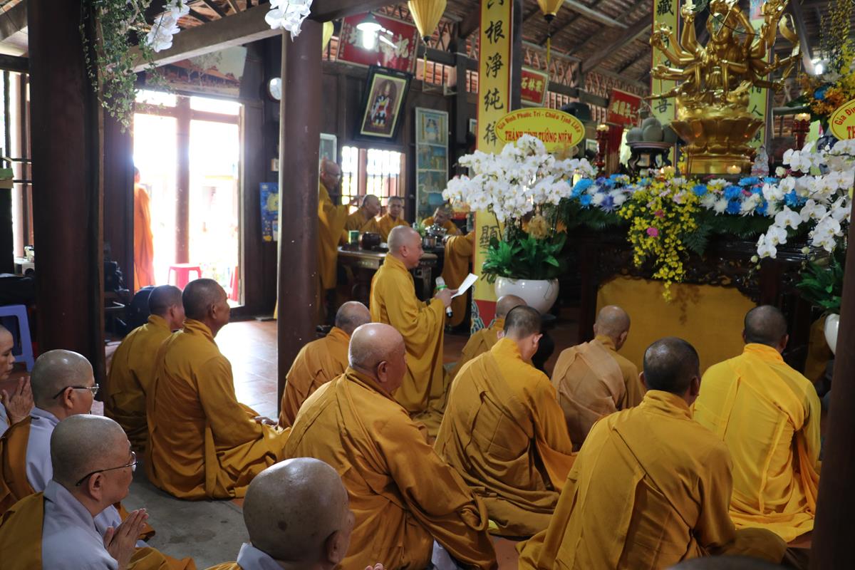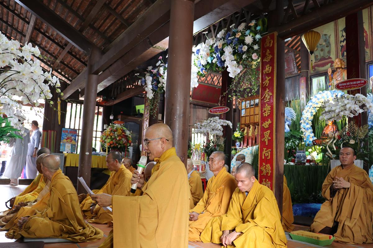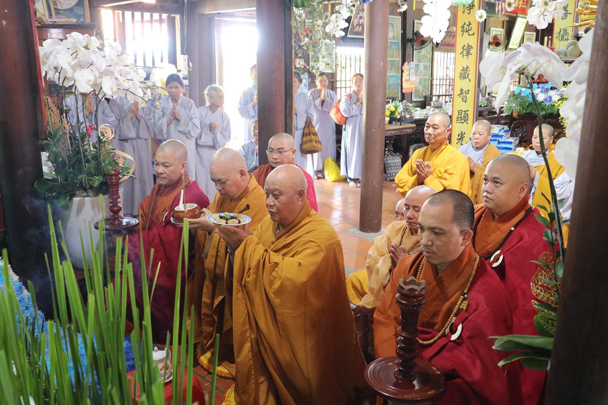 Mở đầu buổi lễ, Chư tôn đức Ban Nghi lễ do Thượng tọa Thích An Tịnh – Phó ban Nghi lễ GHPGVN tỉnh Long An làm sám chủ đã quang lâm bảo điện dâng hương tụng kinh, thực hiện khóa lễ cúng ngọ và tiến hành nghi thức Cung tiến Giác linh. Các nghi thức diễn ra trong không khí trang nghiêm, thành kính. Sau đó là nghi thức dâng hương tưởng niệm Giác linh Cố Trưởng lão Hòa thượng của Chư tôn đức Ban Thường trực BTS GHPGVN tỉnh Long An và Tông phong Thiên Thai Giáo Quán tại Tổ đường do HT. Thích Thiện Tài – Chứng minh BTS GHPGVN tỉnh Long An xướng lễ.