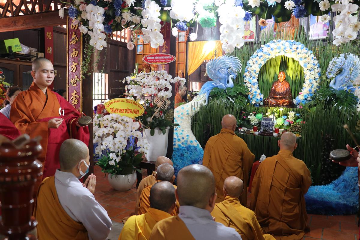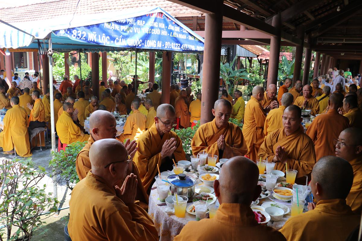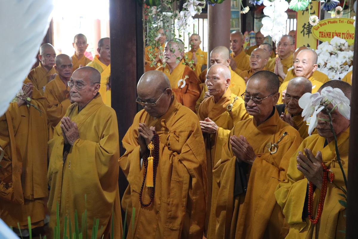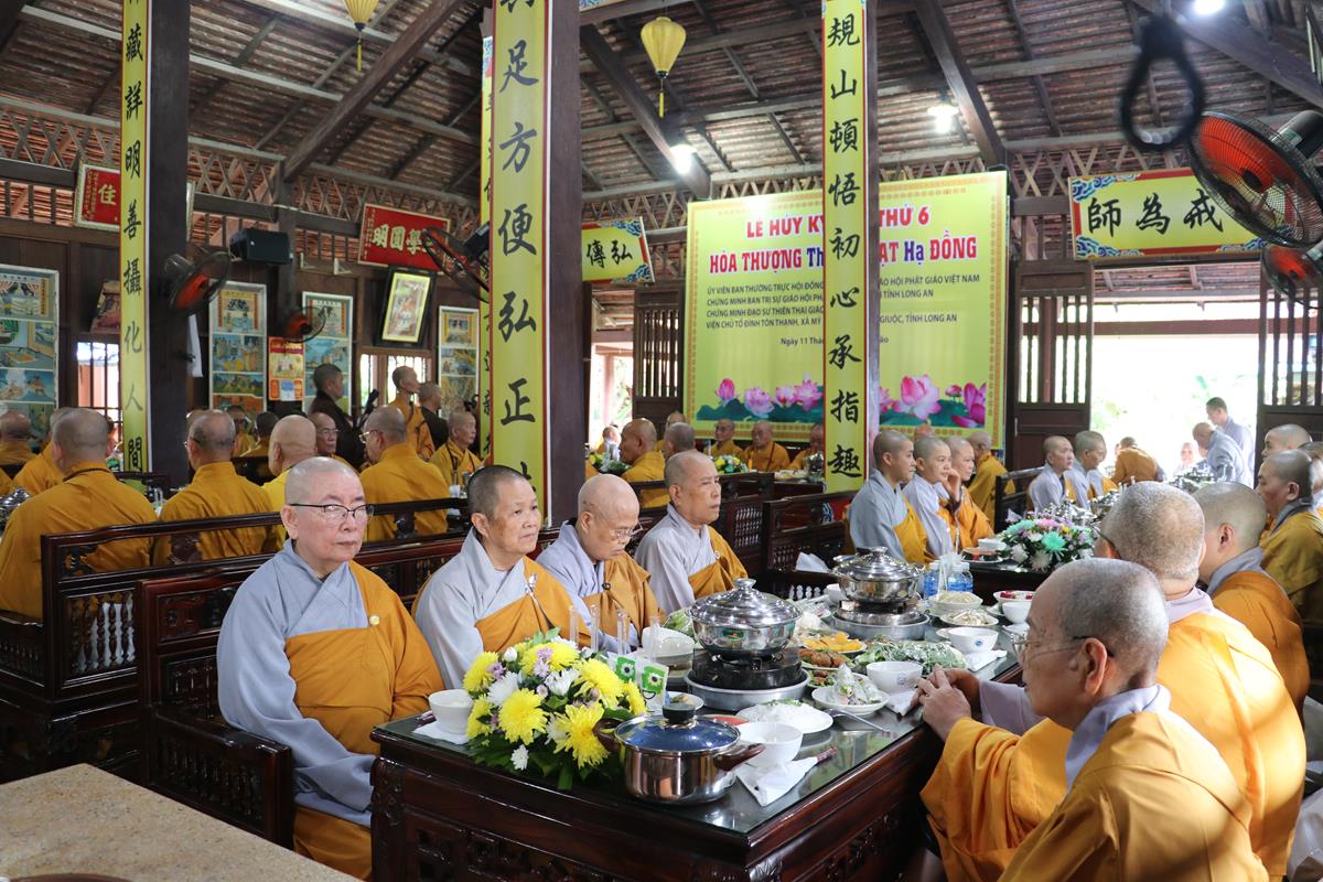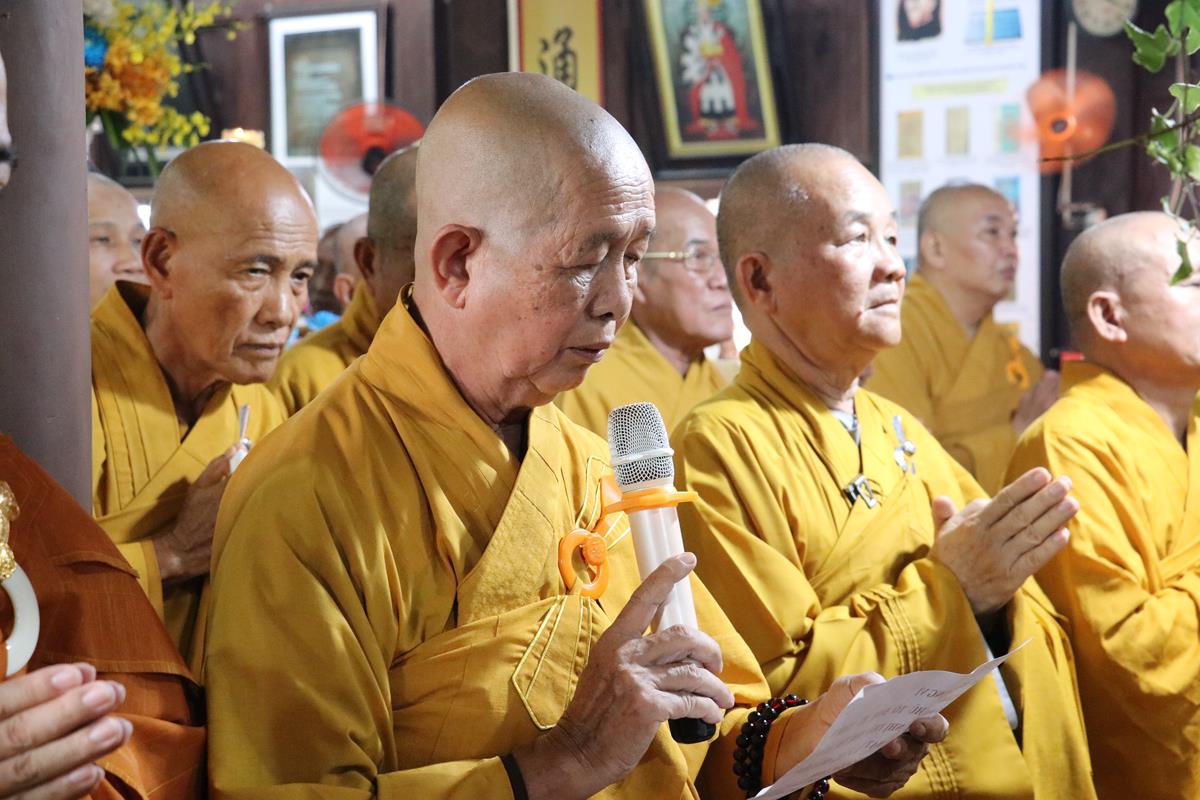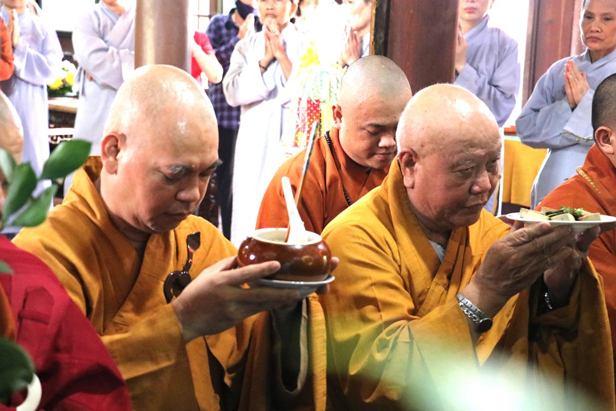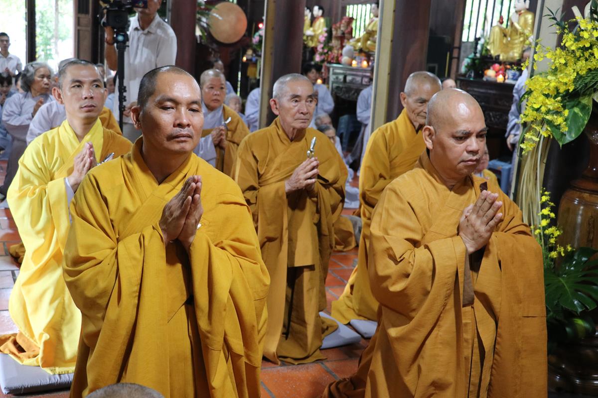Mở đầu buổi lễ, Chư tôn đức Ban Nghi lễ do Thượng tọa Thích An Tịnh – Phó ban Nghi lễ GHPGVN tỉnh Long An làm sám chủ đã quang lâm bảo điện dâng hương tụng kinh, thực hiện khóa lễ cúng ngọ và tiến hành nghi thức Cung tiến Giác linh. Các nghi thức diễn ra trong không khí trang nghiêm, thành kính. Sau đó là nghi thức dâng hương tưởng niệm Giác linh Cố Trưởng lão Hòa thượng của Chư tôn đức Ban Thường trực BTS GHPGVN tỉnh Long An và Tông phong Thiên Thai Giáo Quán tại Tổ đường do HT. Thích Thiện Tài – Chứng minh BTS GHPGVN tỉnh Long An xướng lễ.