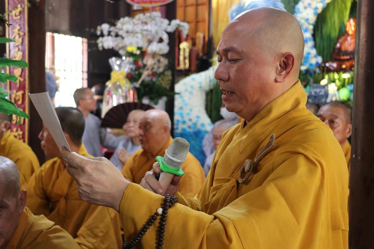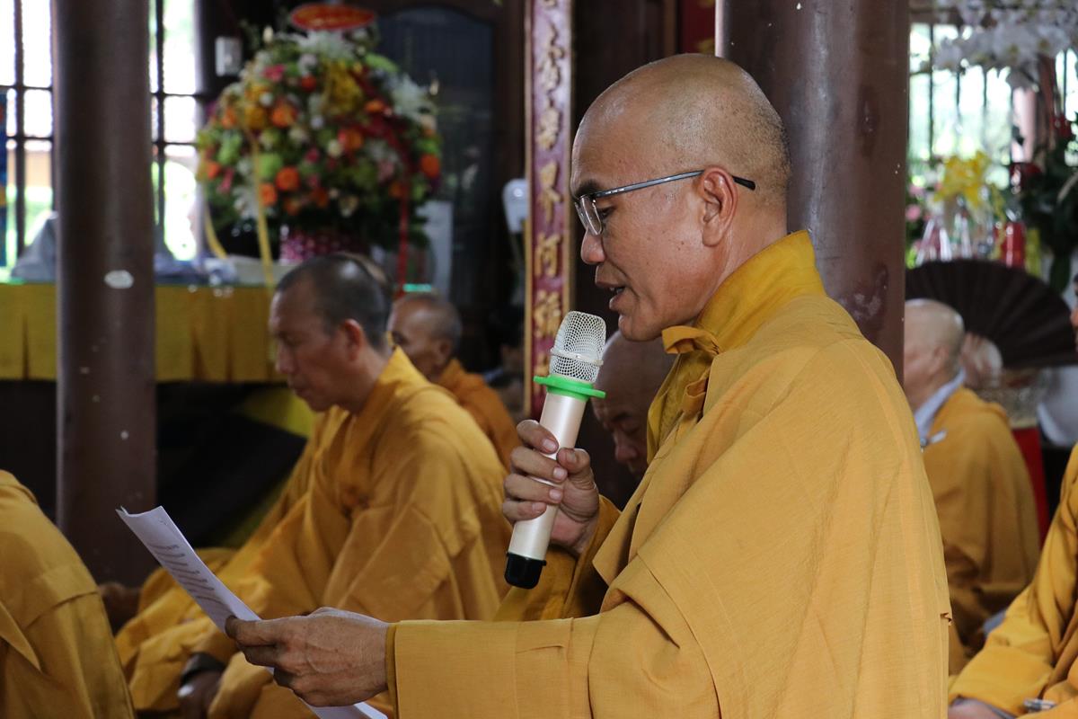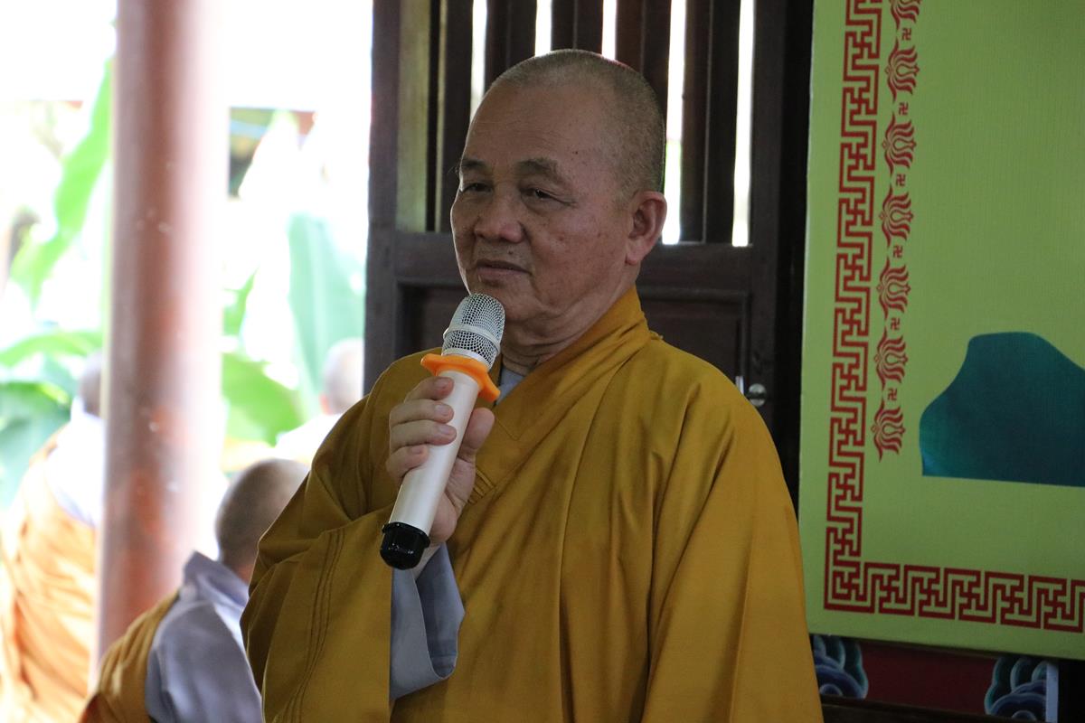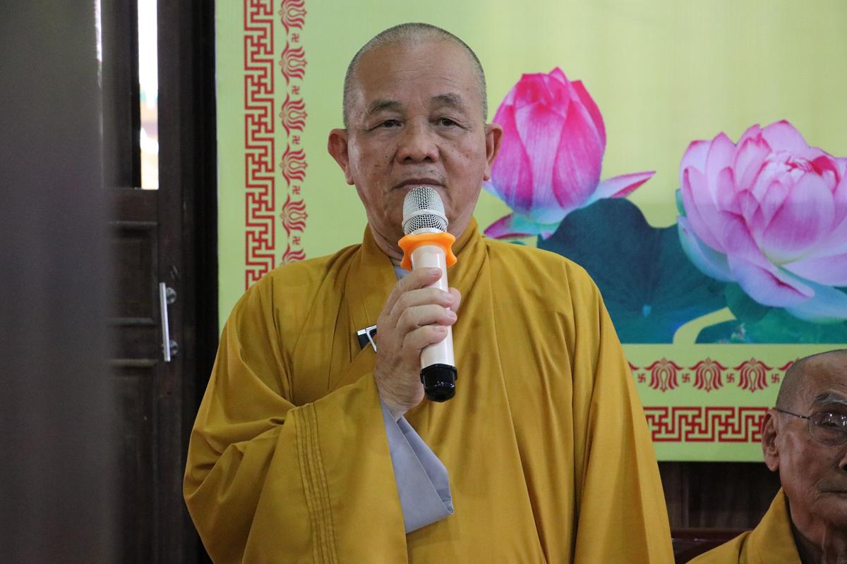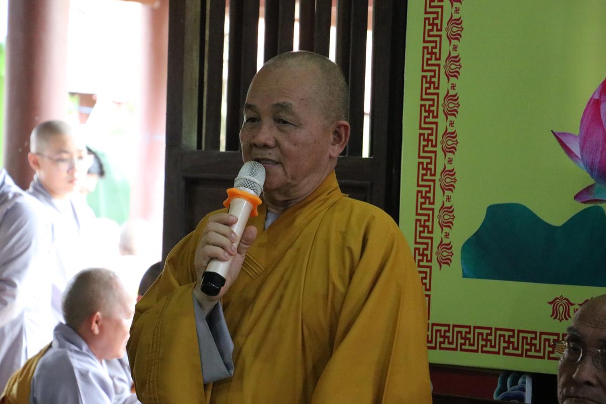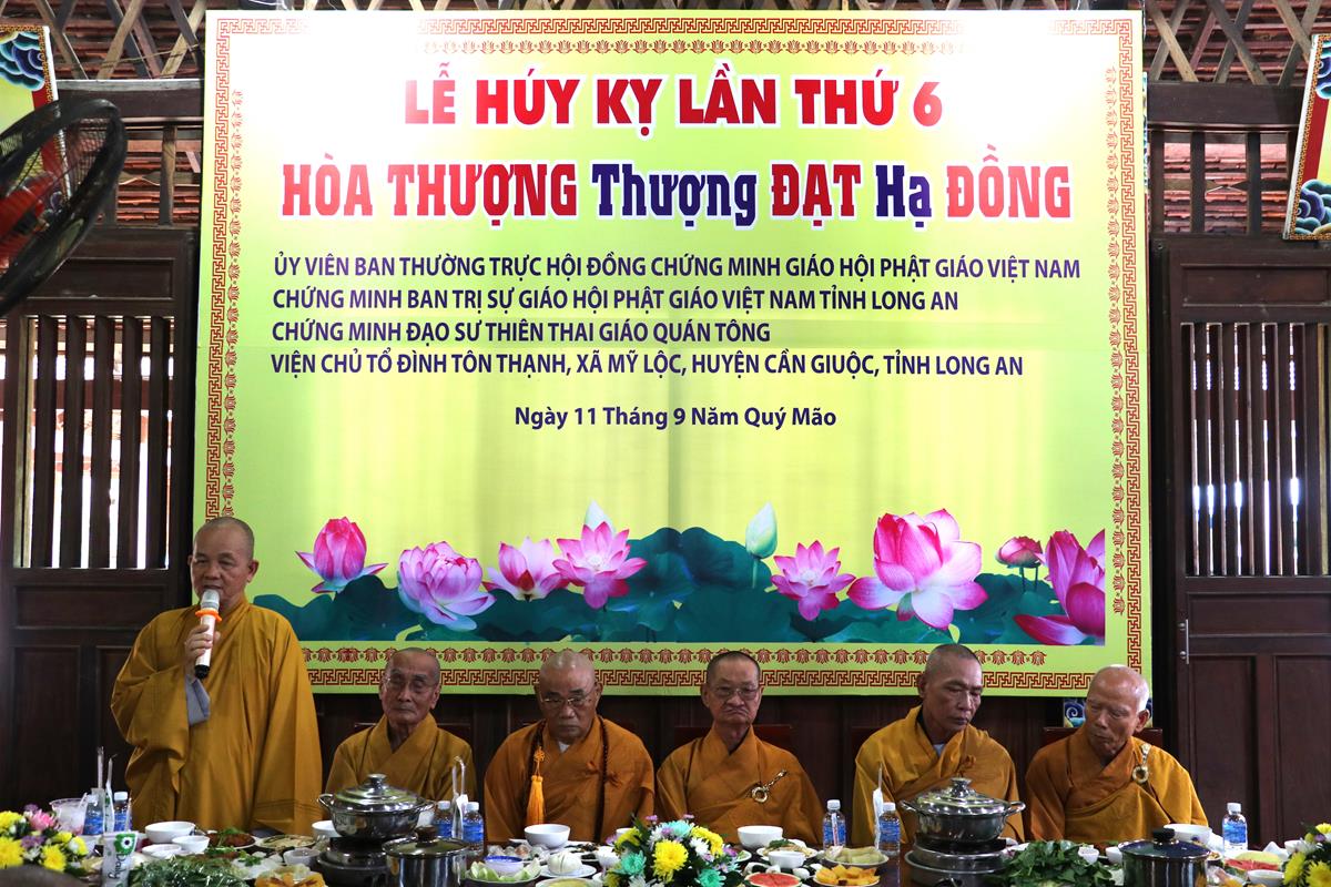 Ban đạo từ tại buổi lễ, HT. Thích Minh Thiện có lời tưởng niệm công ơn sâu dày của Cố Trưởng lão Hòa thượng suốt một đời phụng sự, cống hiến cho Đạo pháp – Dân tộc. Hòa thượng tri ân Chư tôn đức giáo phẩm, chư tôn đức Tăng ni đã nhận lời hứa khả quang lâm về chứng minh cho pháp lễ ngày hôm nay. Hòa thượng tán thán hiếu tâm, hiếu hàng của hàng môn đồ pháp quyến đã thiết lễ húy kỵ trang nghiêm, đúng với tinh thần tri ân – báo ân của Phật giáo. Qua tiểu sử, cố Trưởng lão Hòa thượng luôn đề cao tinh thần tu học, thường xuyên nhắc nhở Tăng ni thông qua lời văn trong Qui Sơn: “Phù xuất gia giả, phát túc siêu phương, tâm hình dị tục, thiệu long thánh chủng, chấn nhiếp ma quân”. Trải qua quá trình học tập, Cố Trưởng lão Hòa thượng theo sự phân công của Giáo hội, thừa hành Phật sự, phát triển nhiều đạo tràng tu học ở những nơi mà Ngài đảm nhận. Đặc biệt, Cố Trưởng lão Hòa thượng hứa khả tham dựHội đồng Thập sự của nhiều giới đàn. Có thể nói rằng, Cố Trưởng lão Hòa thượng là tấm gương sáng cho hàng hậu tấn noi theo. Hòa thượng nhất tâm cung thỉnh Chư tôn đức Chứng minh từ bi niệm Phật hứa khả và gia trì cho Phật sự viên thành, Tông phong vĩnh chấn, Tổ ấn trùng quang.