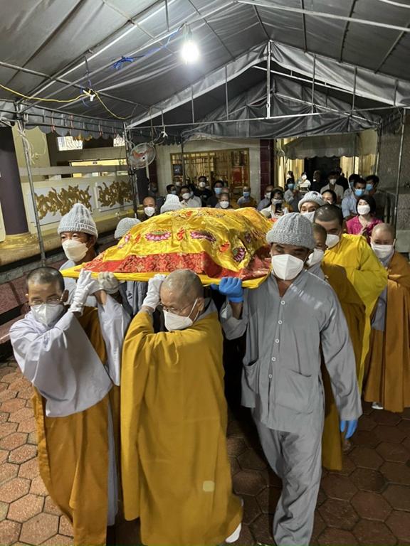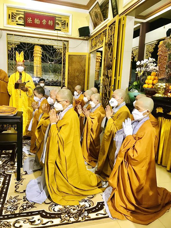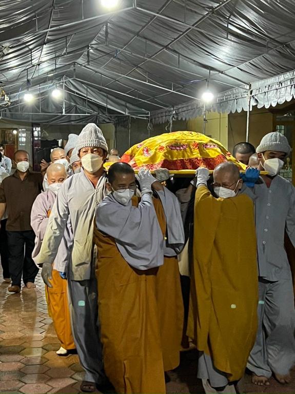 Vào lúc 19 giờ 30 cùng ngày, Ban tổ chức Tang lễ cung đón chư Tôn đức Giáo phẩm Phật giáo tỉnh Long An quang lâm chứng minh. Thành phần chư Tôn đức tham dự gồm có: Hòa thượng Thích Minh Thiện, Ủy viên Hội đồng Trị sự, Phó trưởng Ban Hoằng pháp TW, Trưởng Ban Trị sự GHPGVN tỉnh Long An; Hòa thượng Thích Thiện Tài, Phó ban kiêm Trưởng ban Nghi lễ GHPGVN tỉnh Long An; Đại đức Thích Lệ Duyên, Chánh thư ký Ban Trị sự GHPGVN tỉnh Long An; chư Tôn đức Ban thường trực Ban Trị sự GHPGVN huyện Cần Giuộc; chư Tôn đức Tông phong Thiên Thai Giáo Quán địa phương sở tại; chư Tôn đức chùa Bồ-đề Lan Nhã quận 6, Tp. Hồ Chí Minh cùng các thiện nam tín nữ gần xa đồng câu hội. Do tình hình dịch bệnh Covid-19 vẫn còn đang tiếp diễn nên số lượng người tham dự có phần hạn chế.