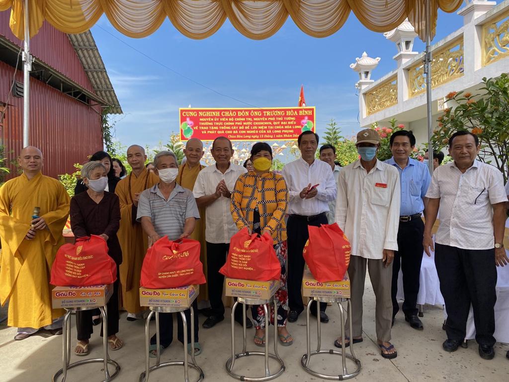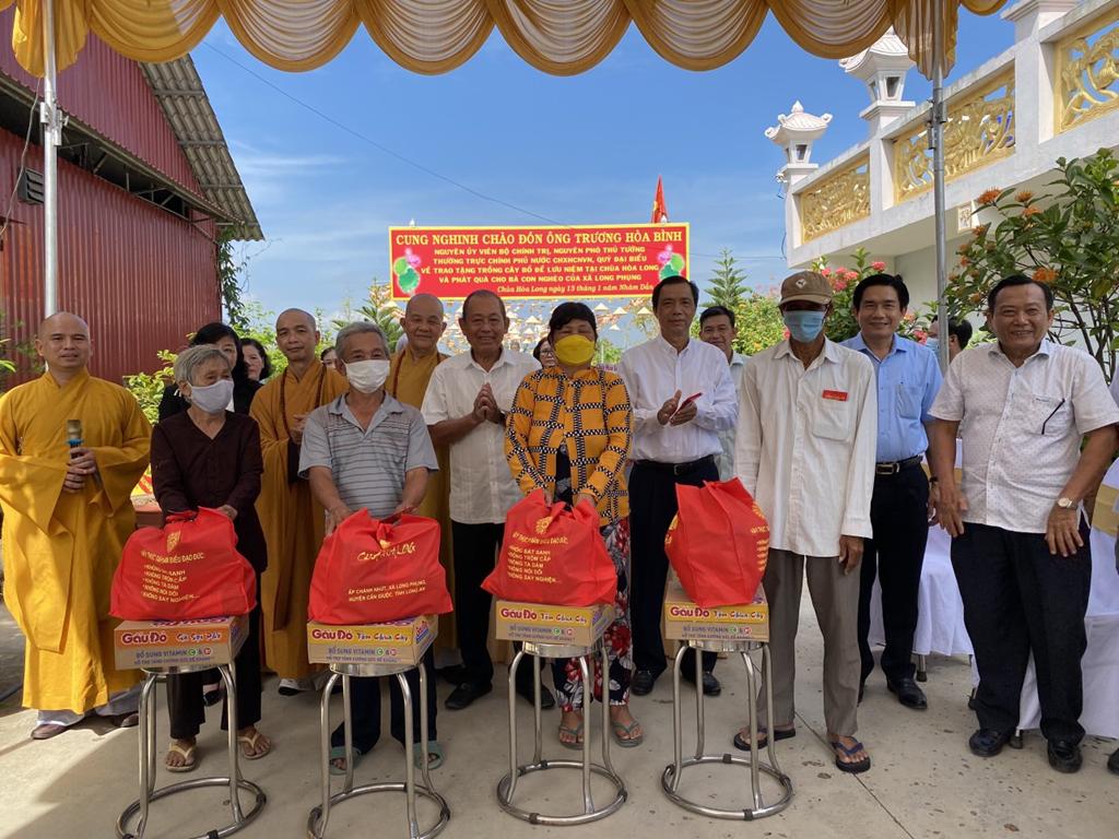 Sau lễ trồng cây Bồ Đề lưu niệm, đoàn tiếp tục trao tặng 100 phần quà cho đồng bào gặp hoàn cảnh khó khăn tại xã Long Phụng. Mỗi phần quà trị giá 500.000 đ do Ông Trương Hòa và chùa Hòa Long vận động.  Đặc biệt, Ông Trương Hoà Bình đã trao tặng 50.000.000đ (năm mươi triệu đồng) cho đại Đức trụ trì để hương hoa cho Phật.